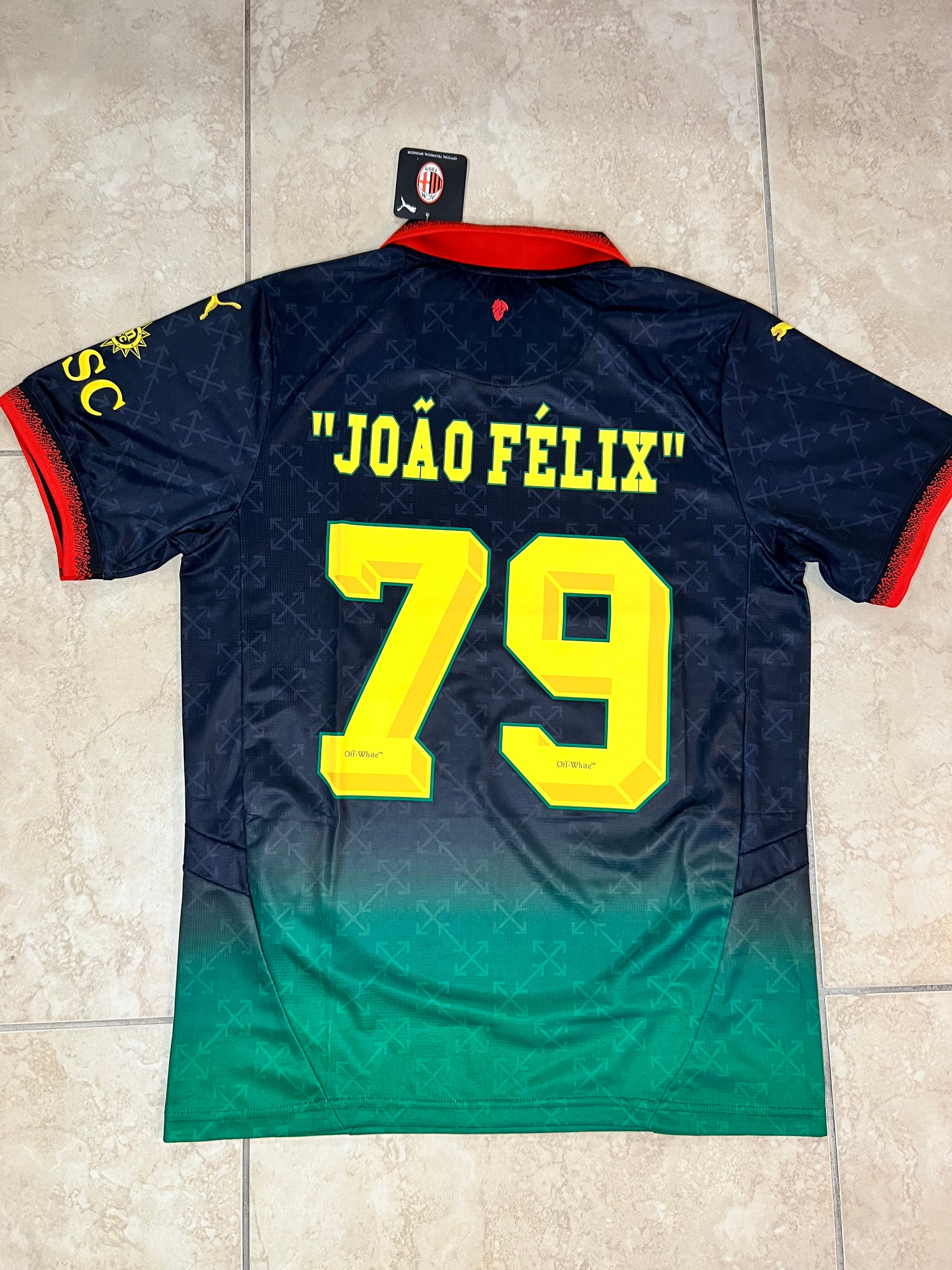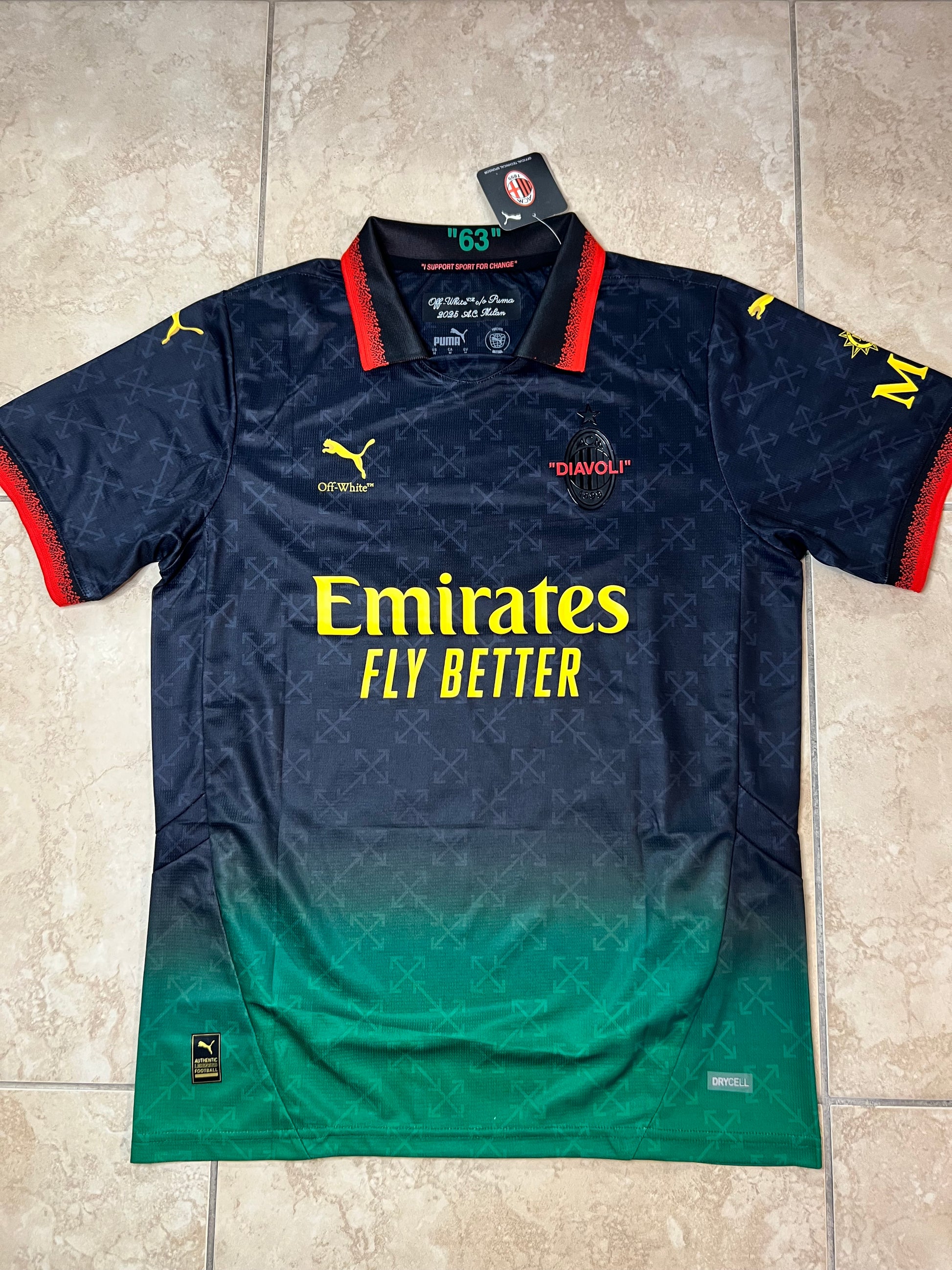 AC Milan's special 2023/24 home shirt in collaboration with Off-White , an exclusive piece that fuses football and urban fashion. It features an innovative design in dark blue with a green gradient and red details, moving away from the traditional to offer a modern and bold style.