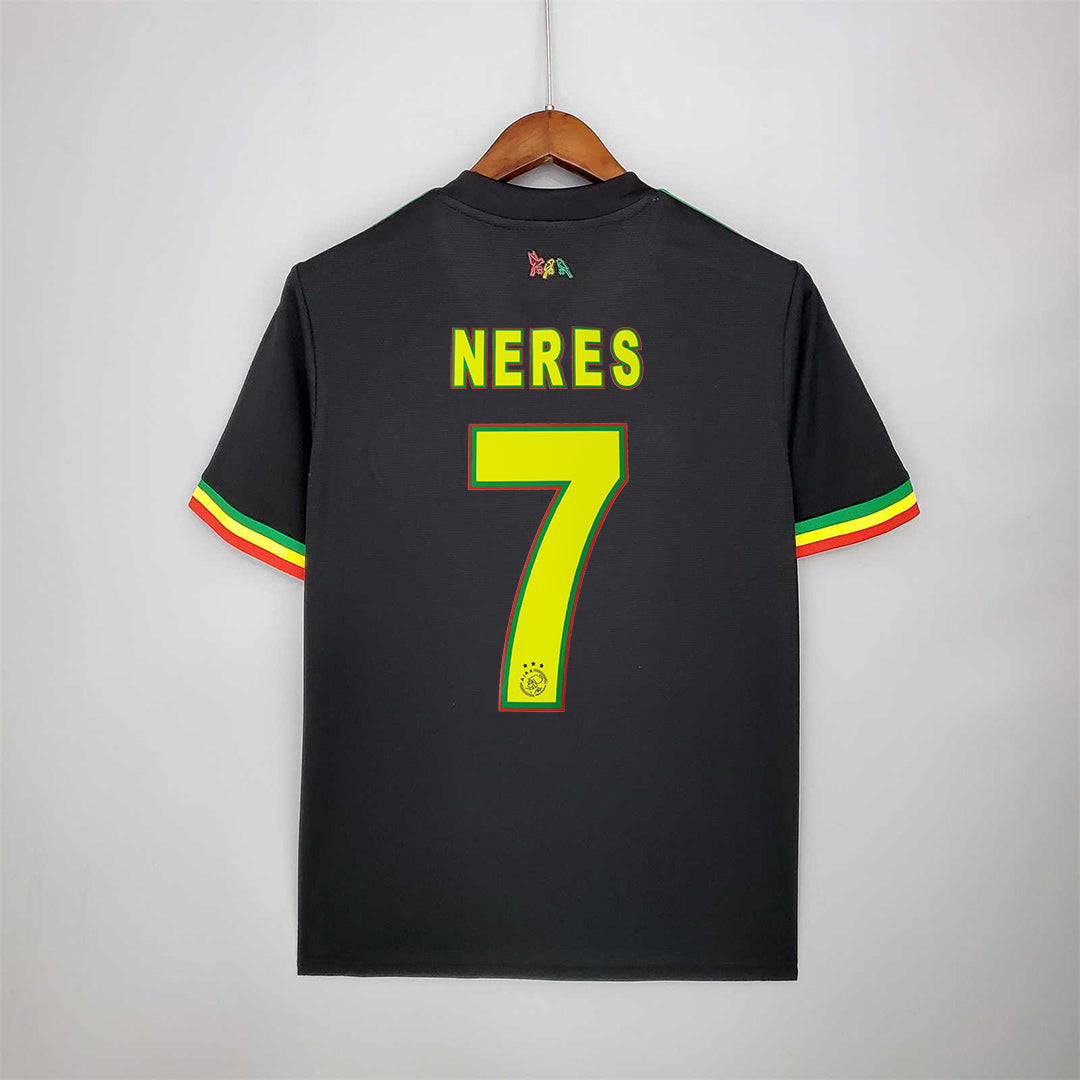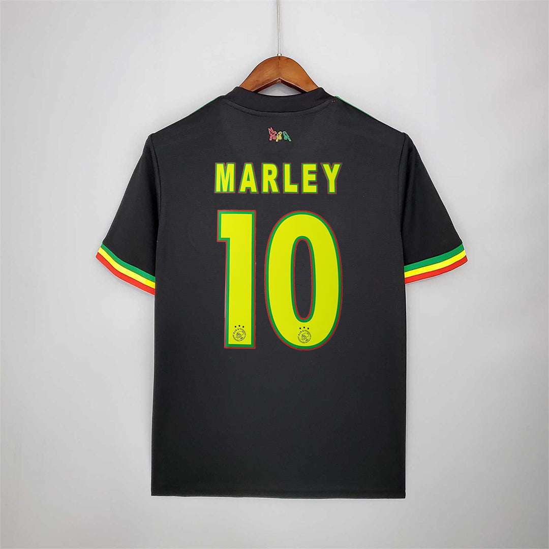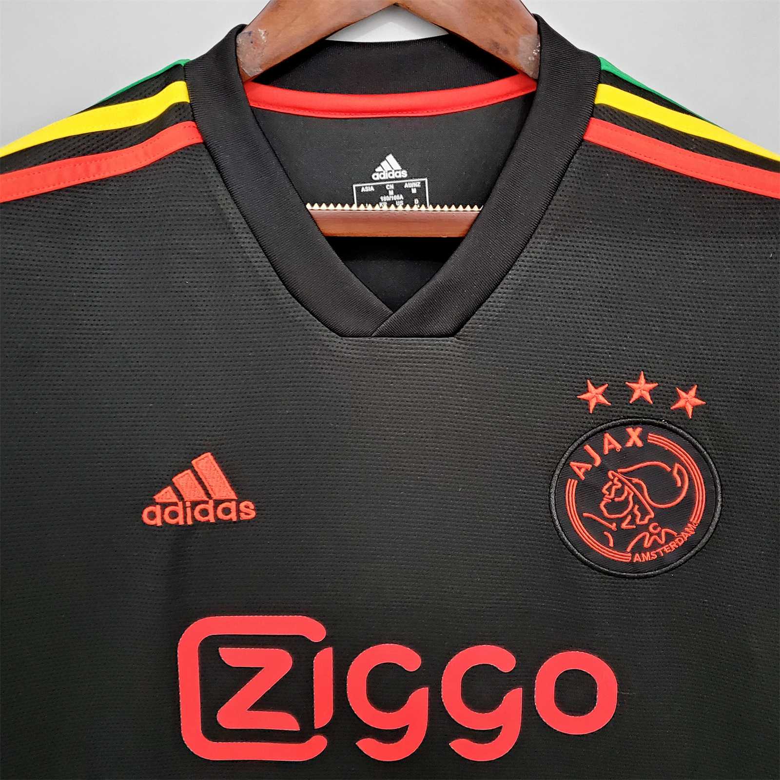 Ajax's 2021/22 special edition fan jersey pays tribute to Bob Marley and the song "Three Little Birds," which has become the club's anthem. The black design is distinguished by details in red, yellow, and green, a symbol of reggae culture and the union of music and football. An iconic jersey that transcended borders and became a collector's item for fans around the world.