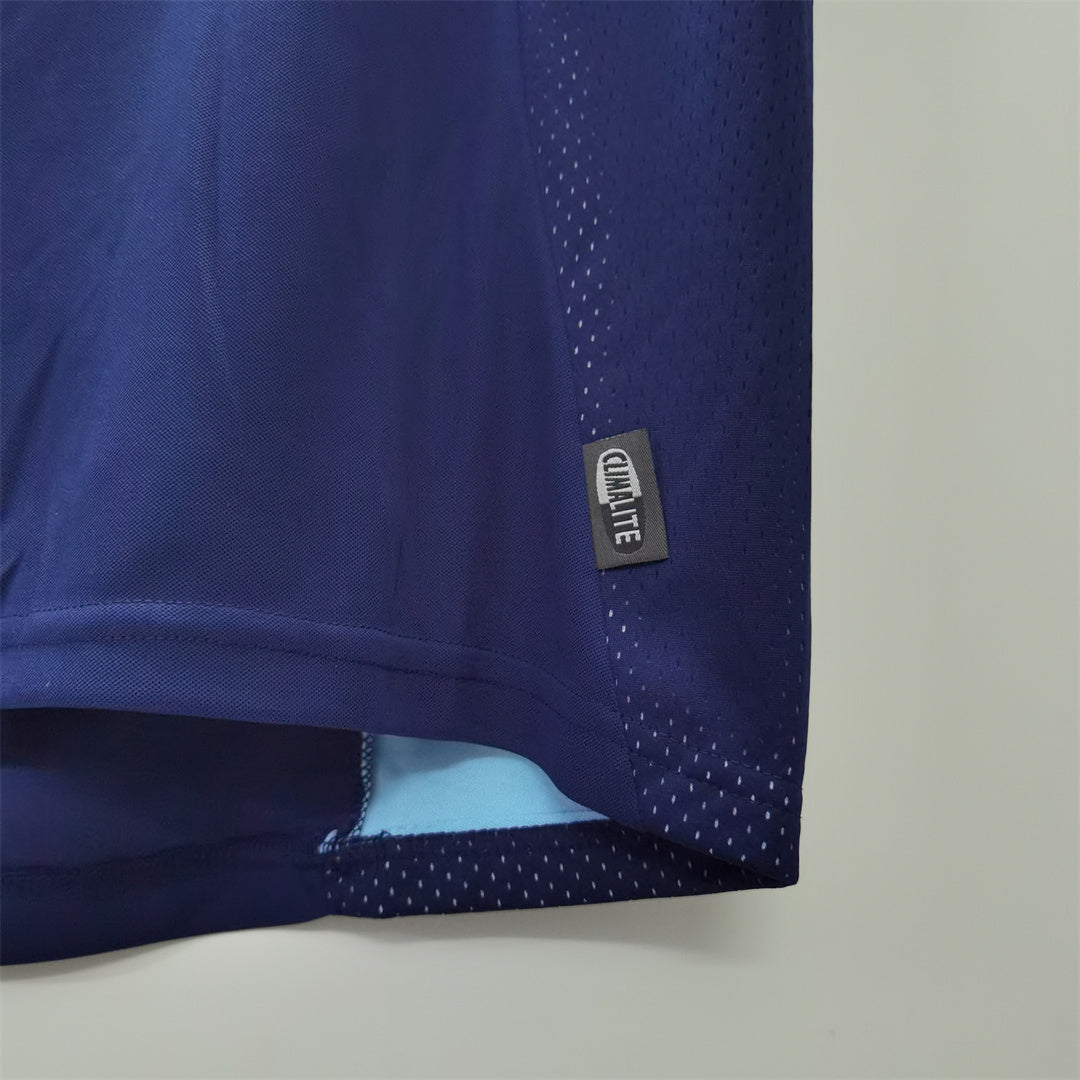 Argentina 2002 away retro jersey, featuring an elegant dark blue design with sky-blue details on the shoulders. Worn in the 2002 World Cup in Korea-Japan, it is remembered by a generation of fans who supported the Albiceleste team led by Verón, Batistuta, and Aimar. A garment with identity and style, ideal for collectors and fans who appreciate classic models from the early 2000s.