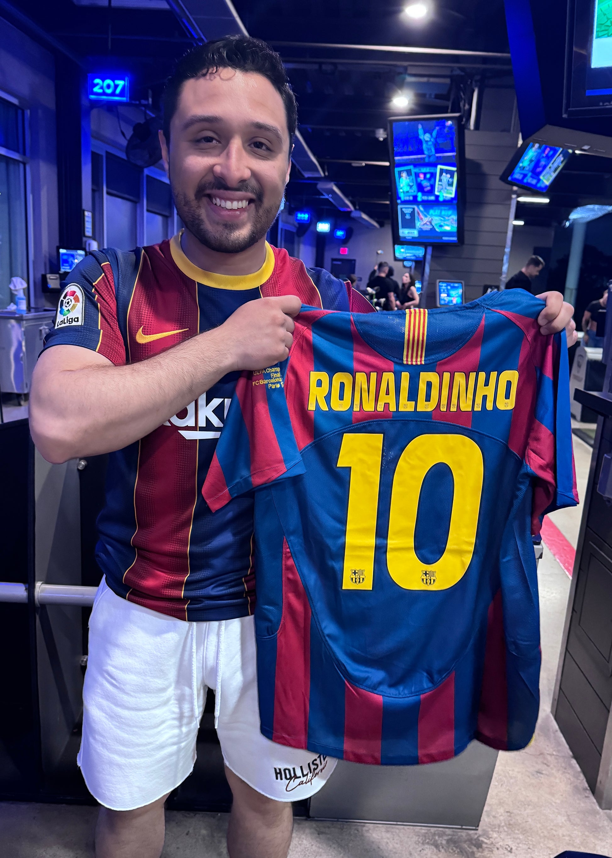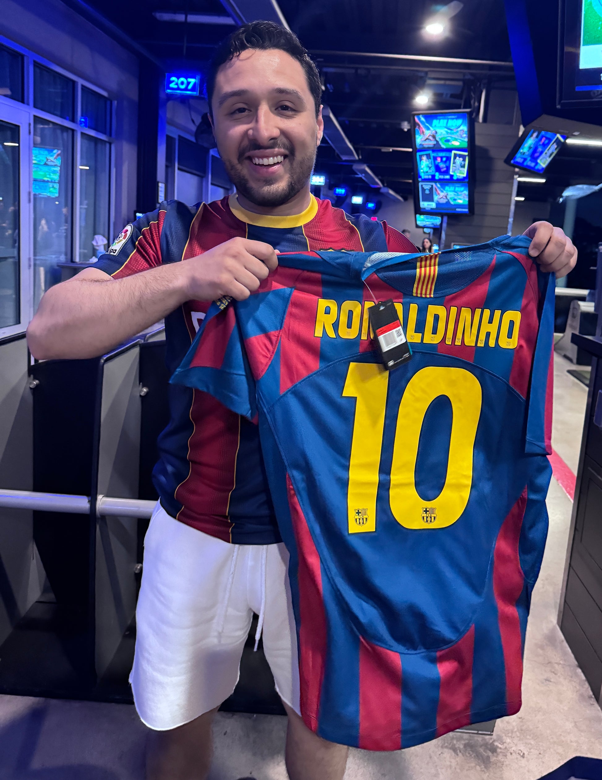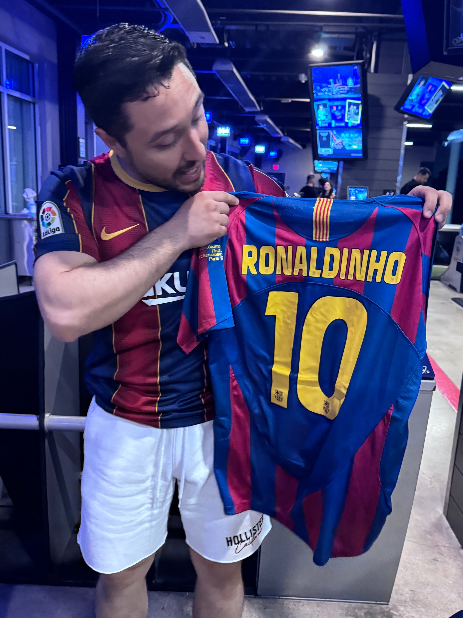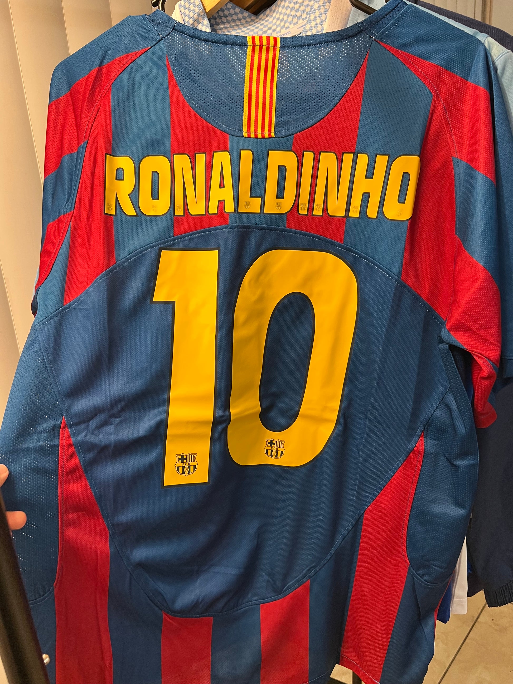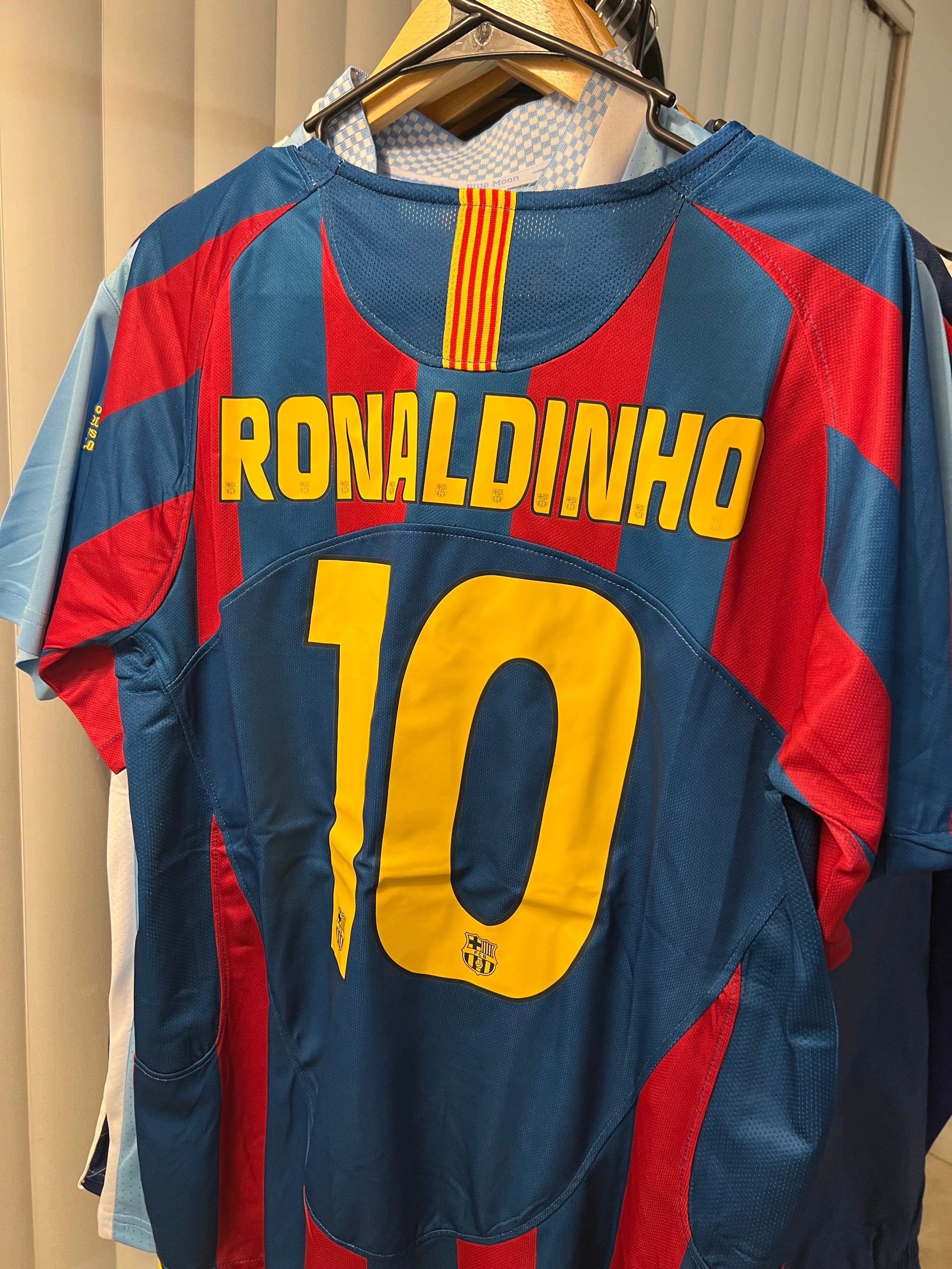 Barcelona 2005/06 retro home shirt, featuring the classic blue and red stripes, representing one of the club's most glorious eras. It was the shirt worn by figures such as Ronaldinho, Samuel Eto'o, Deco, and a young Lionel Messi , during the season in which Barça won the Champions League in Paris against Arsenal and reaffirmed its dominance in Spain and Europe.