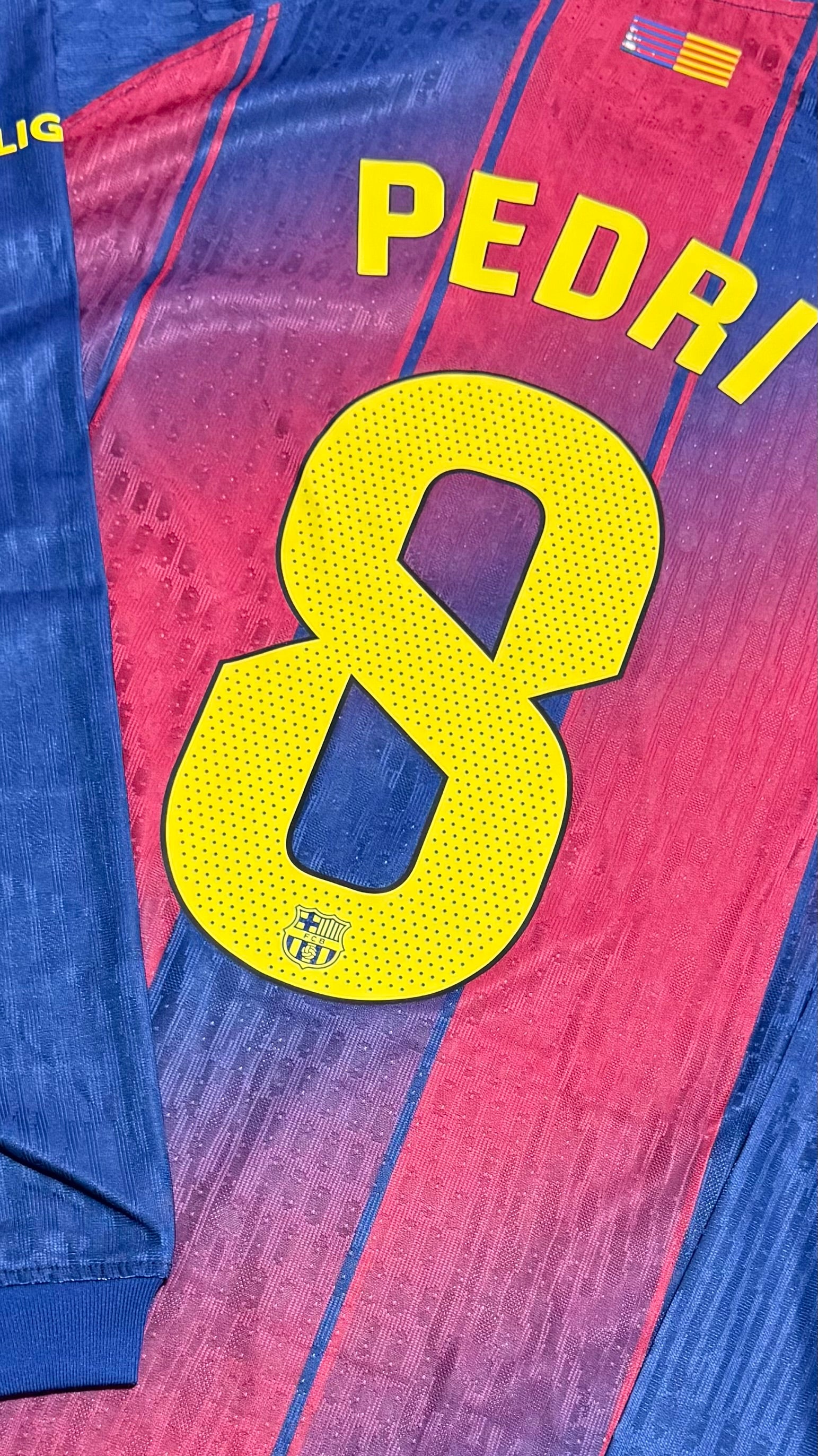 Barcelona 2025/26 home shirt in a long-sleeved player version, featuring the traditional Barça stripes in a revamped design that combines modernity and loyalty to the club's history. The gold details on the crest and trim add an elegant touch that reinforces the Barça identity.
