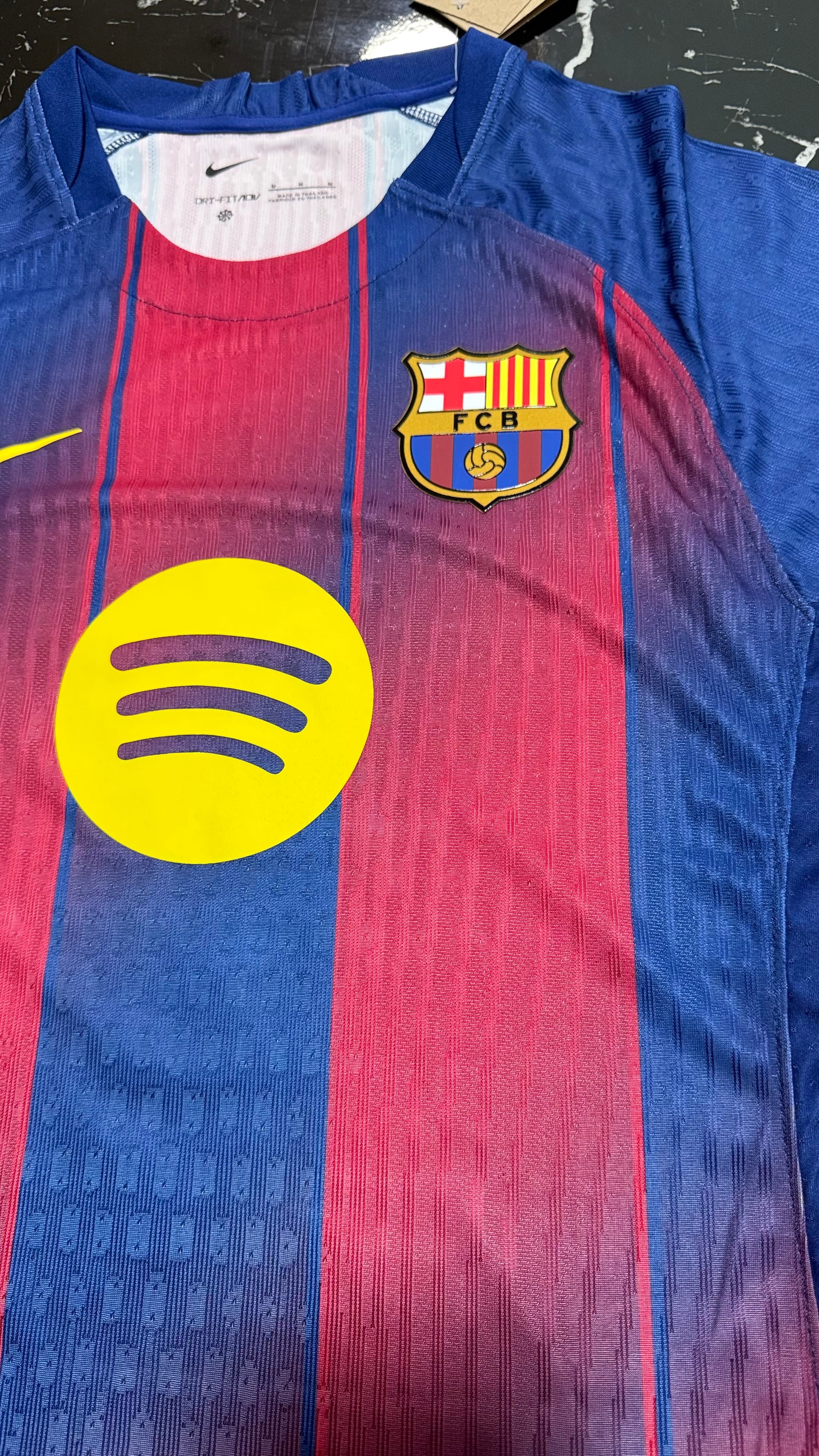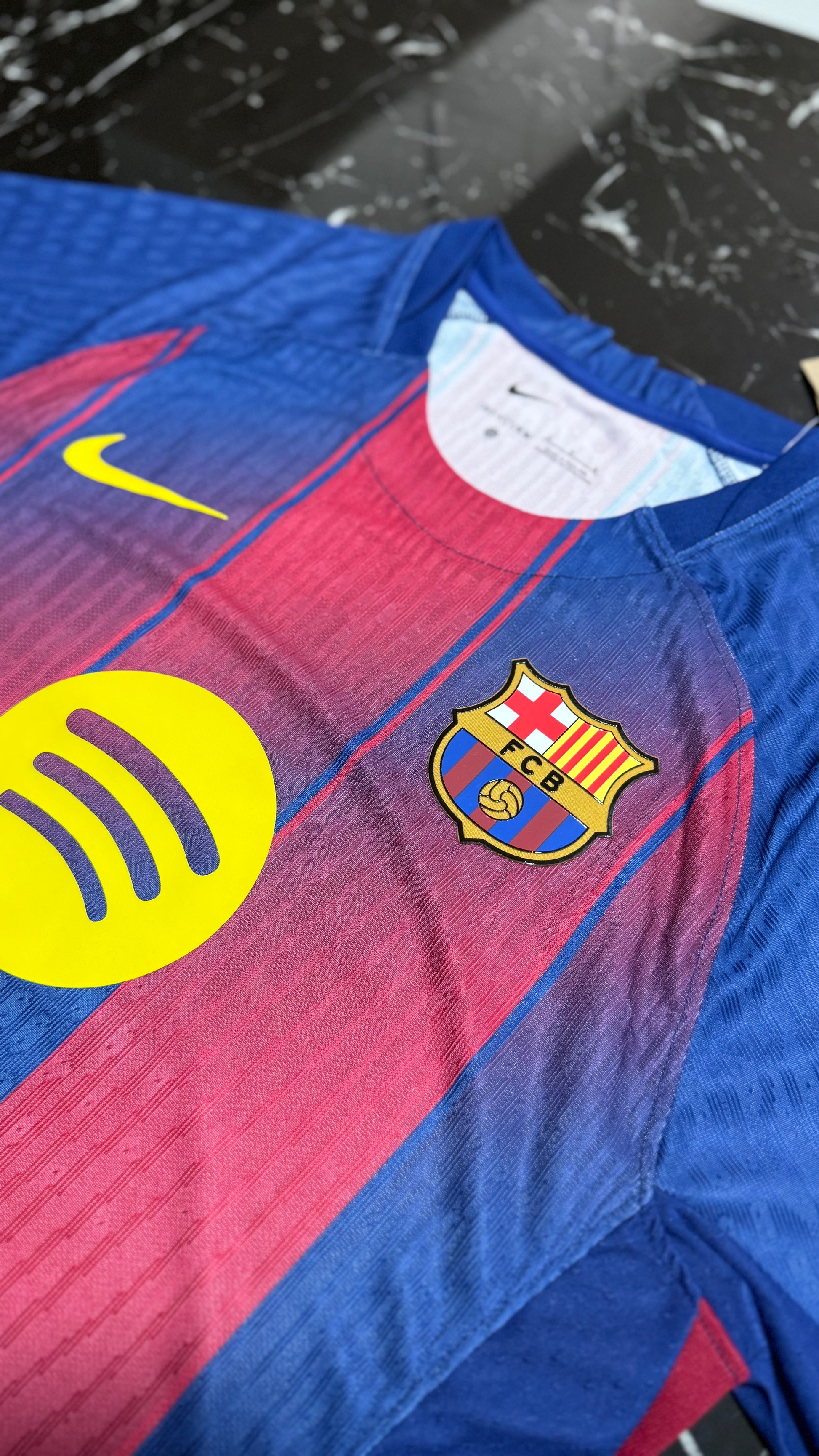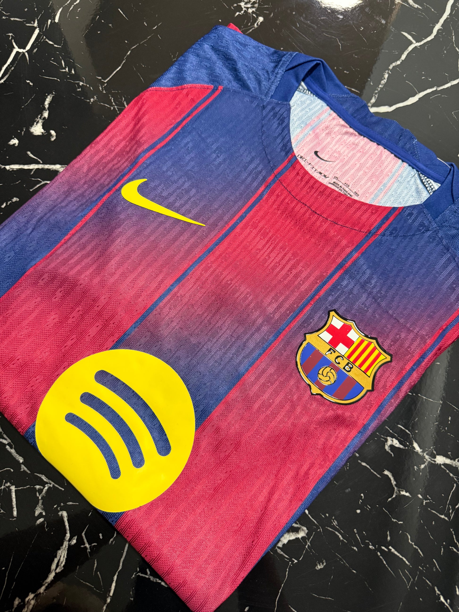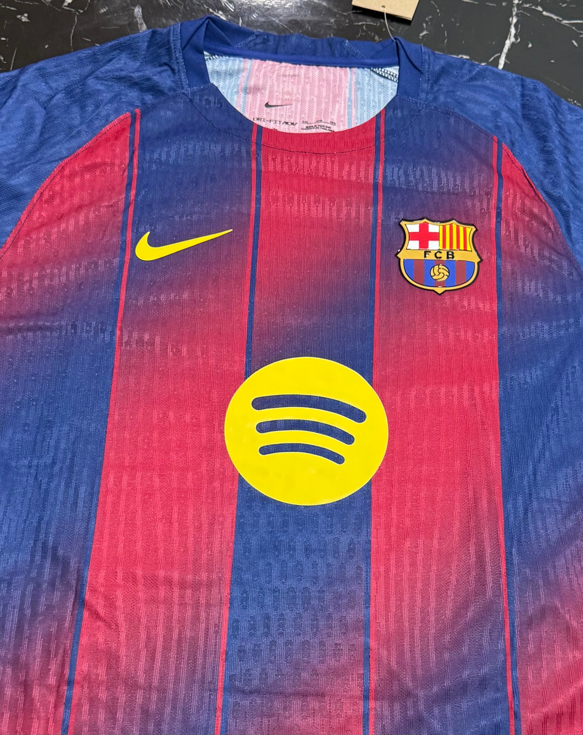 Barcelona 2025/26 home shirt in player version, featuring the classic Barça stripe design that this season incorporates a revamped pattern for a modern feel without losing the club's essence. With gold details on the crest and trim, it conveys the elegance and identity of a team accustomed to shining at Camp Nou and in Europe.