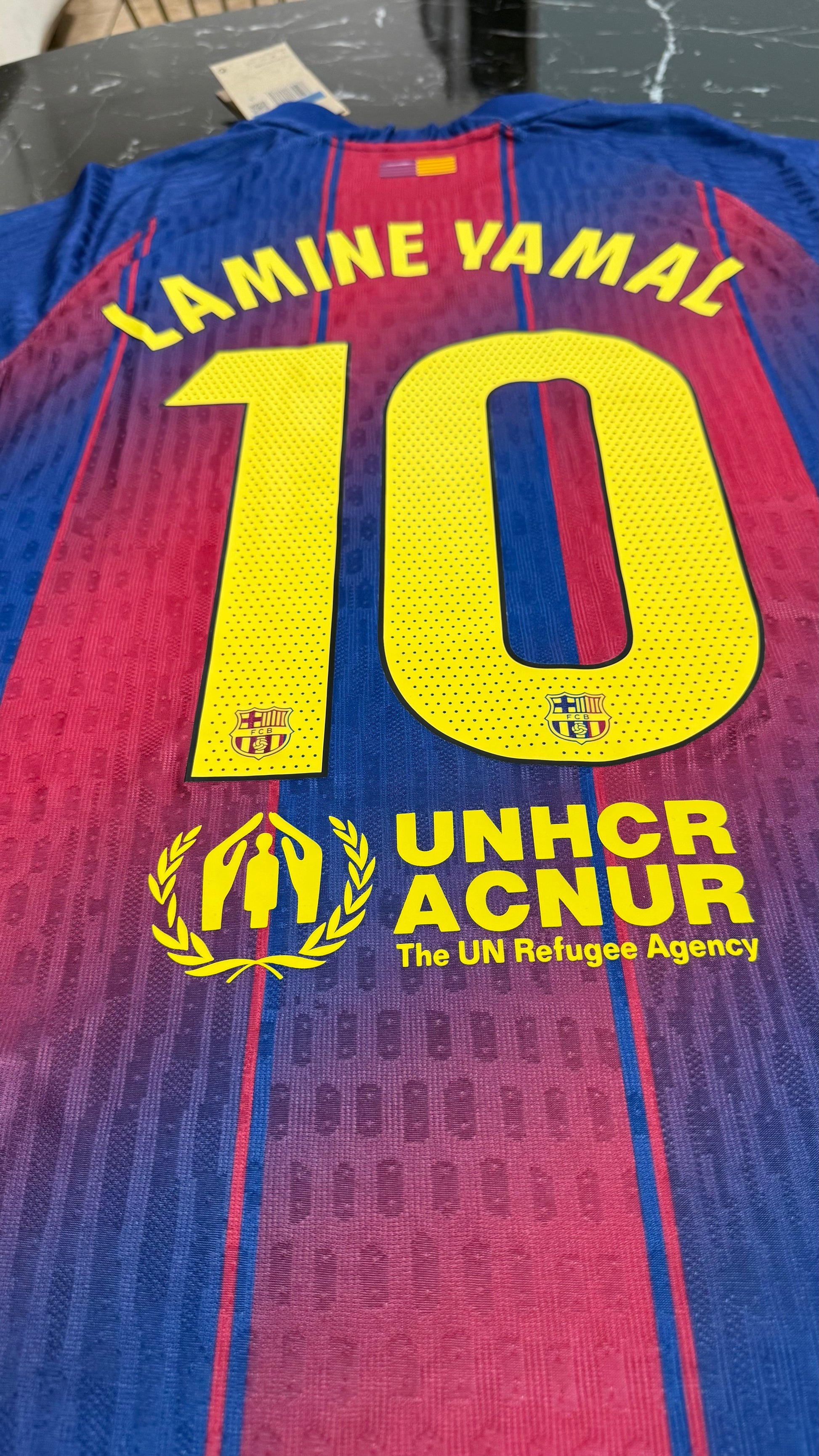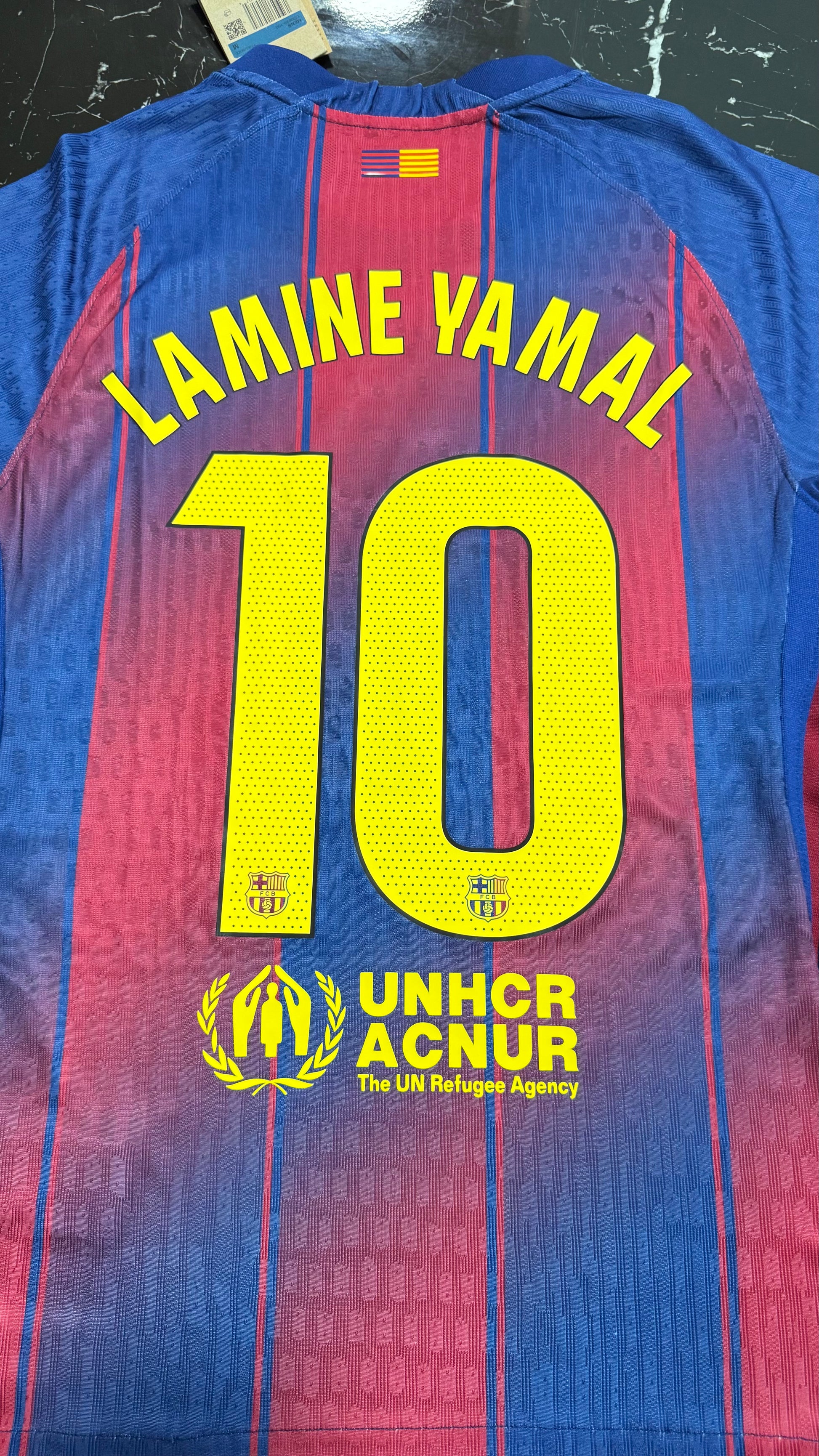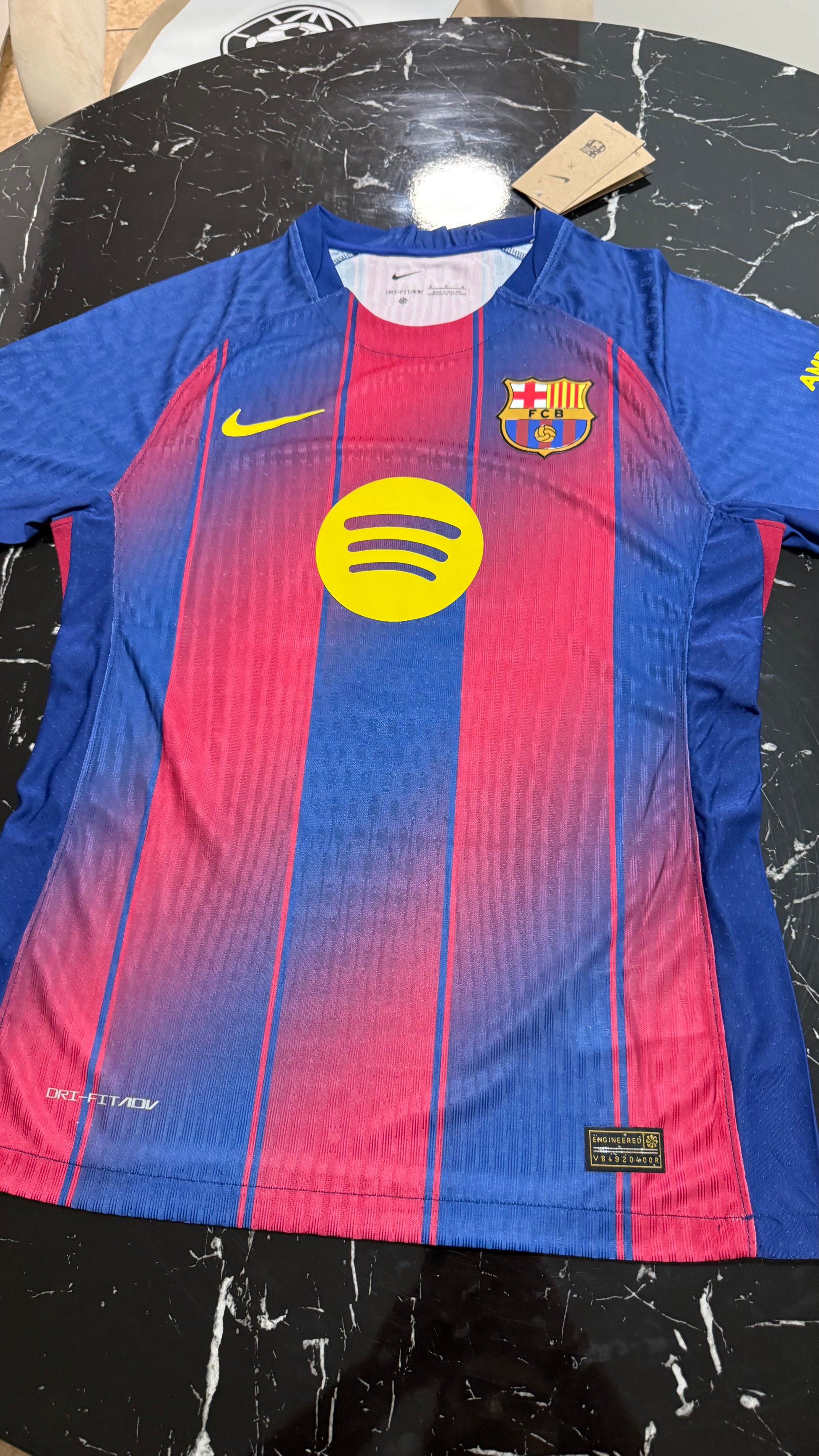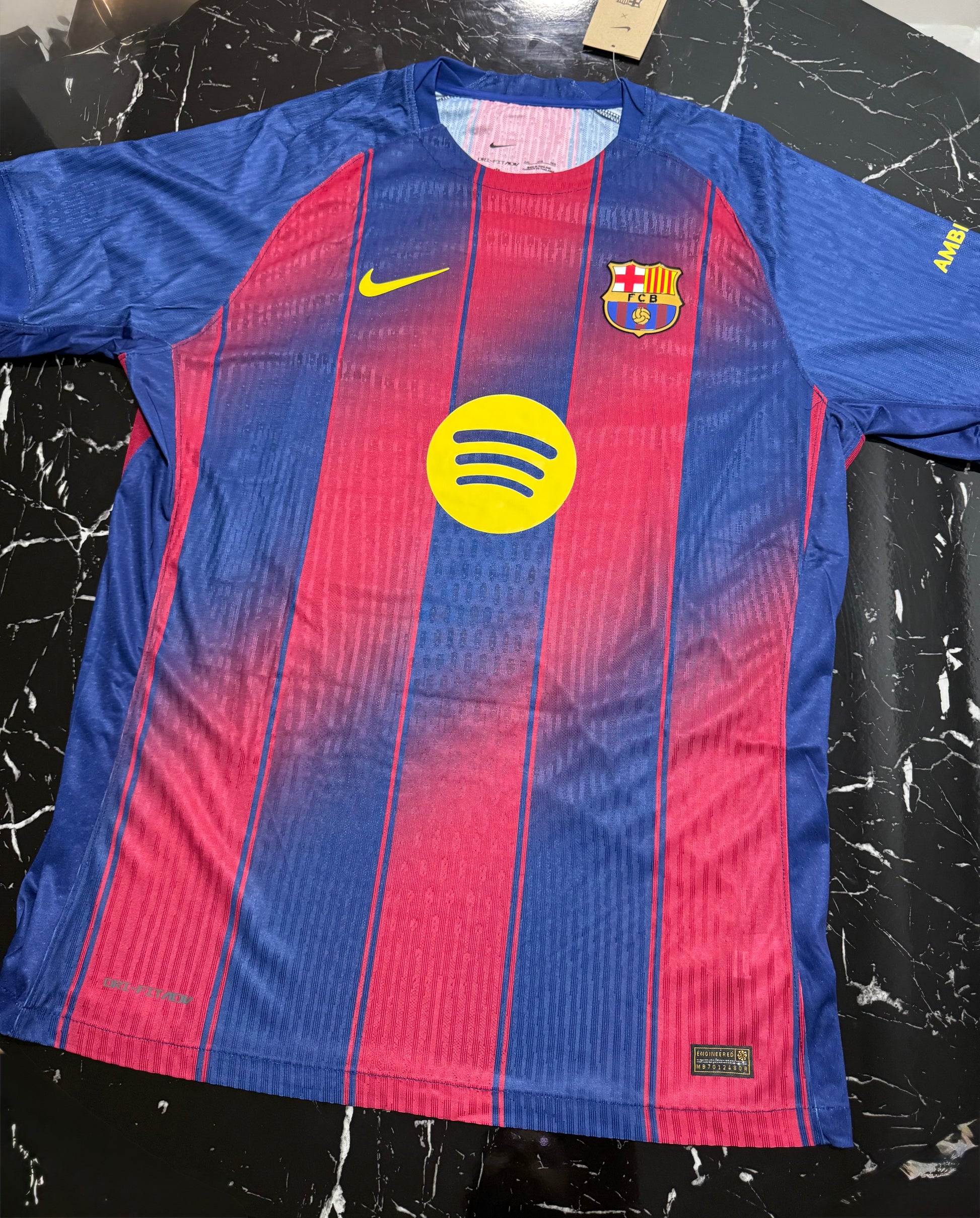 Barcelona 2025/26 home shirt in player version, featuring the classic Barça stripe design that this season incorporates a revamped pattern for a modern feel without losing the club's essence. With gold details on the crest and trim, it conveys the elegance and identity of a team accustomed to shining at Camp Nou and in Europe.