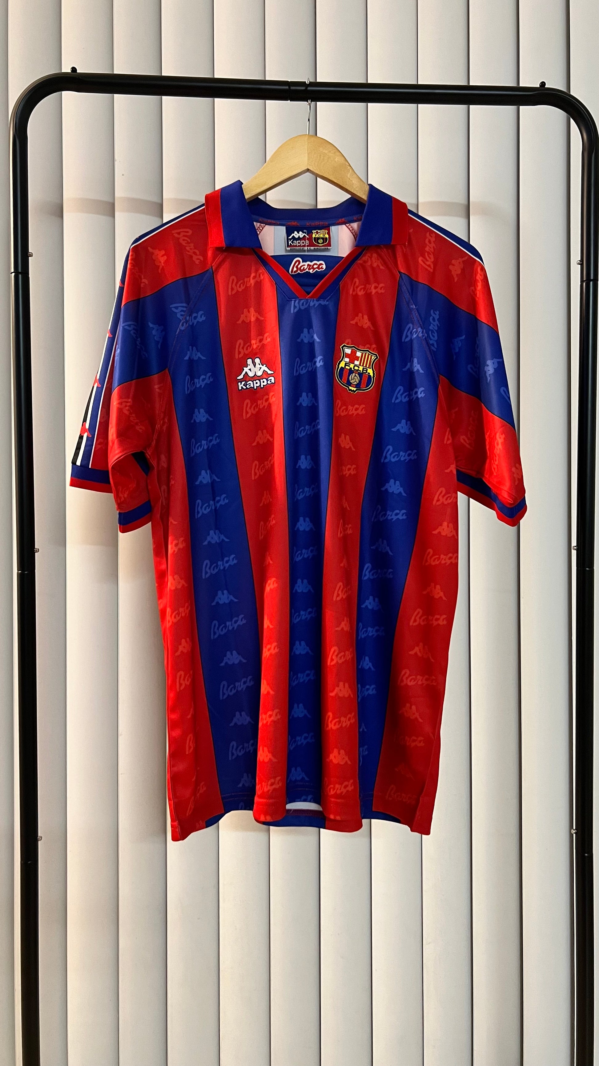 FC Barcelona's 1995/97 home shirt, manufactured by Kappa, features vertical blue and red stripes and the brand's repeated logo within the blue lines. The polo-style collar with red details completes the classic '90s design.