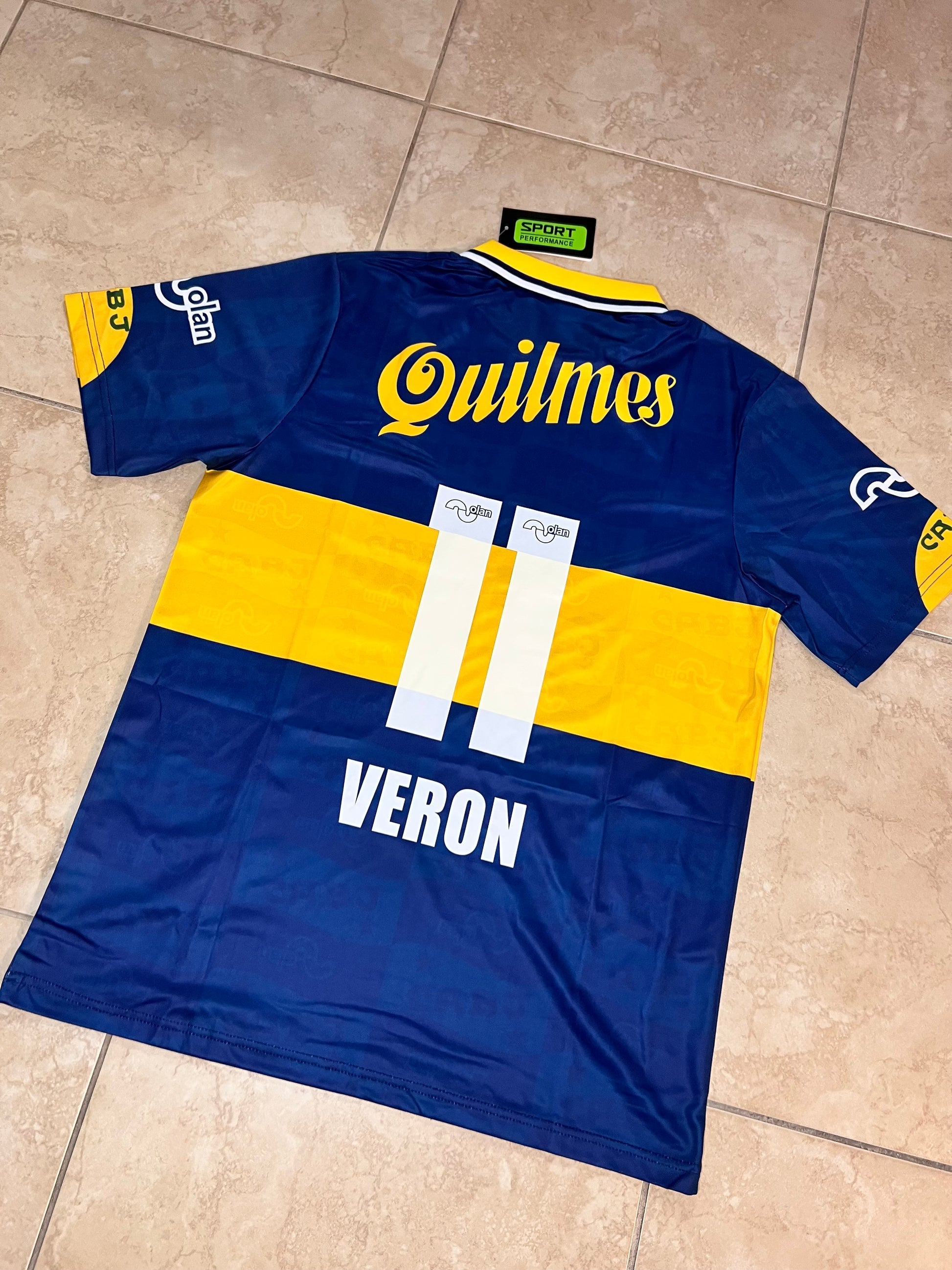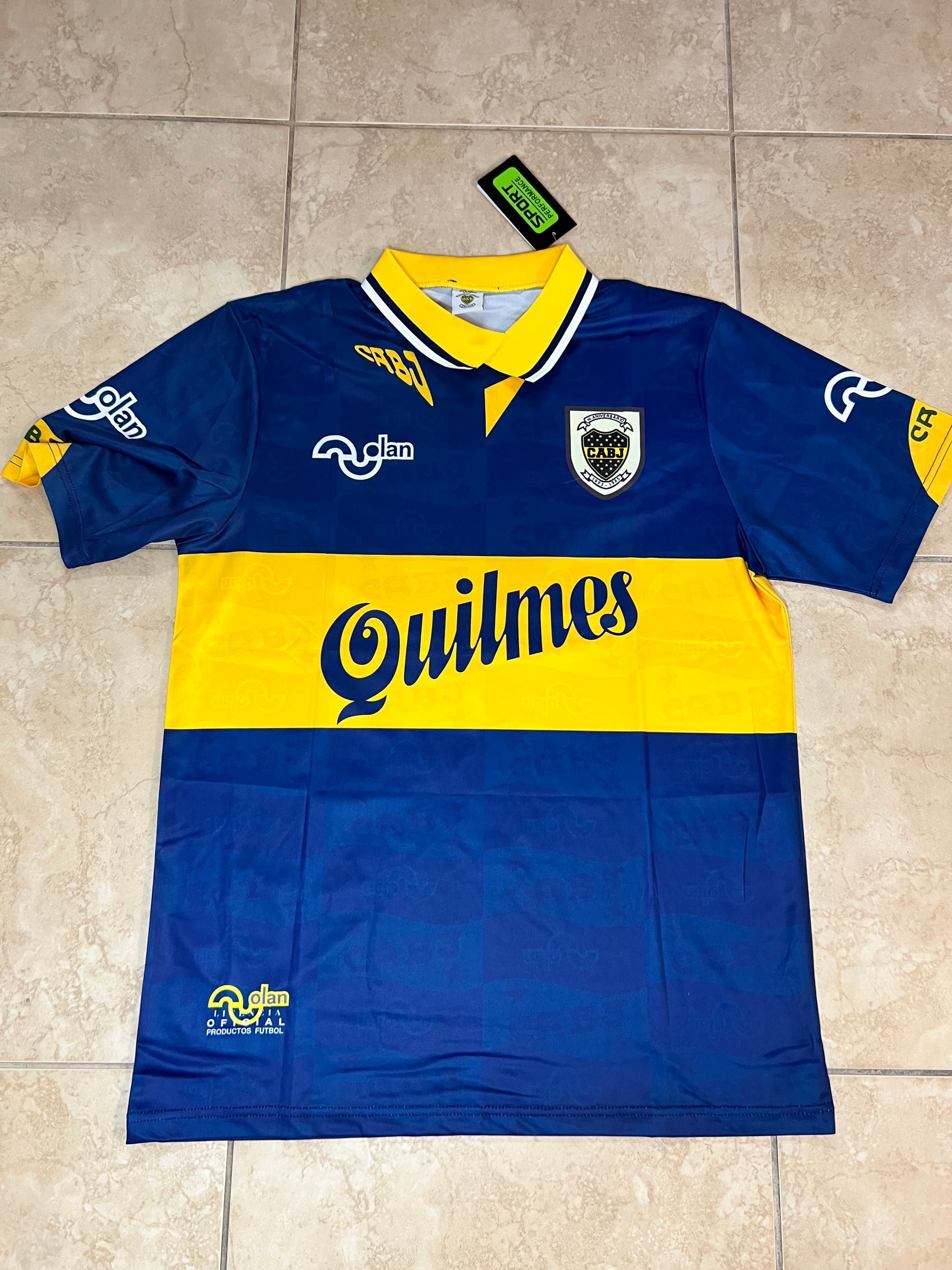 Boca Juniors' 1995/96 retro jersey, featuring the classic blue design and yellow stripe across the chest, sponsored by Quilmes and manufactured by Olan. It's remembered for its yellow polo-style collar with a button and for accompanying the club to the 1995 Apertura Tournament, where players such as Claudio Caniggia, Juan Sebastián Verón, and Sergio "Manteca" Martínez shone.