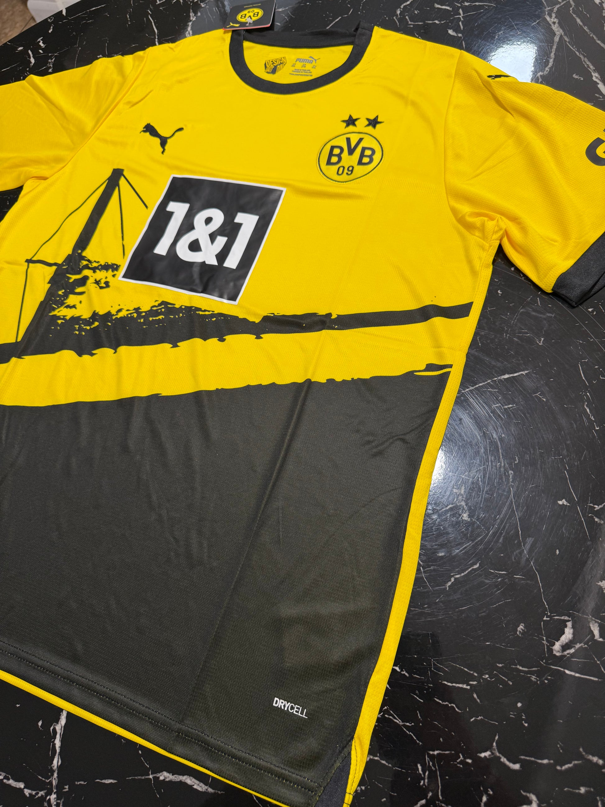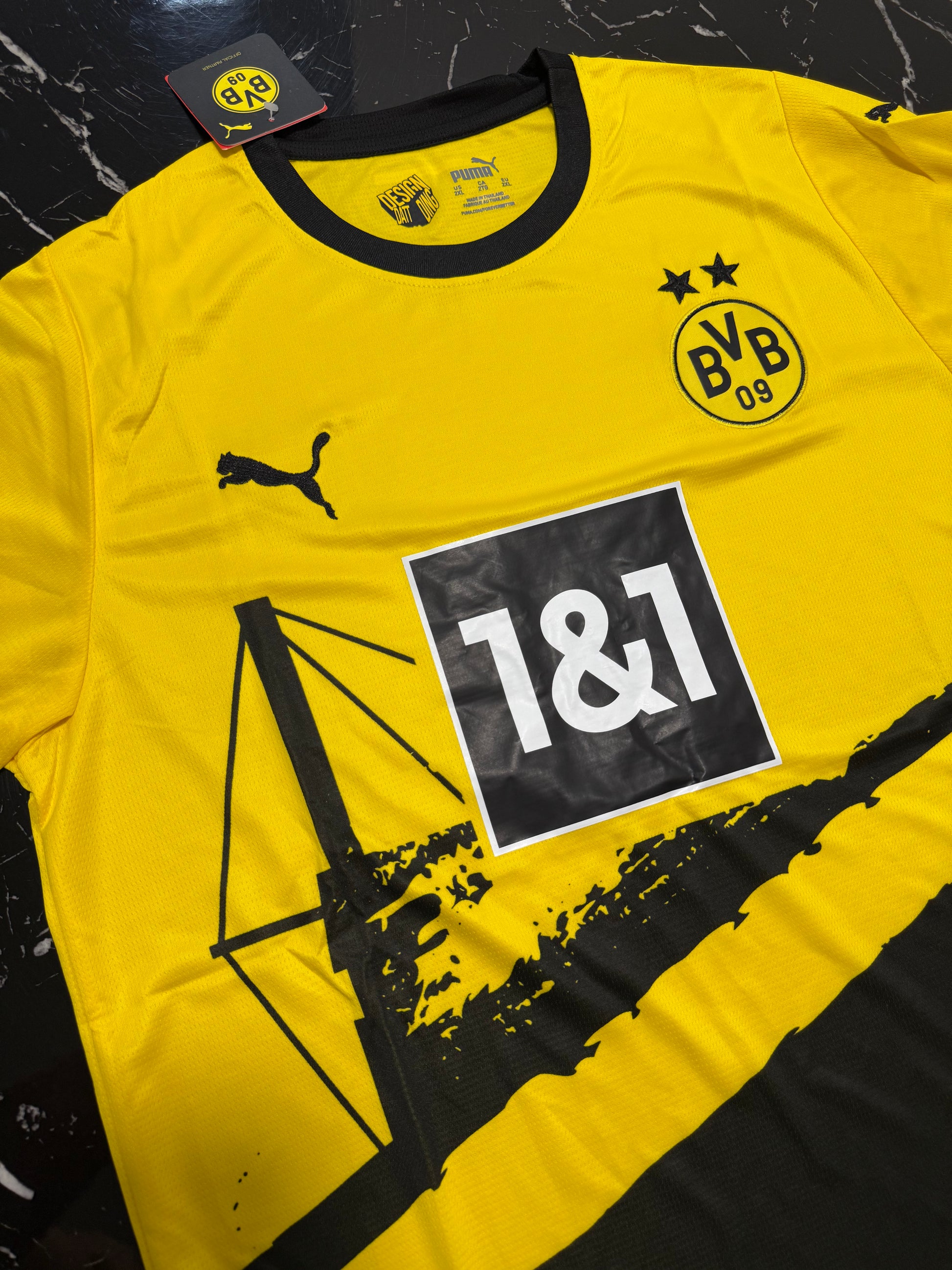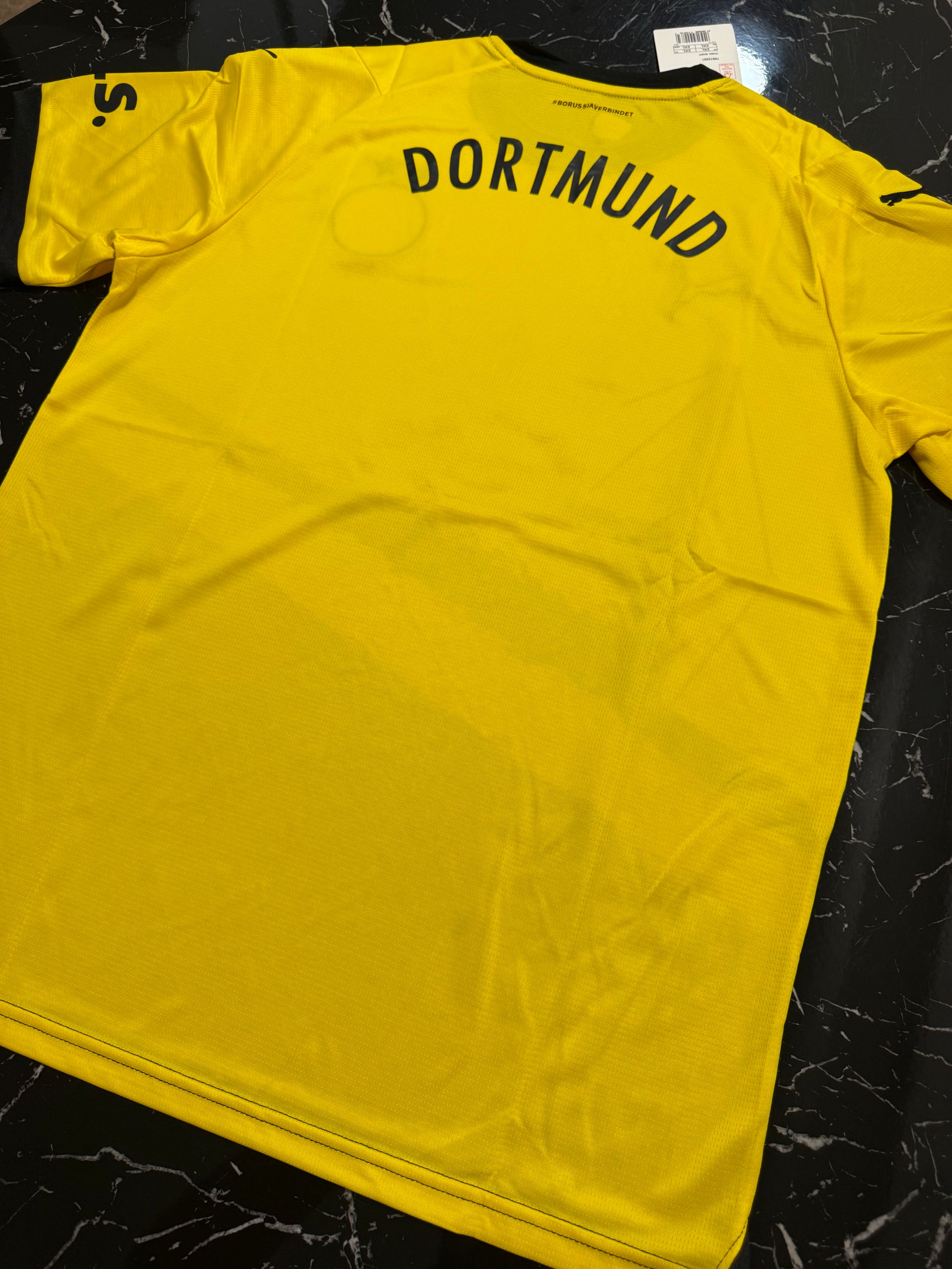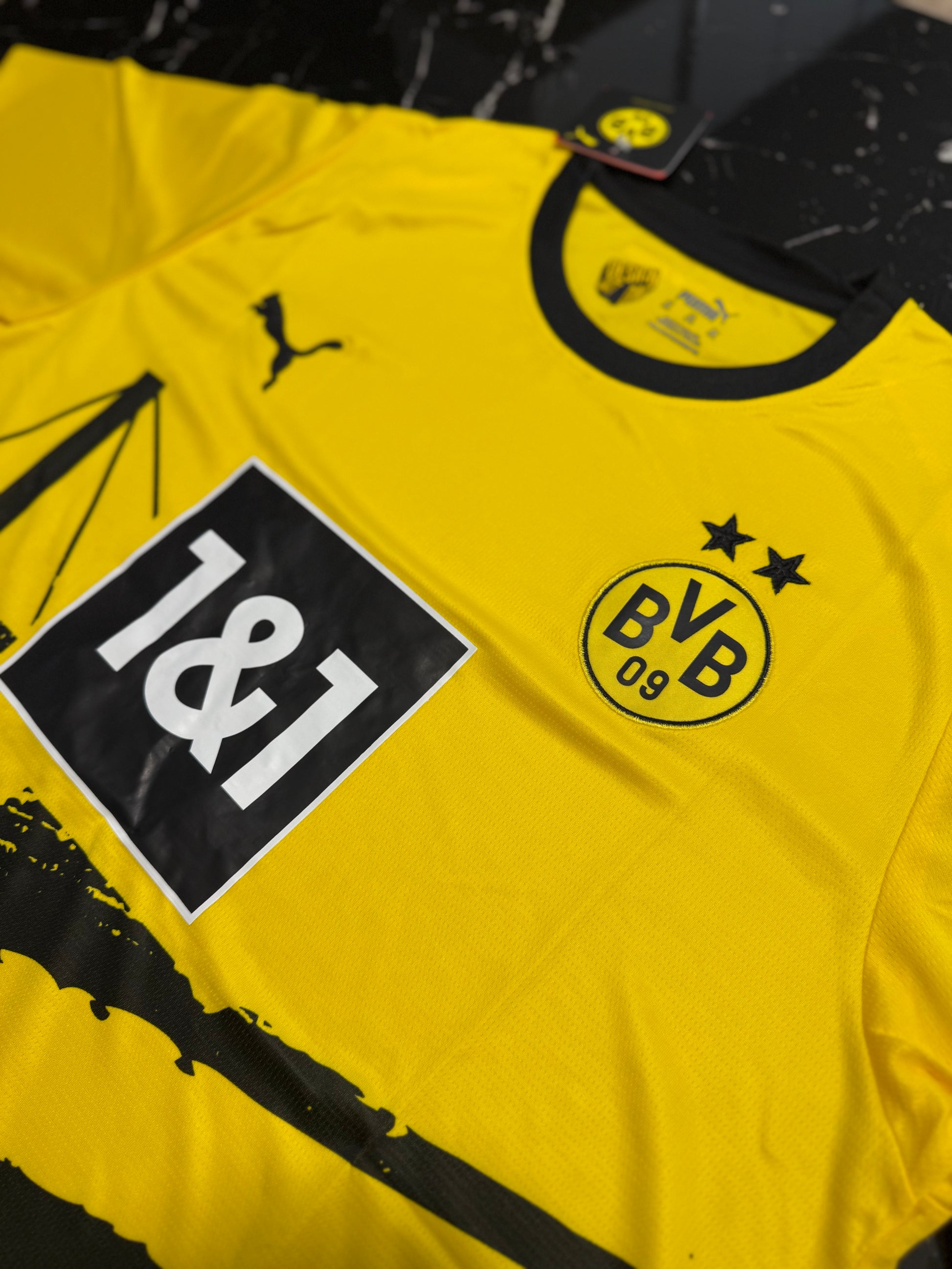 Borussia Dortmund's 2023/24 home jersey, a fan version, features the traditional vibrant yellow with black stripes on the front for a modern and distinctive look. This model was worn in the Bundesliga and Champions League, conveying the identity of Signal Iduna Park in every match.