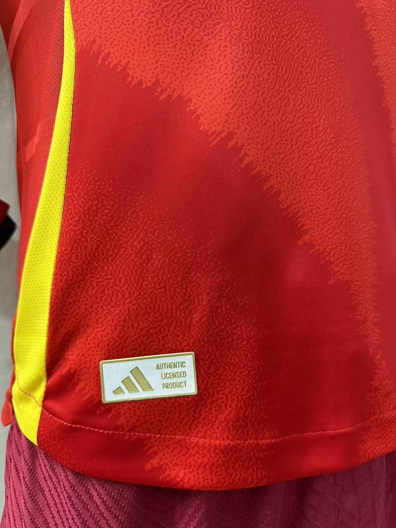 Spain 2024 home jersey, player version, launched for the European Championship in Germany. Featuring the traditional red colorway and yellow accents on the crest and sleeves, this model incorporates a subtle wave pattern in the fabric that represents the energy and movement of Spanish football.