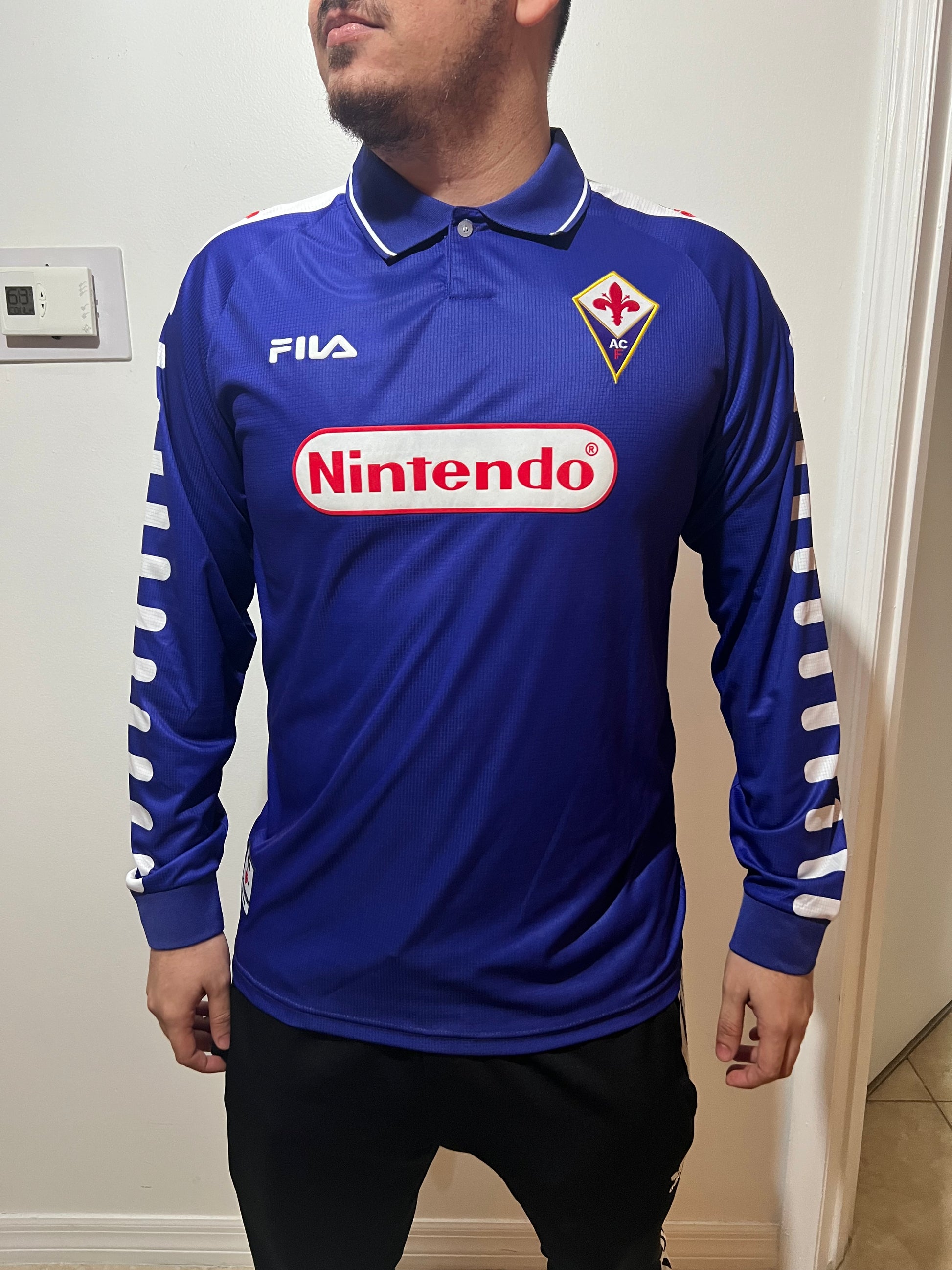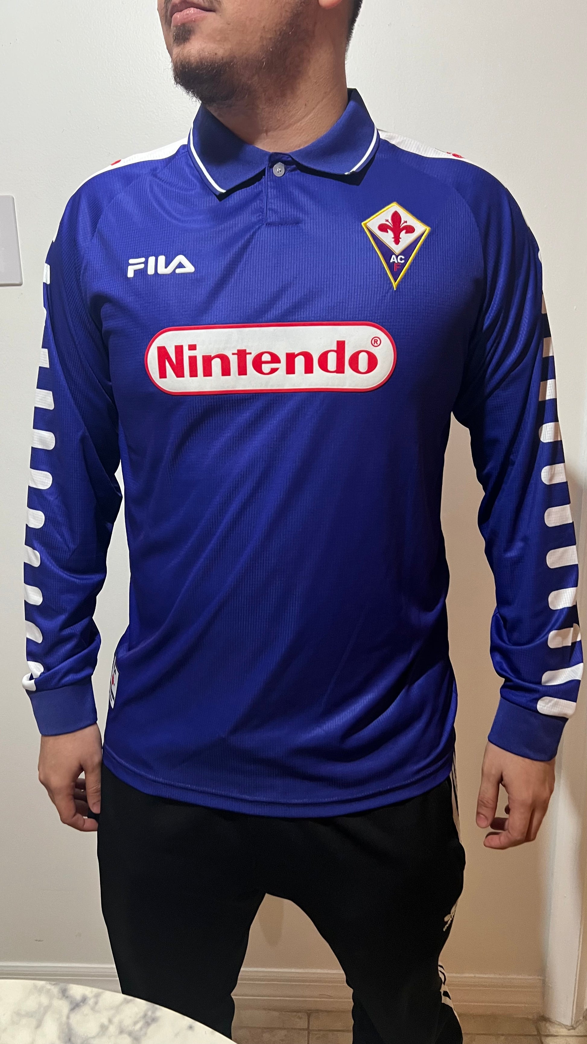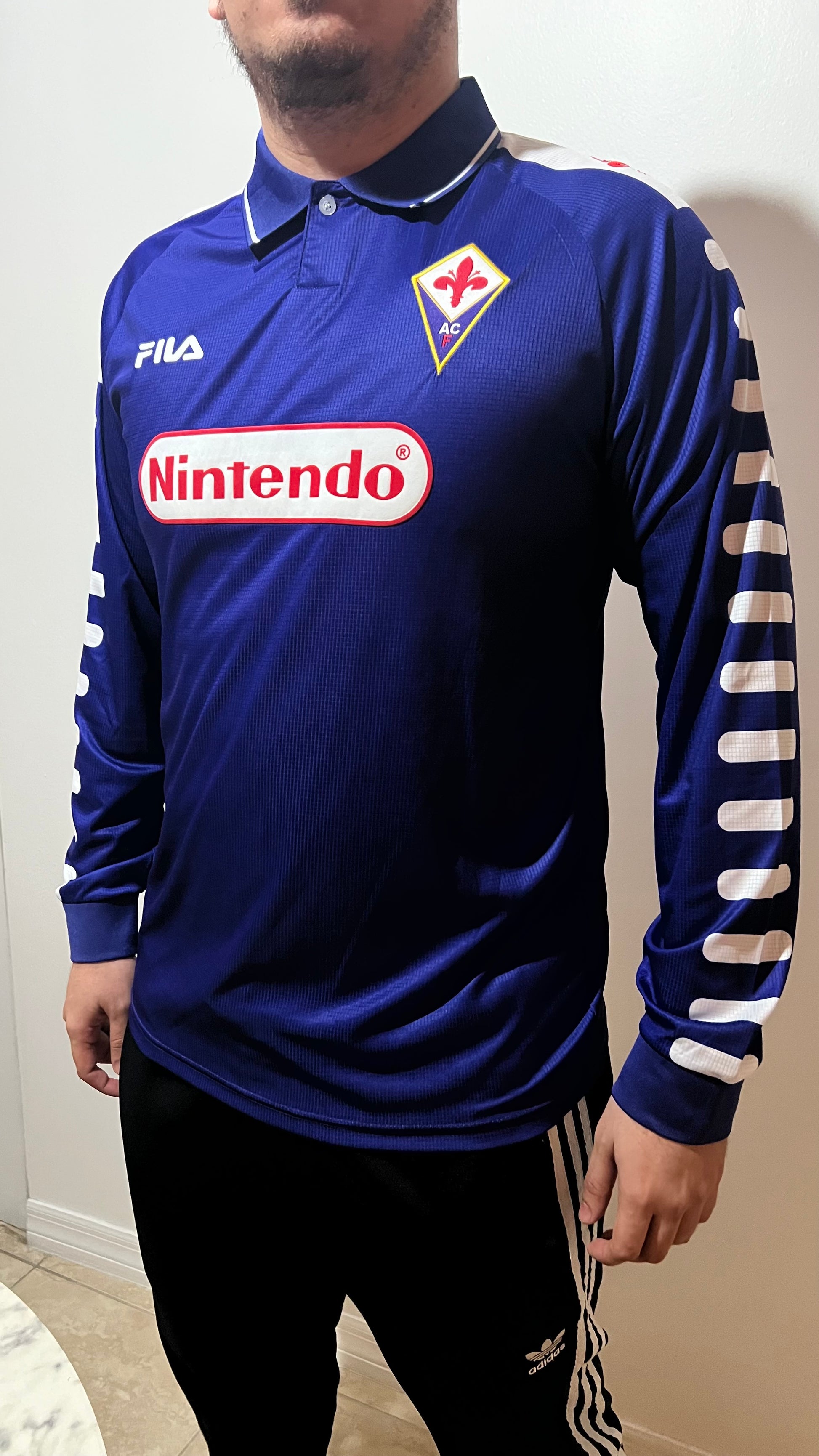 Fiorentina's 1998/99 retro home jersey, long-sleeved, features the classic violet colorway, Nintendo sponsorship, and Fila stripes on the sleeves. It's one of the most iconic styles of the '90s, worn by legends like Gabriel Batistuta, Rui Costa, and Edmundo in Serie A and the Champions League.