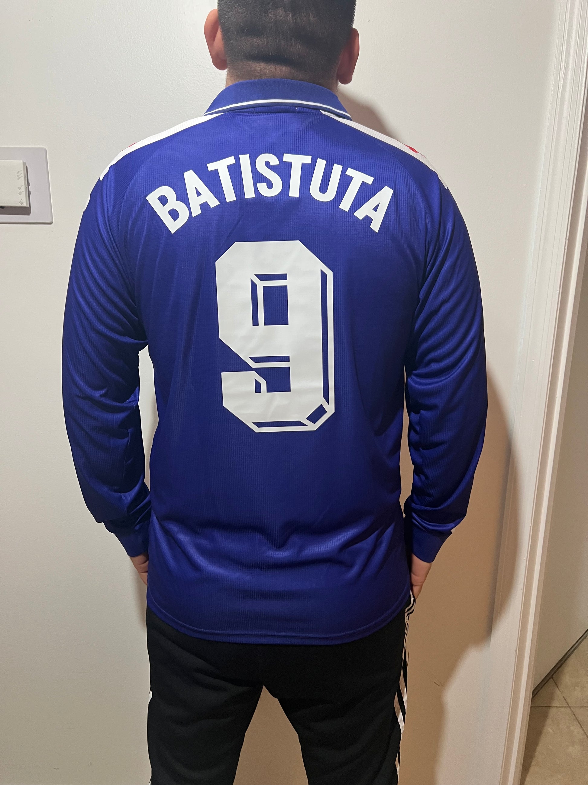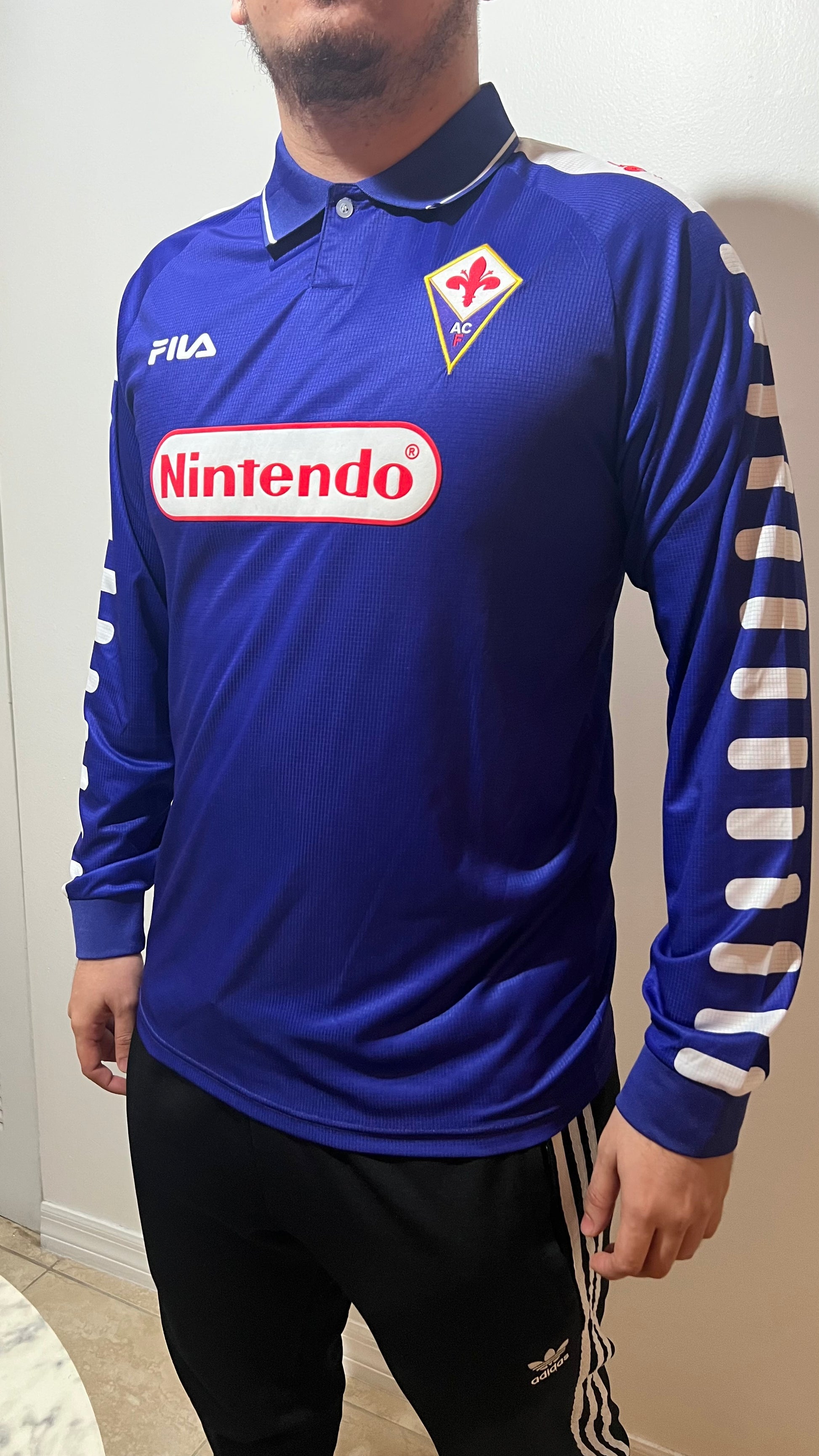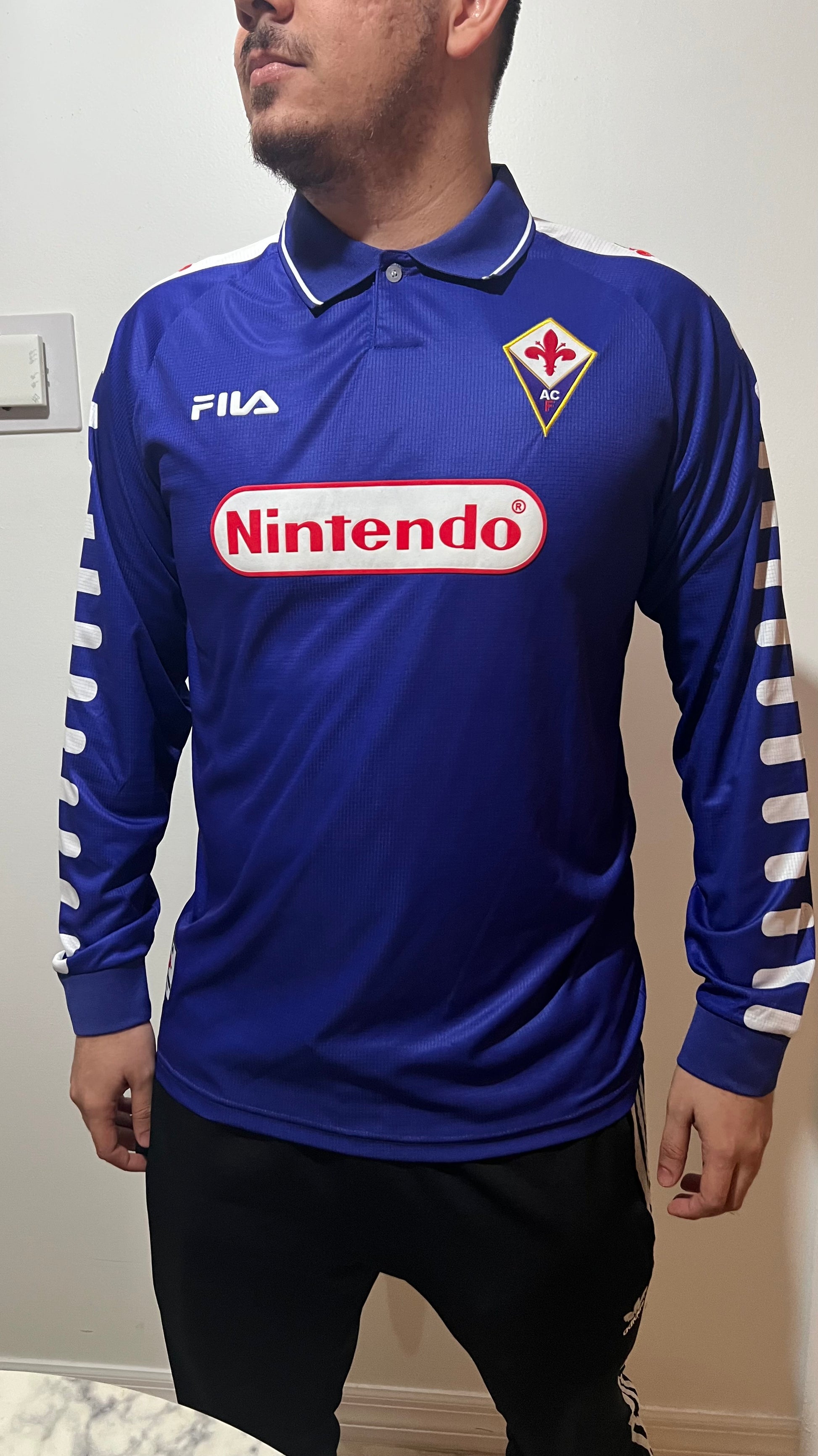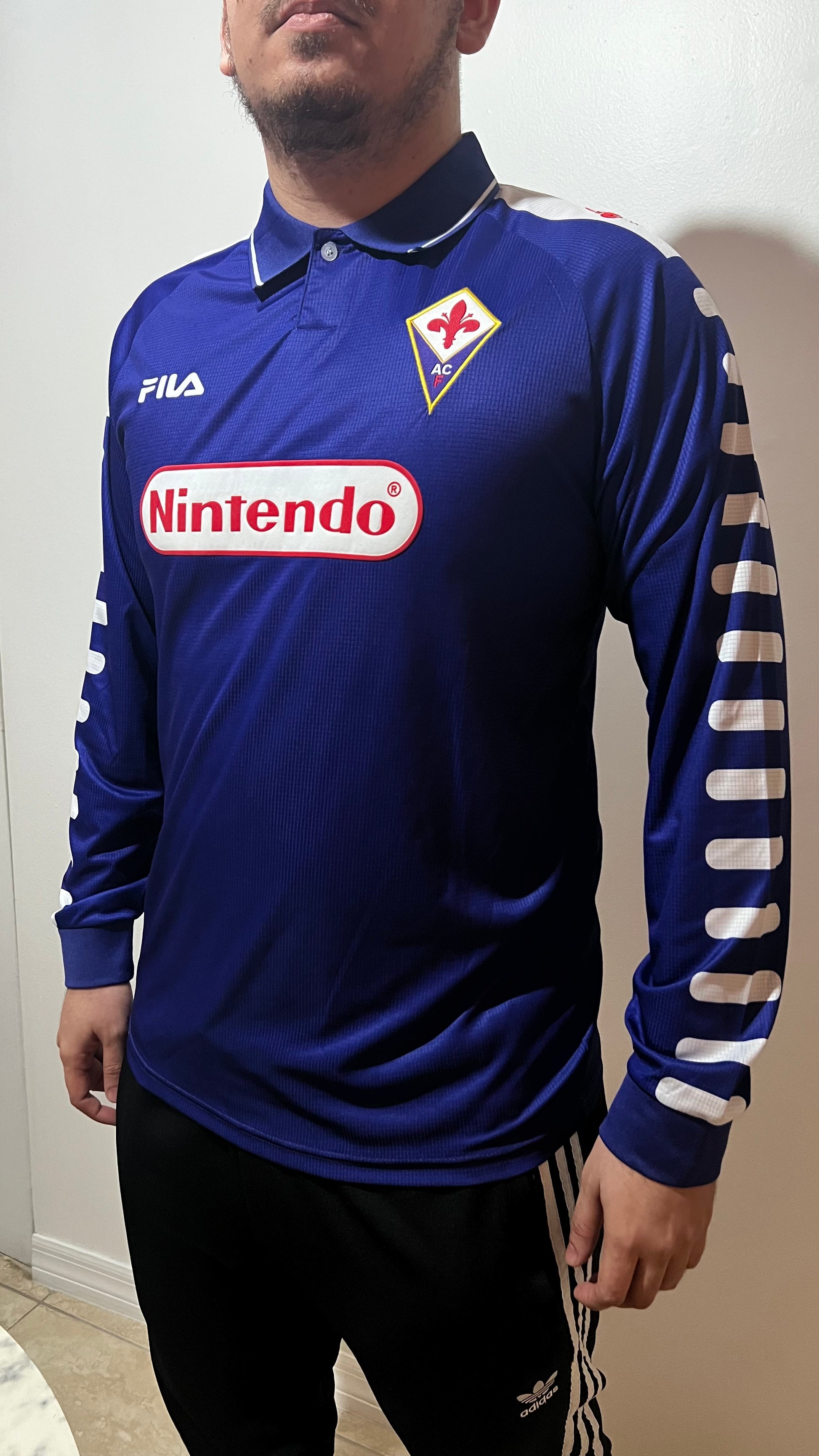 Fiorentina's 1998/99 retro home jersey, long-sleeved, features the classic violet colorway, Nintendo sponsorship, and Fila stripes on the sleeves. It's one of the most iconic styles of the '90s, worn by legends like Gabriel Batistuta, Rui Costa, and Edmundo in Serie A and the Champions League.