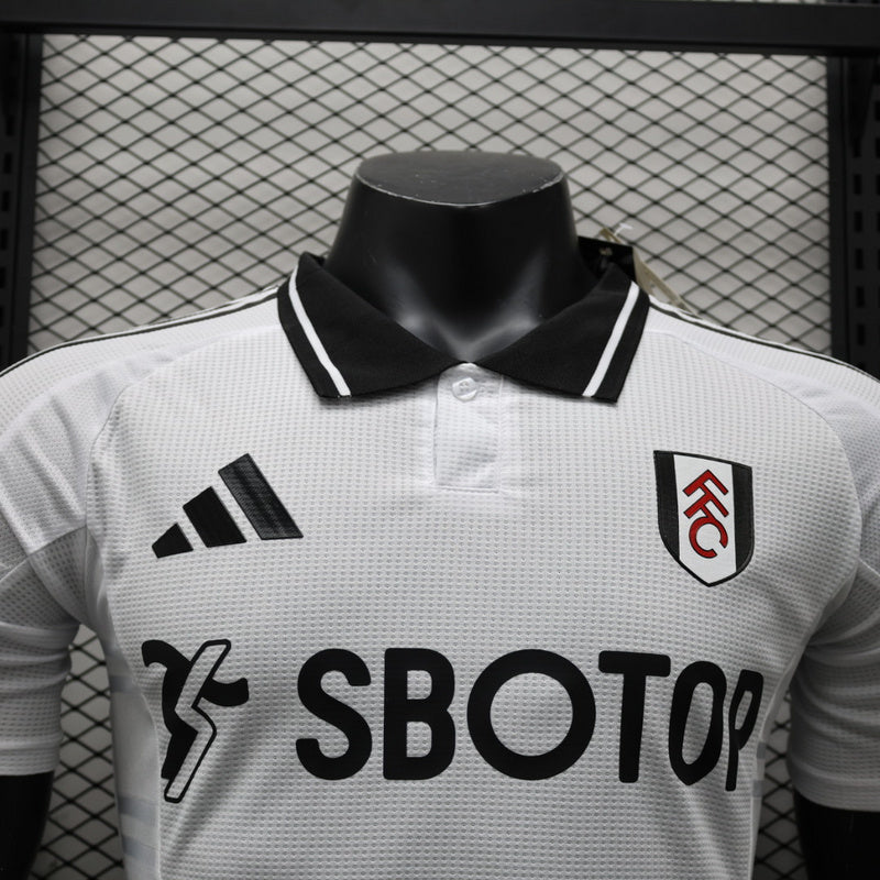 Fulham 2024/25 home shirt in player version, featuring a slim fit and high-performance fabric that offers lightweight comfort and optimal ventilation with every move. It maintains the traditional white with black details, an iconic design that reflects the club's identity and is designed for those who want to dress like the pros.