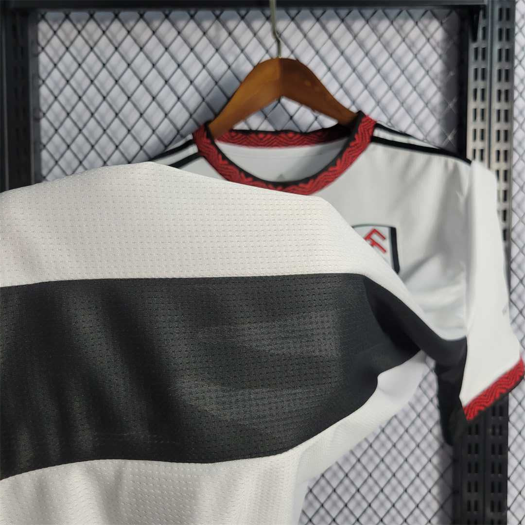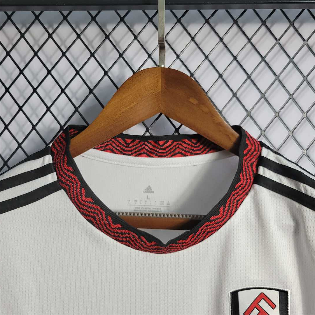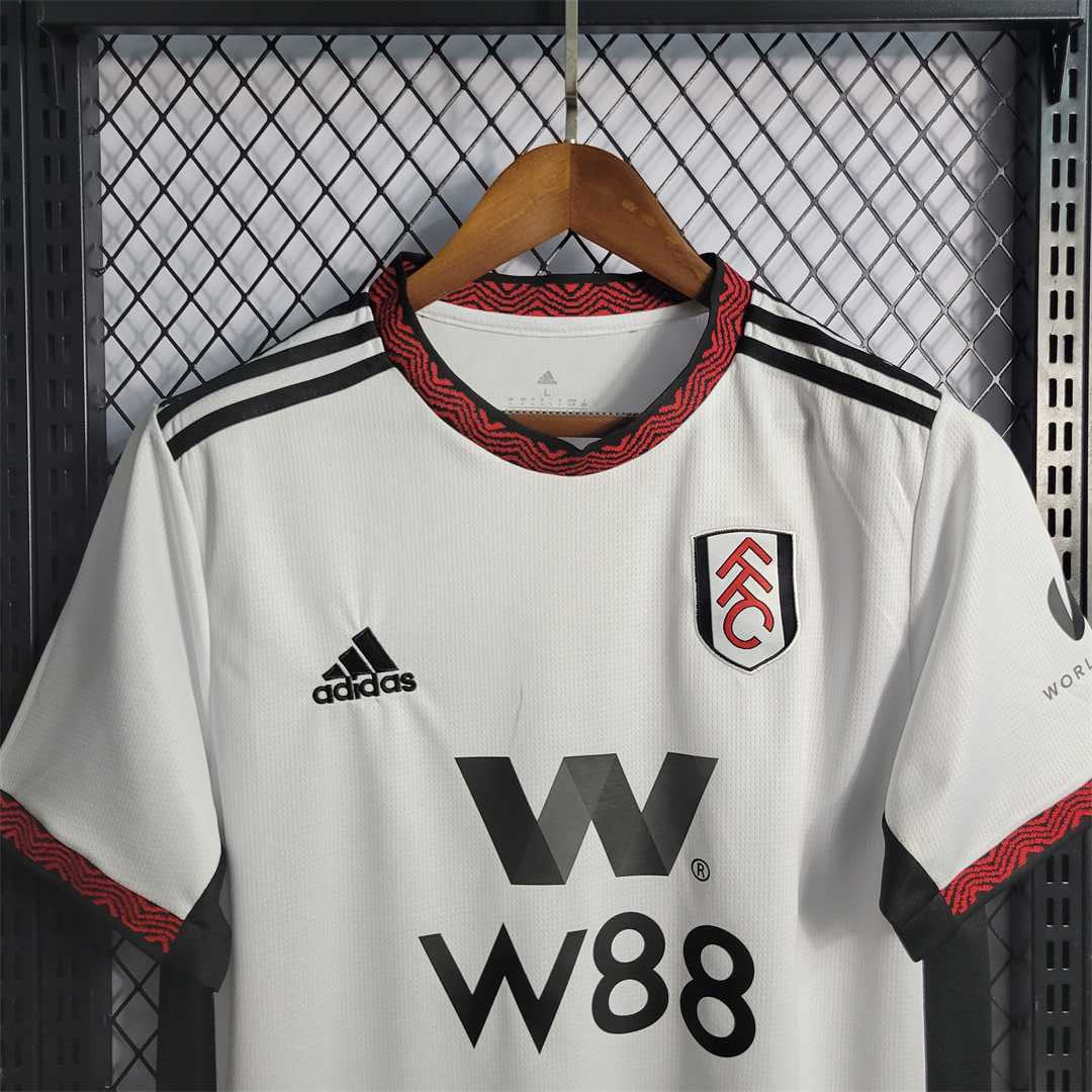 Fulham 2022/23 home shirt in a fan version, featuring a white base, black collar and cuffs, and a sleek design that blends tradition and modernity. The lightweight, durable fabric ensures comfort at all times, ideal for accompanying the club on its return to the Premier League and sporting the colors of Craven Cottage.