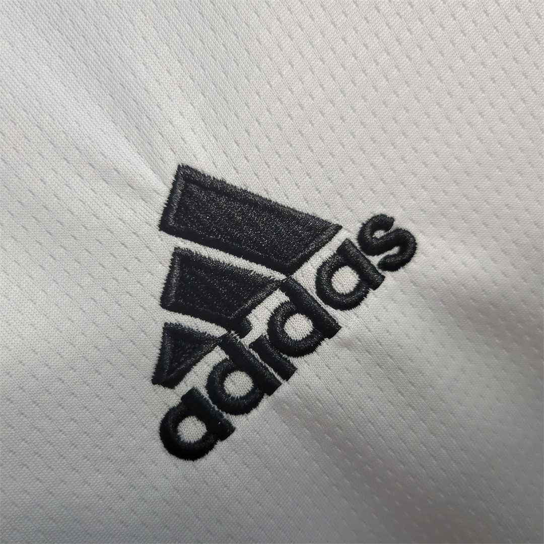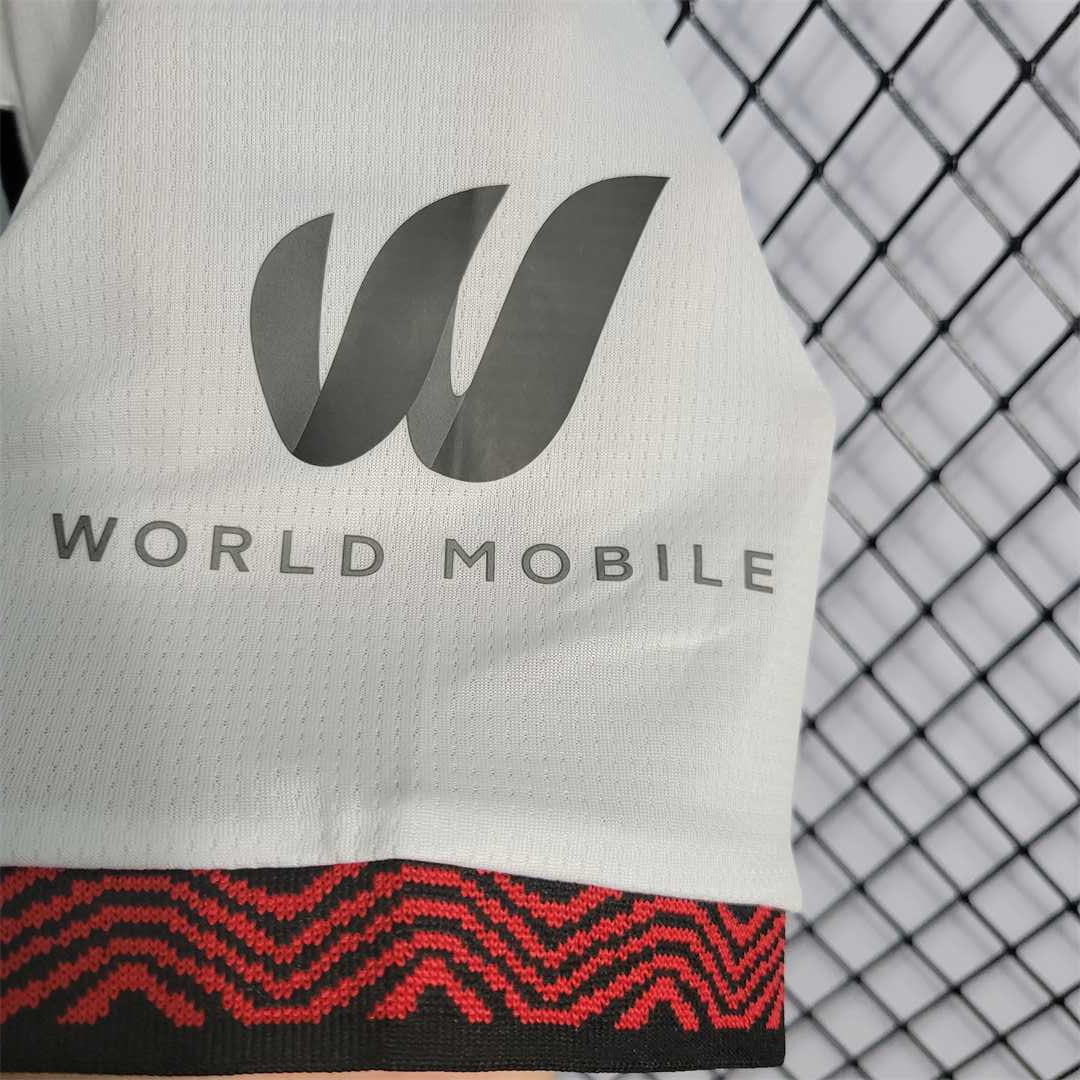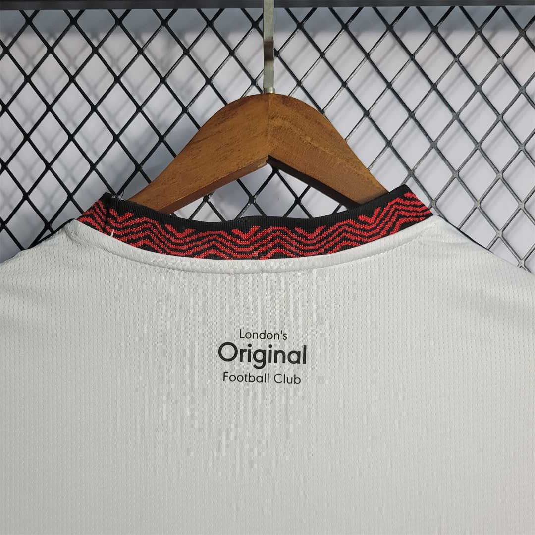 Fulham 2022/23 home shirt in a fan version, featuring a white base, black collar and cuffs, and a sleek design that blends tradition and modernity. The lightweight, durable fabric ensures comfort at all times, ideal for accompanying the club on its return to the Premier League and sporting the colors of Craven Cottage.