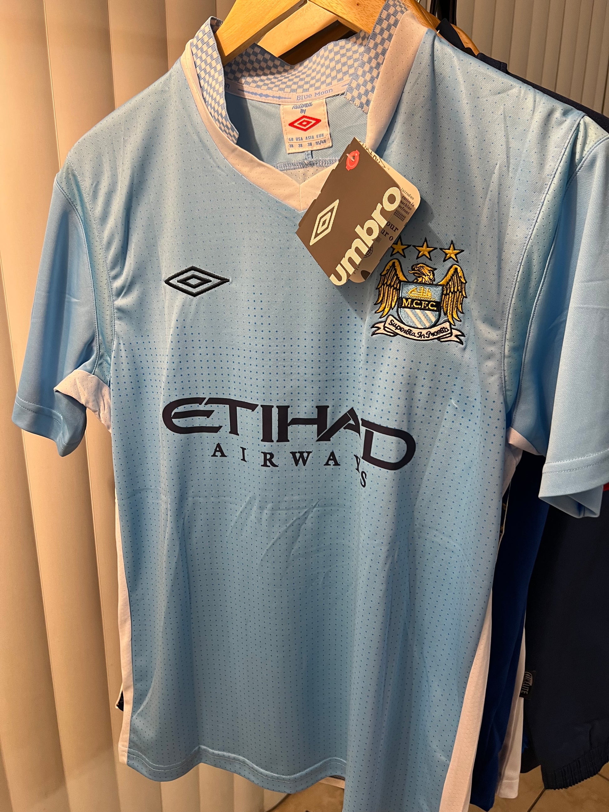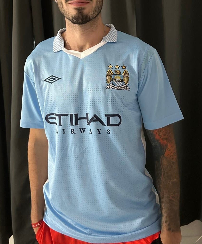 Manchester City's 2011/12 home retro shirt, remembered for being the one worn by the team in the historic season in which they won the Premier League after a 44-year wait. With its classic sky blue design, white collar accents, and understated style, it became a symbol of the club's new era.