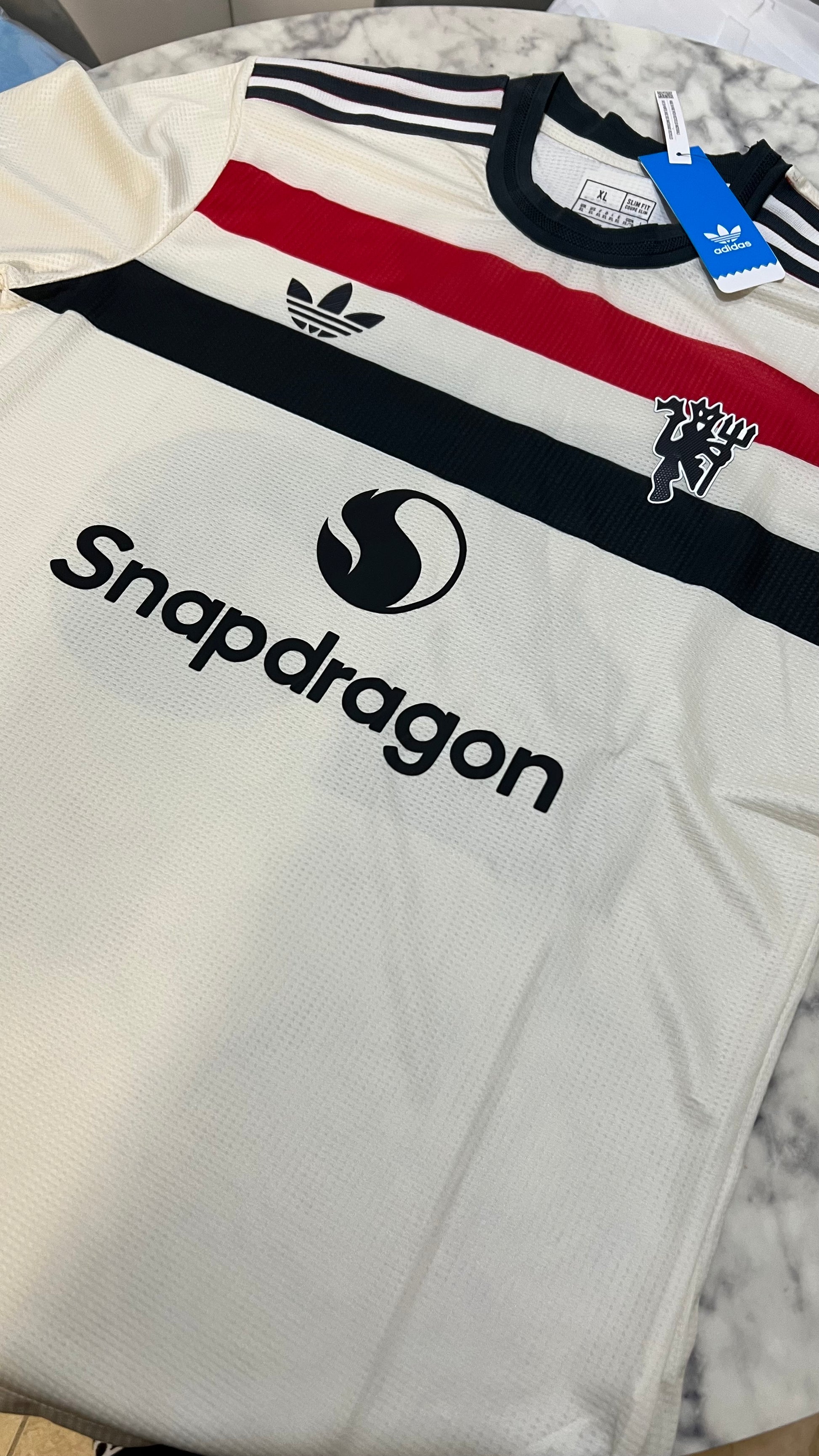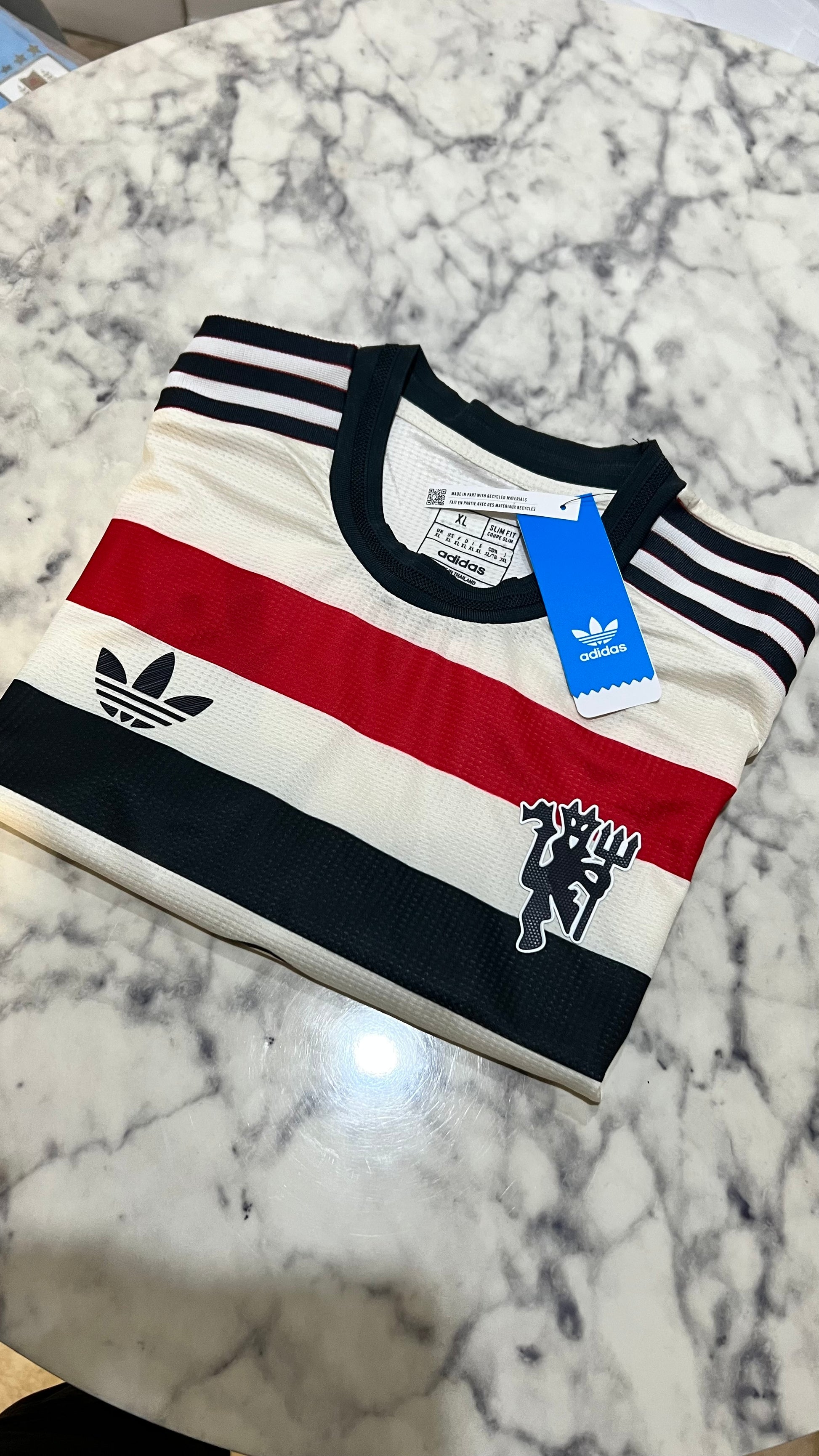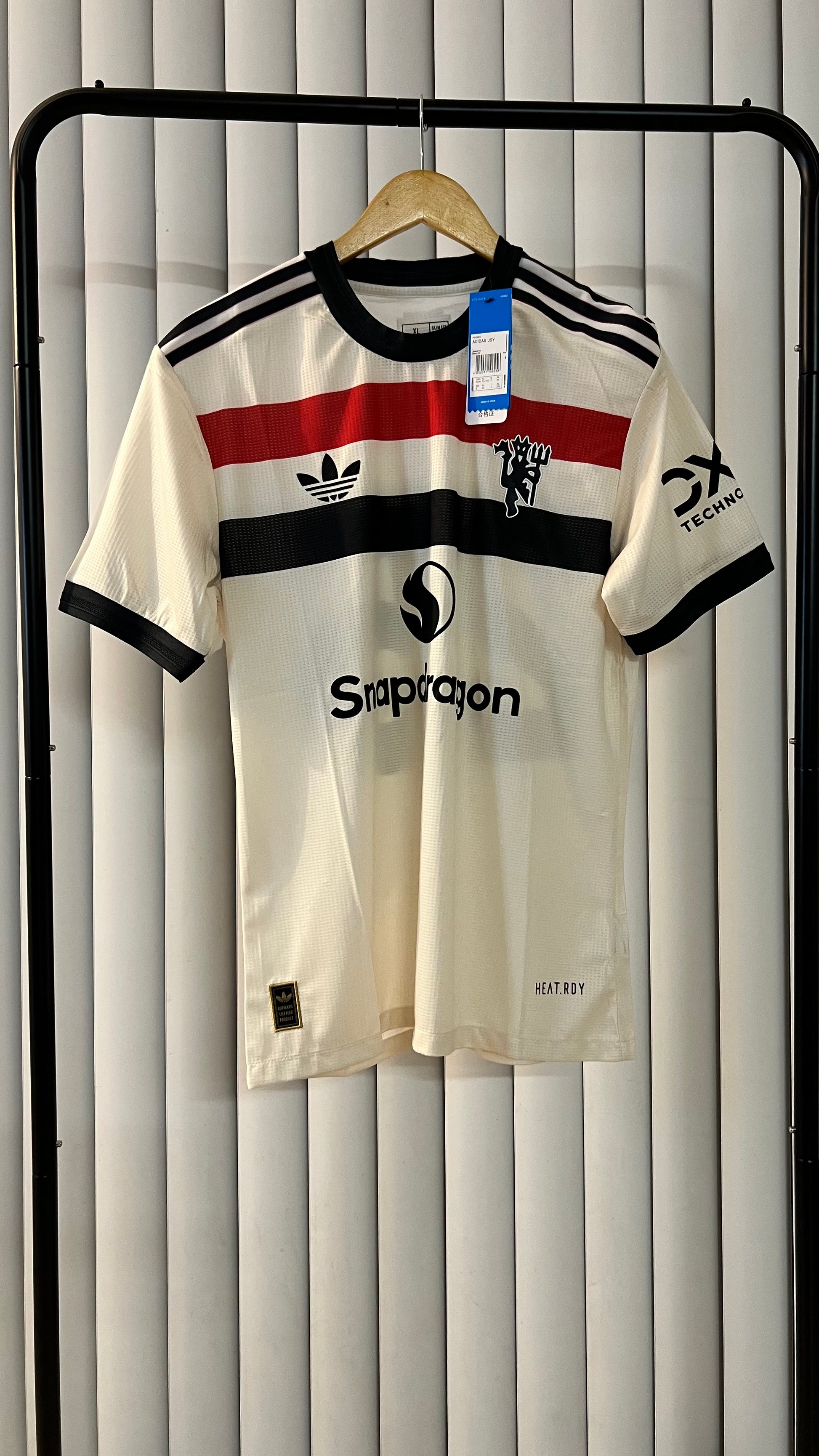 Manchester United 2024/25 away shirt in player version, featuring a retro-modern Adidas Originals design. It features a cream base with a red, black, and white horizontal stripe, a classic retro crest, and details reminiscent of the club's legendary shirts from the 1980s and 1990s.