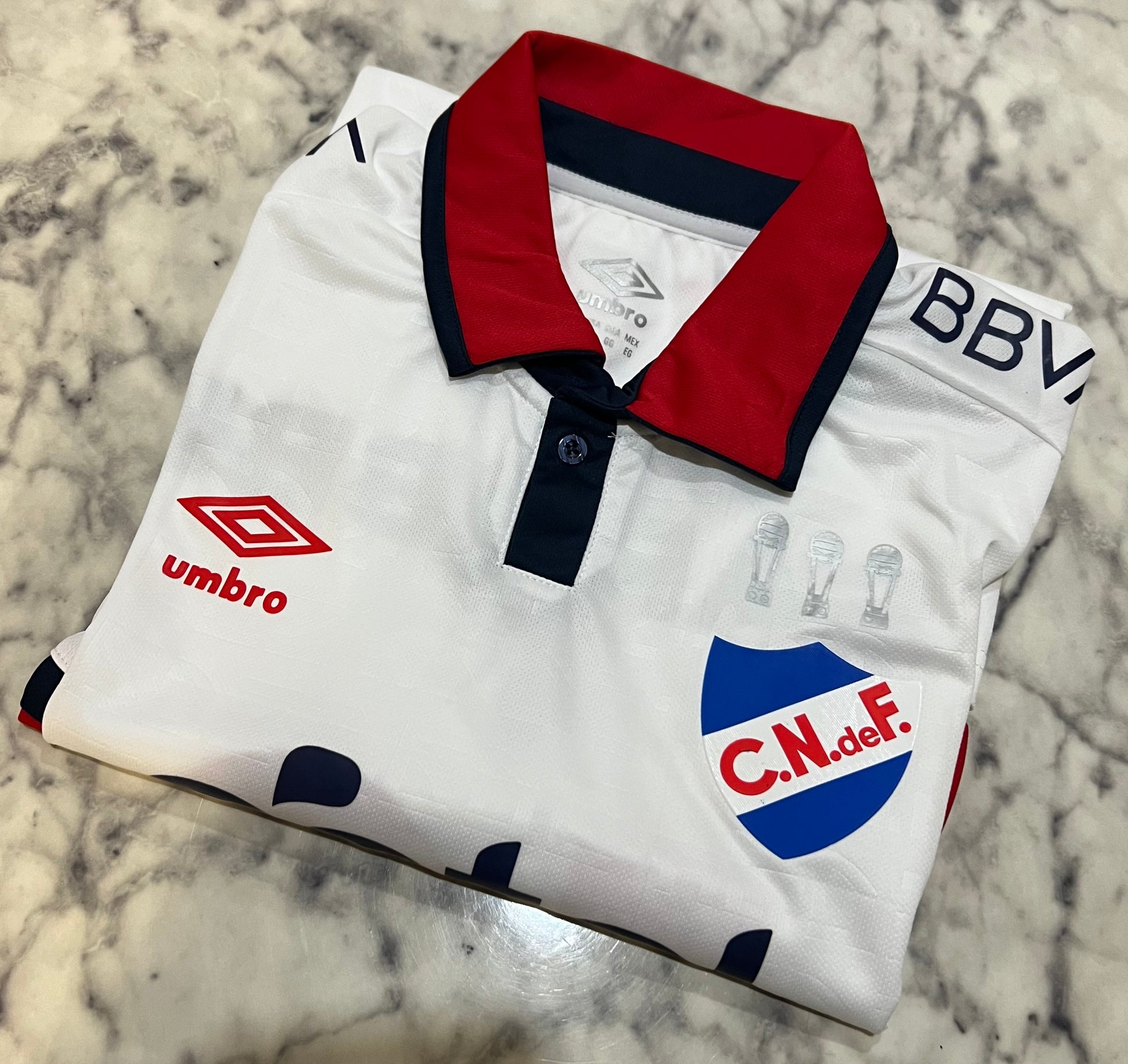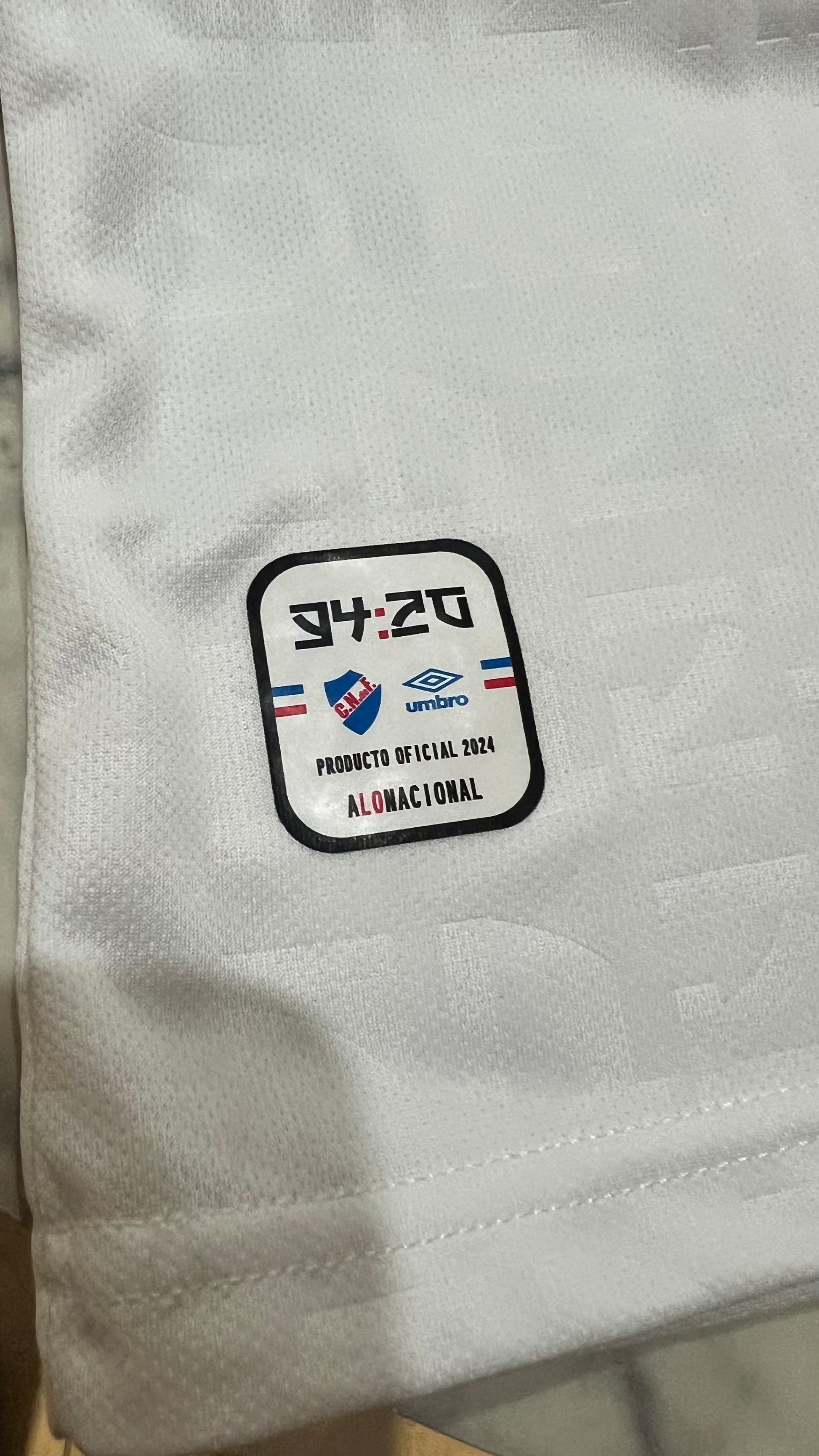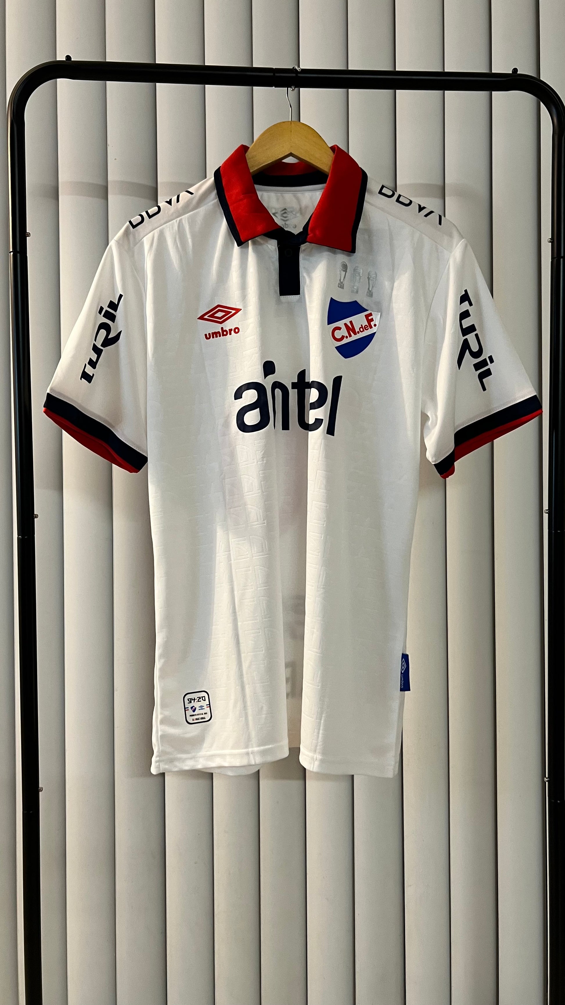 Nacional 2024 home jersey in a fan version, manufactured by Umbro. It maintains the traditional white base , accompanied by a red polo collar with navy blue details , giving it an elegant and distinctive style for this season. The tricolor crest embroidered on the chest stands out proudly alongside the official sponsors.