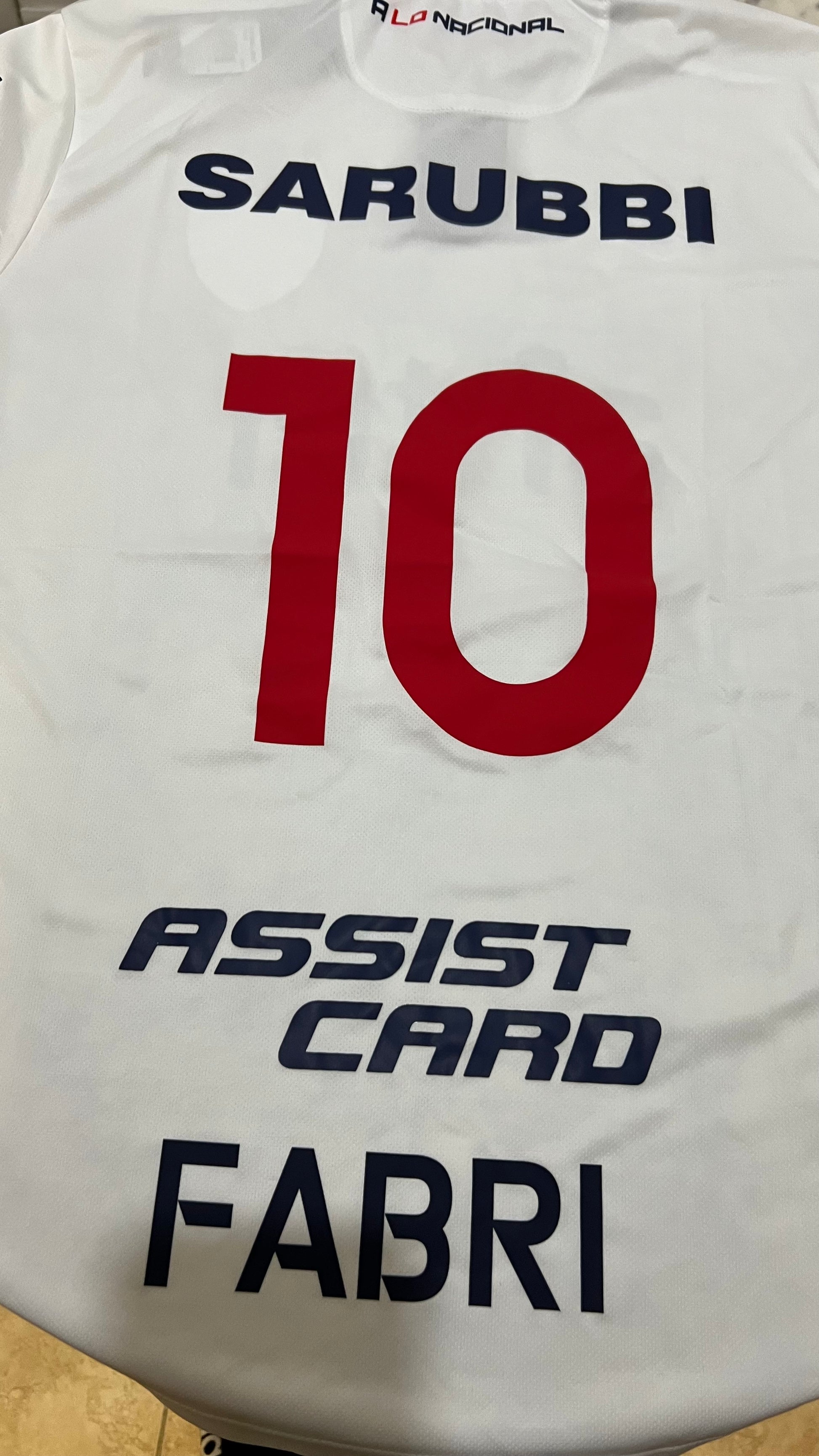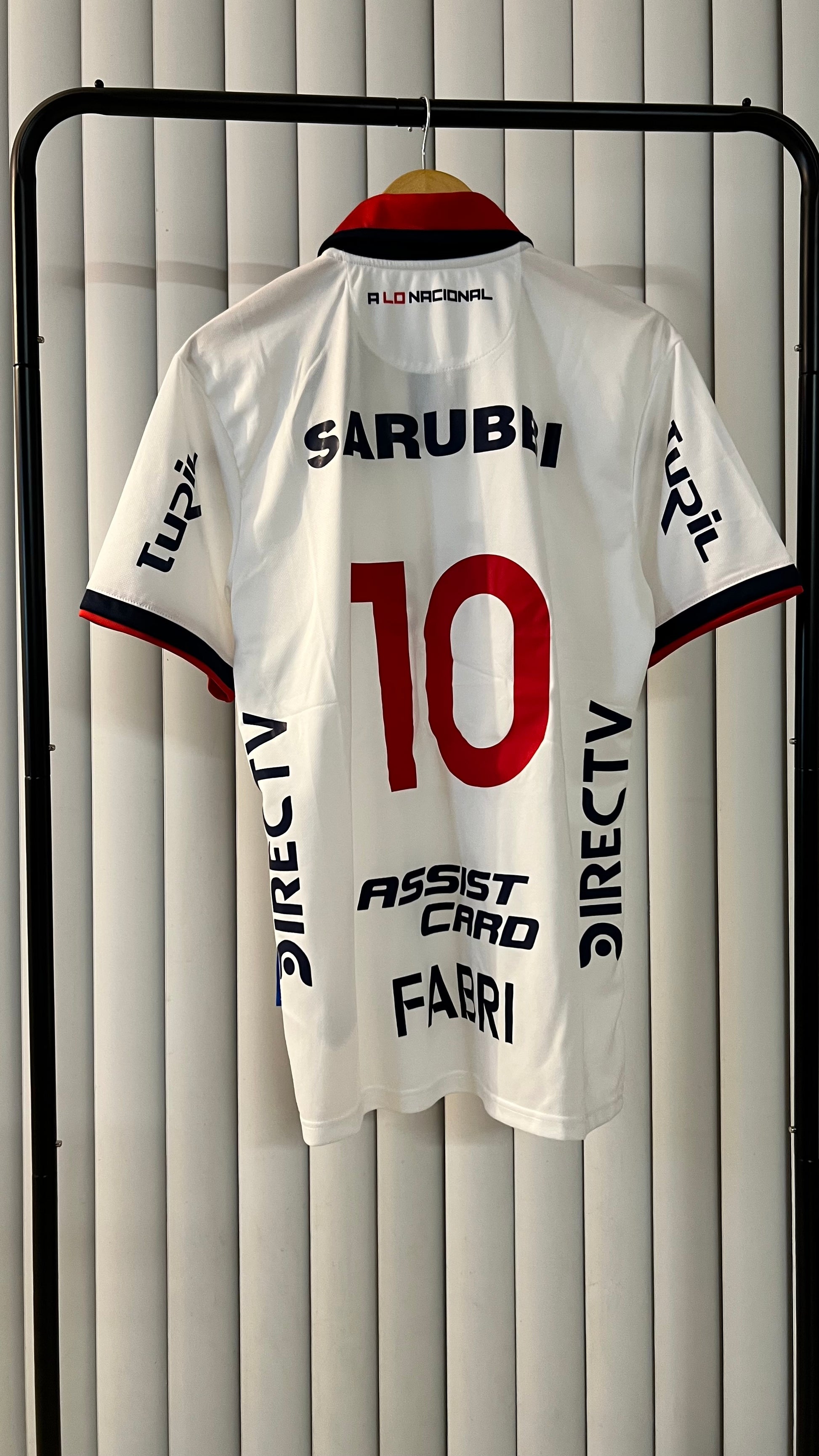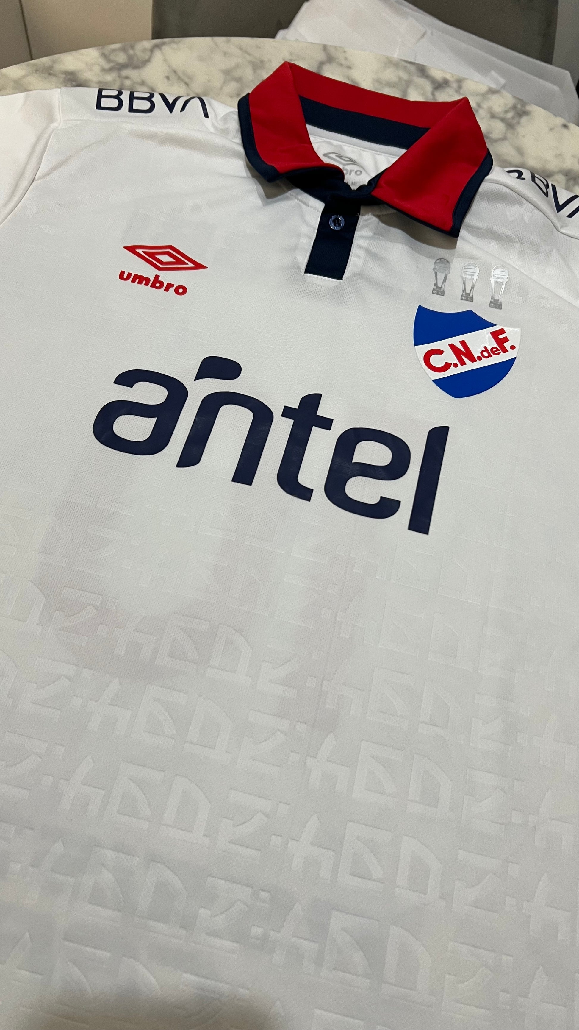 Nacional 2024 home jersey in a fan version, manufactured by Umbro. It maintains the traditional white base , accompanied by a red polo collar with navy blue details , giving it an elegant and distinctive style for this season. The tricolor crest embroidered on the chest stands out proudly alongside the official sponsors.