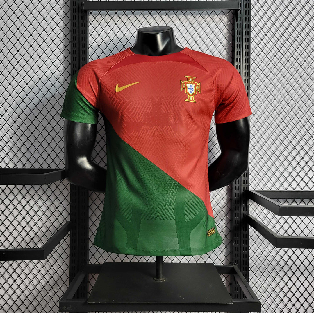 Portugal 2022 home jersey in player version, featuring a deep red base and a diagonal green stripe across the chest that breaks with the traditional design, inspired by the national flag. Slim fit, high-performance fabric, and heat-sealed details, identical to the one worn by the Portuguese stars at the 2022 World Cup in Qatar. A must-have for collectors and fans looking for a model with a modern identity and style.