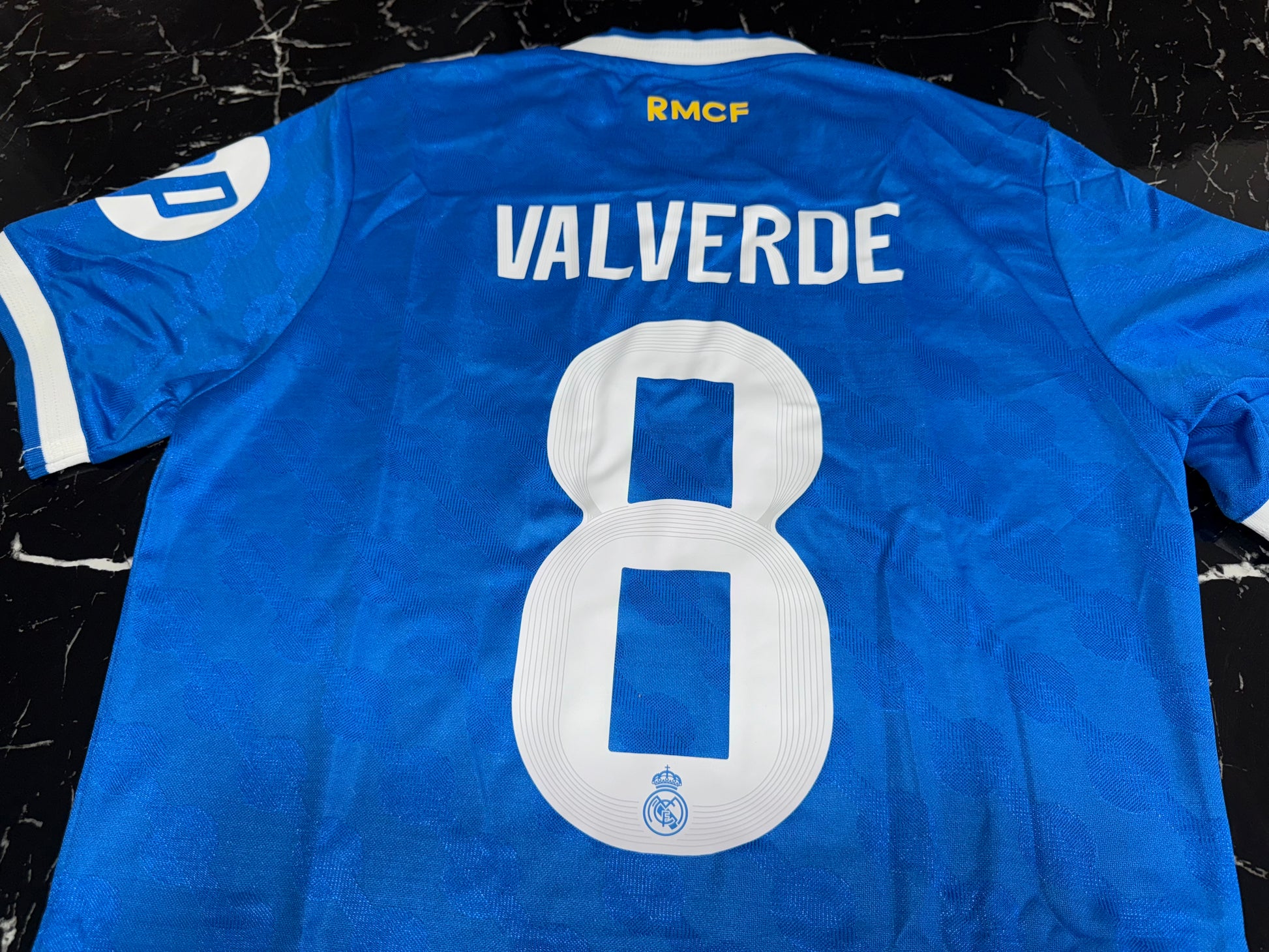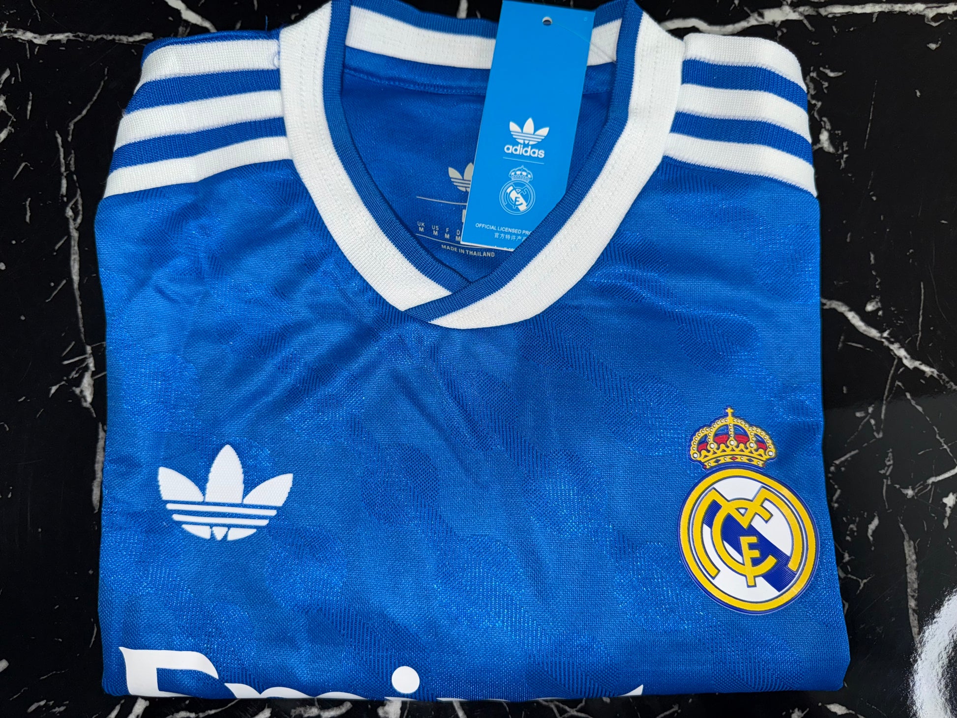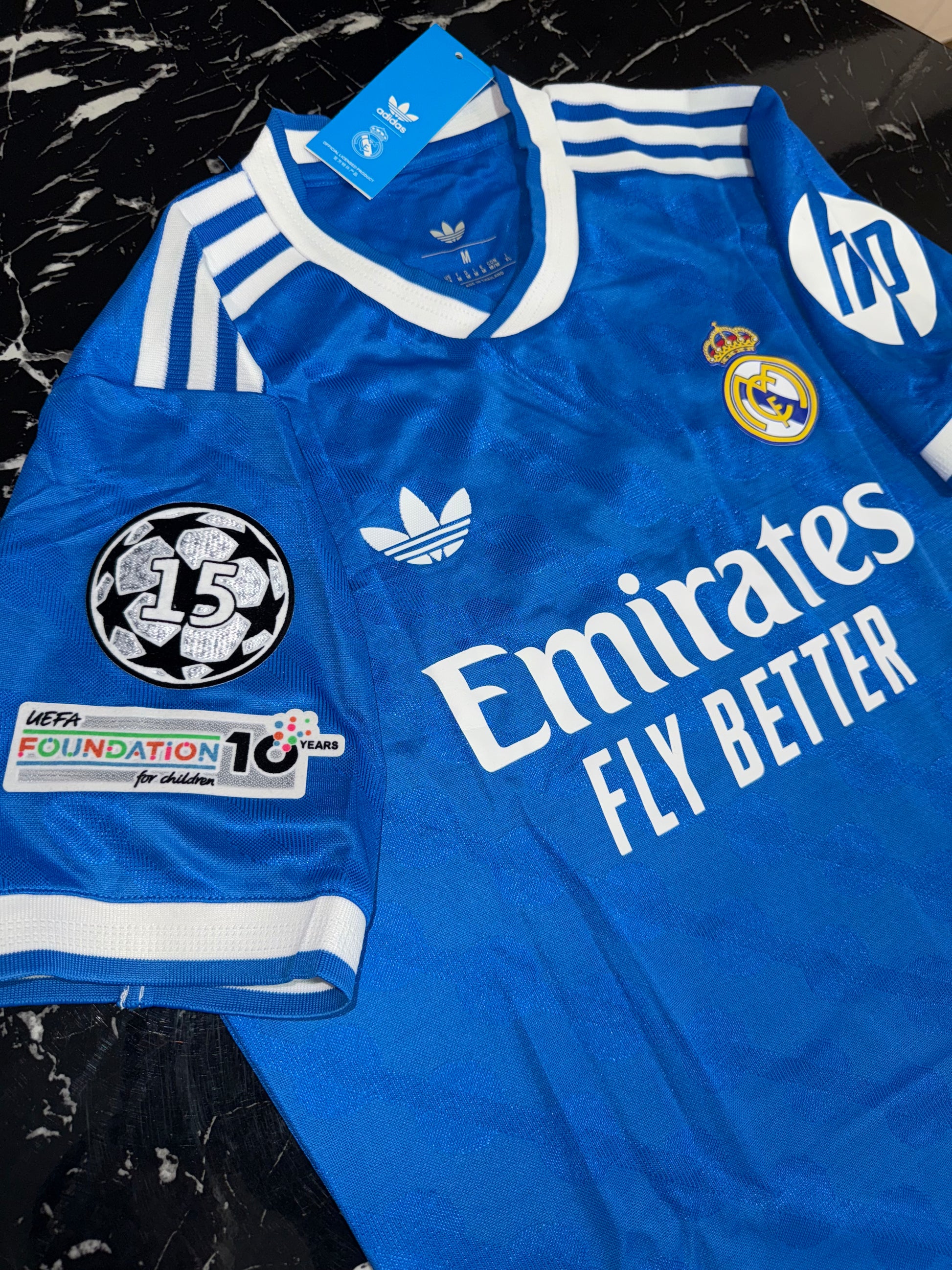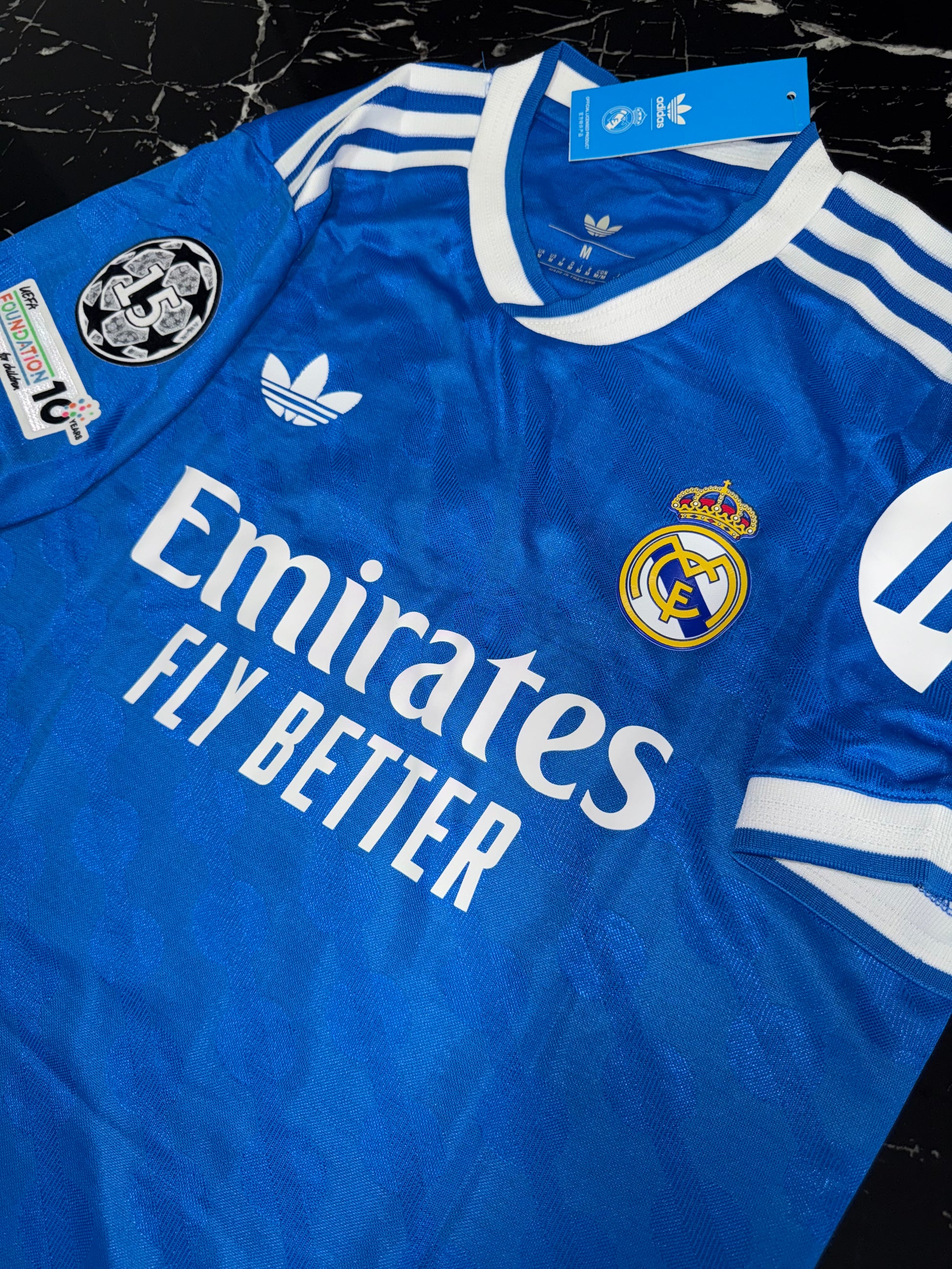 Real Madrid's 2025/26 away jersey in player version, featuring a vibrant electric blue design that stands out for its freshness and modernity, while maintaining the club's signature elegance.