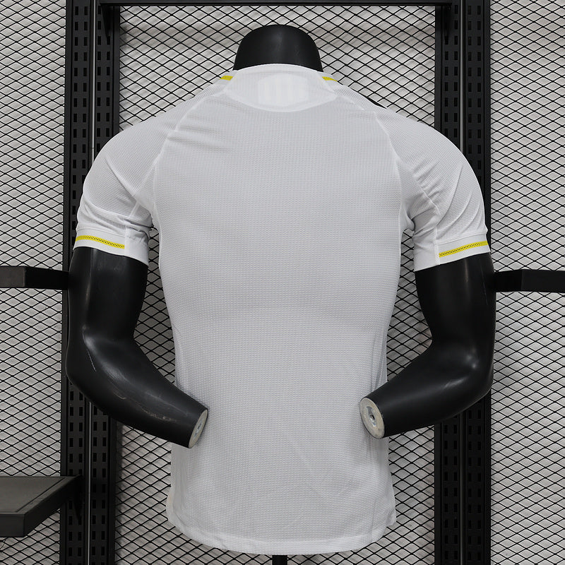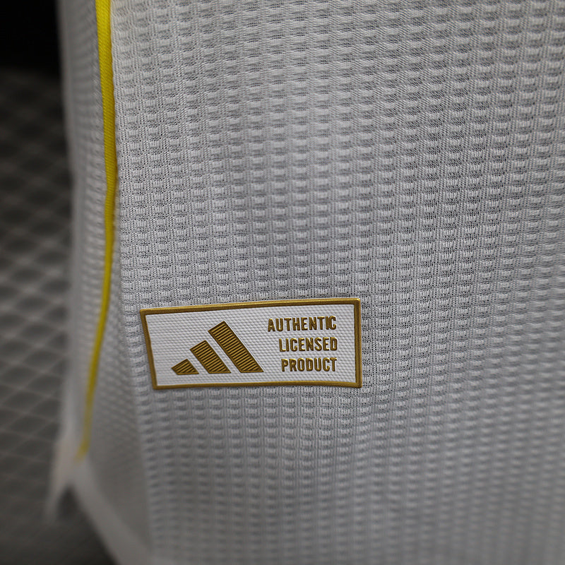 Real Madrid 2025/26 home shirt, player version, presented in the classic pristine white that represents Europe's most successful club. This model features gold and blue details on the collar and sleeves, providing an elegant and modern style without losing the Madrid essence.