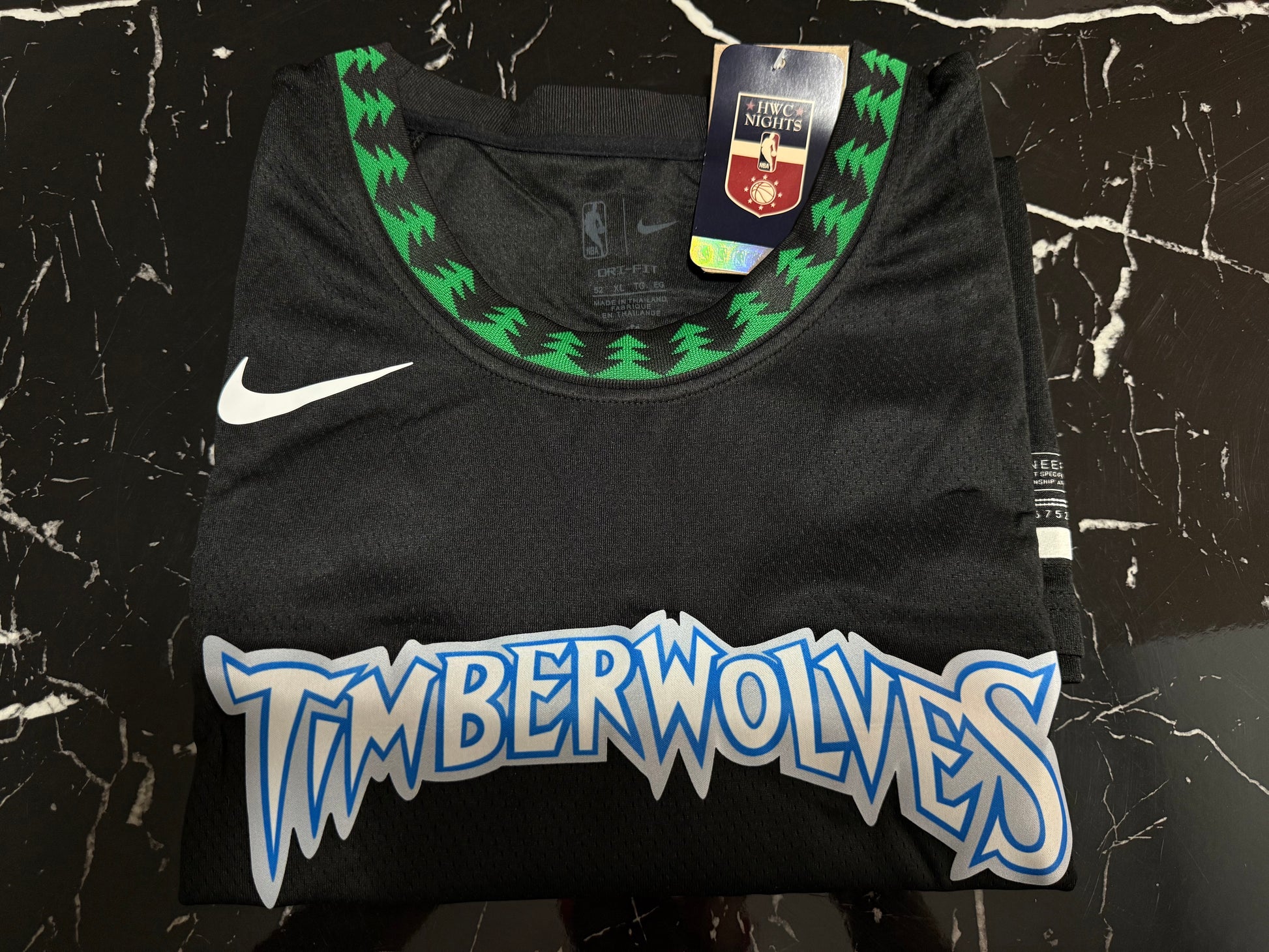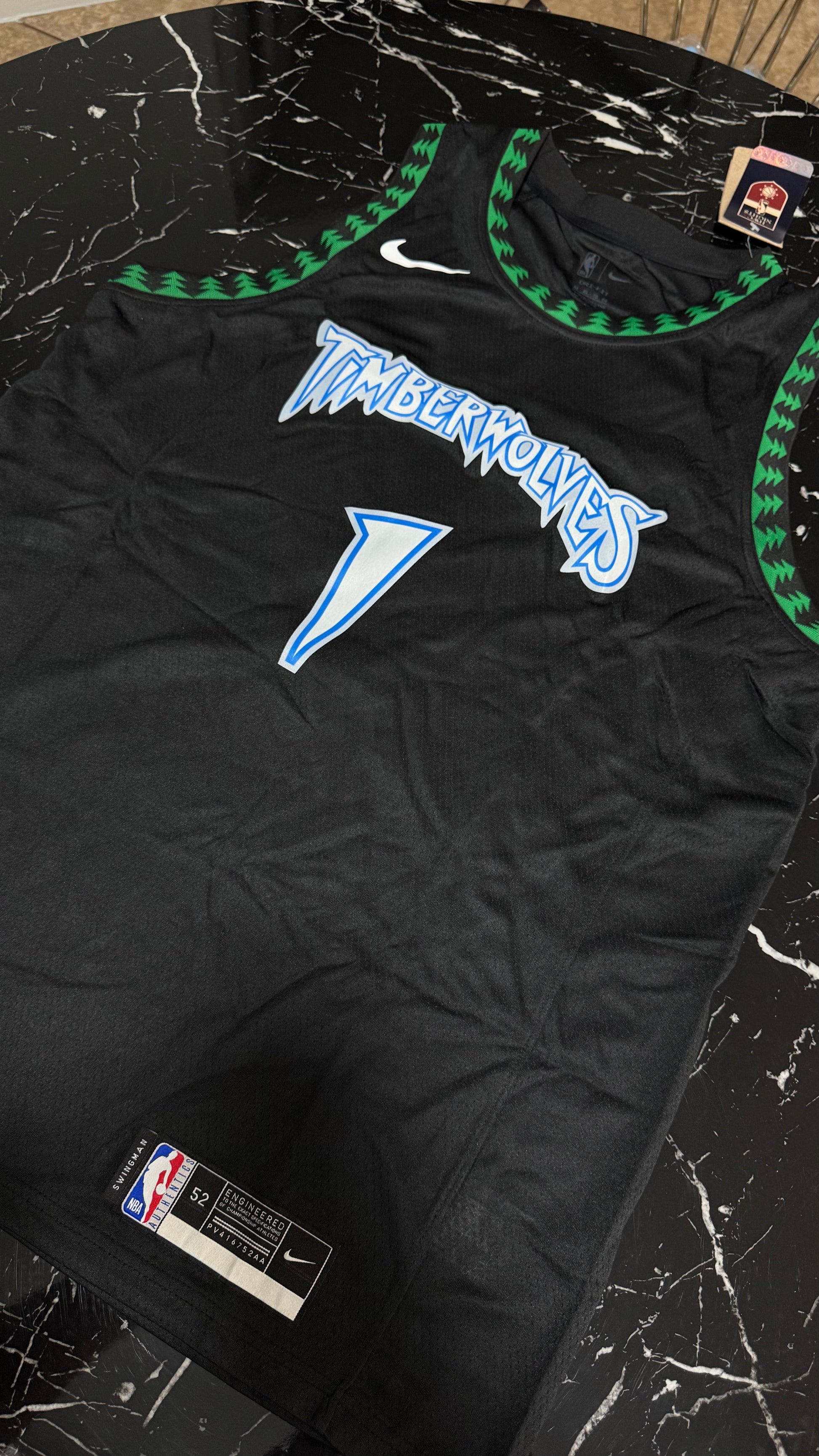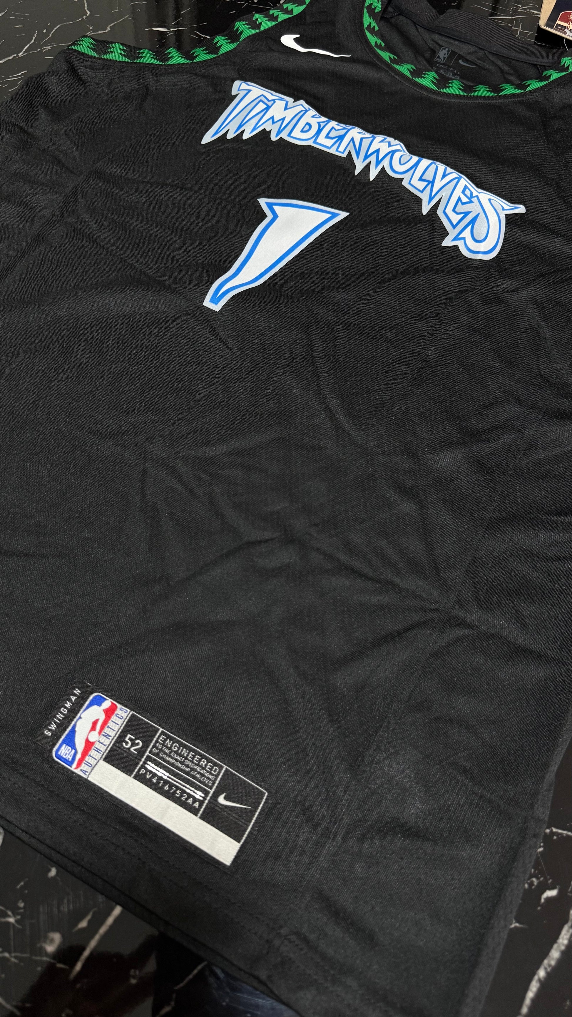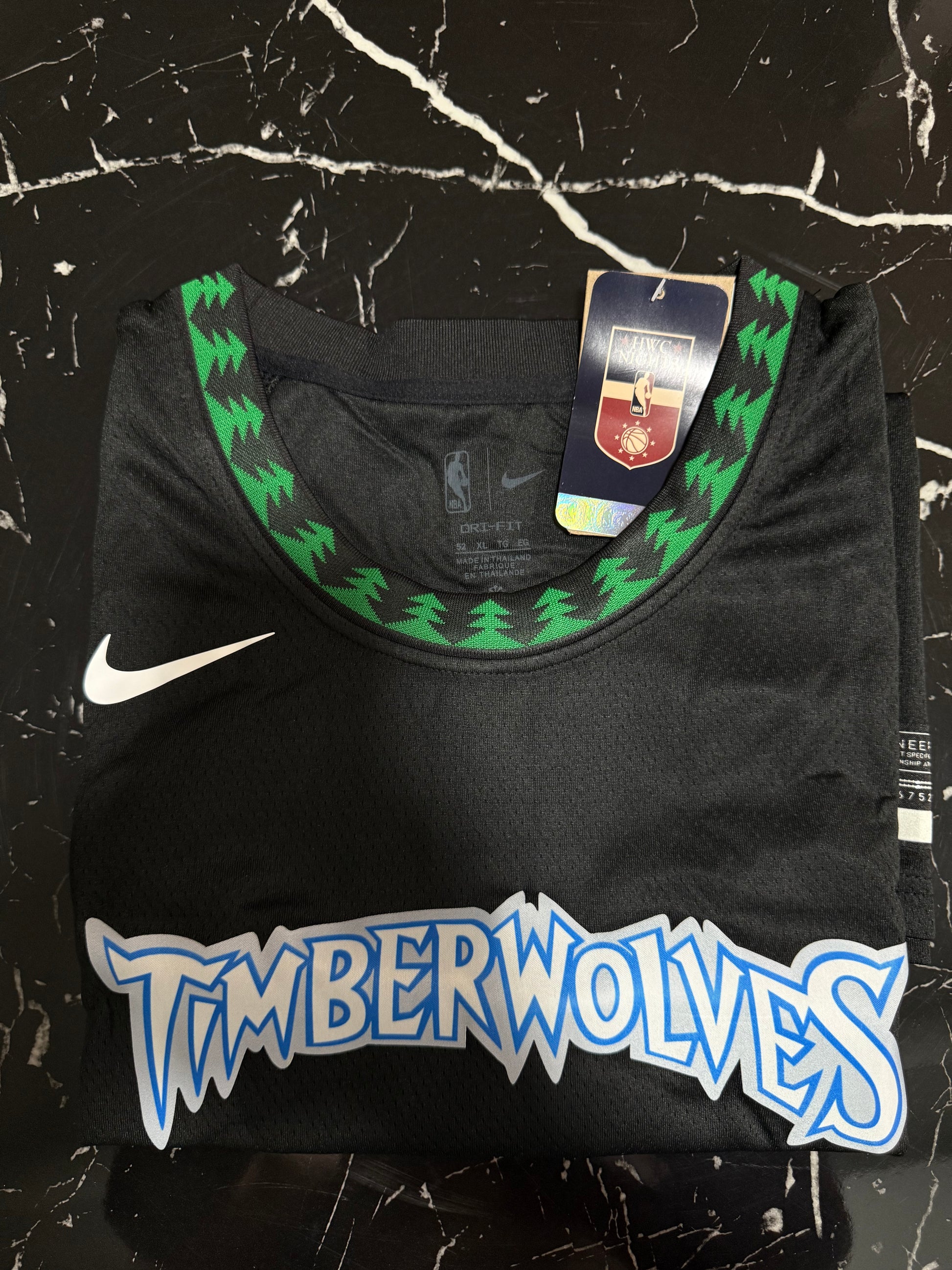 Black Minnesota Timberwolves NBA jersey with green and blue details that highlight the team's identity. Its modern design reflects the energy of a franchise that has been growing in recent years and boasts one of the most passionate fan bases in the league.