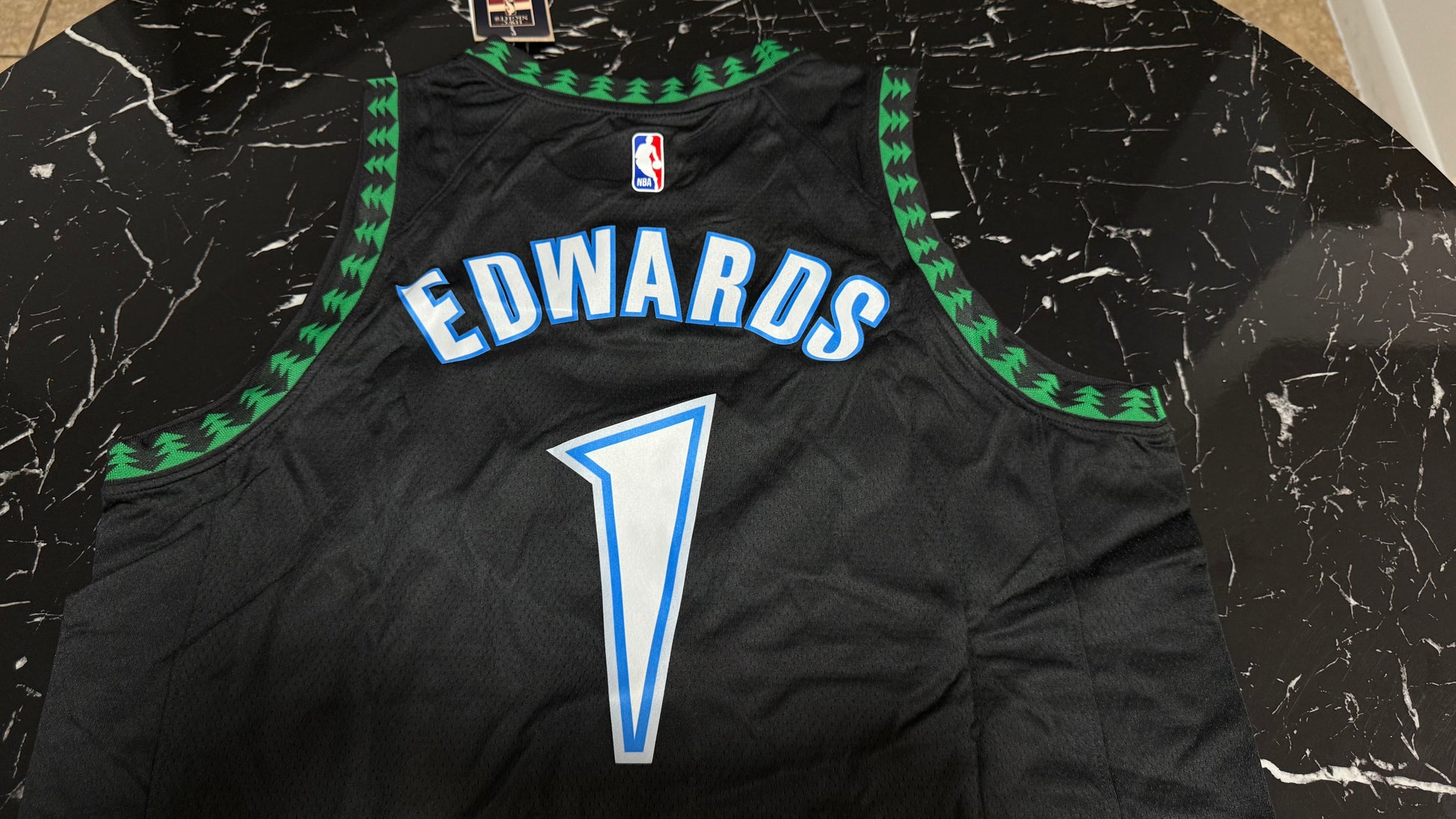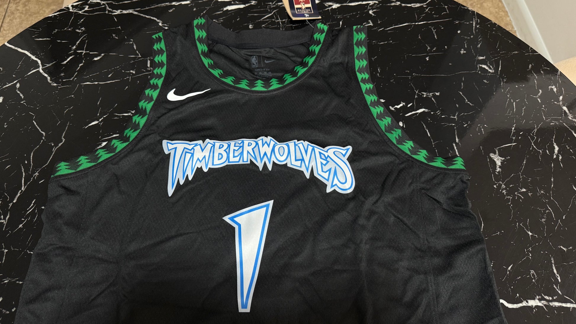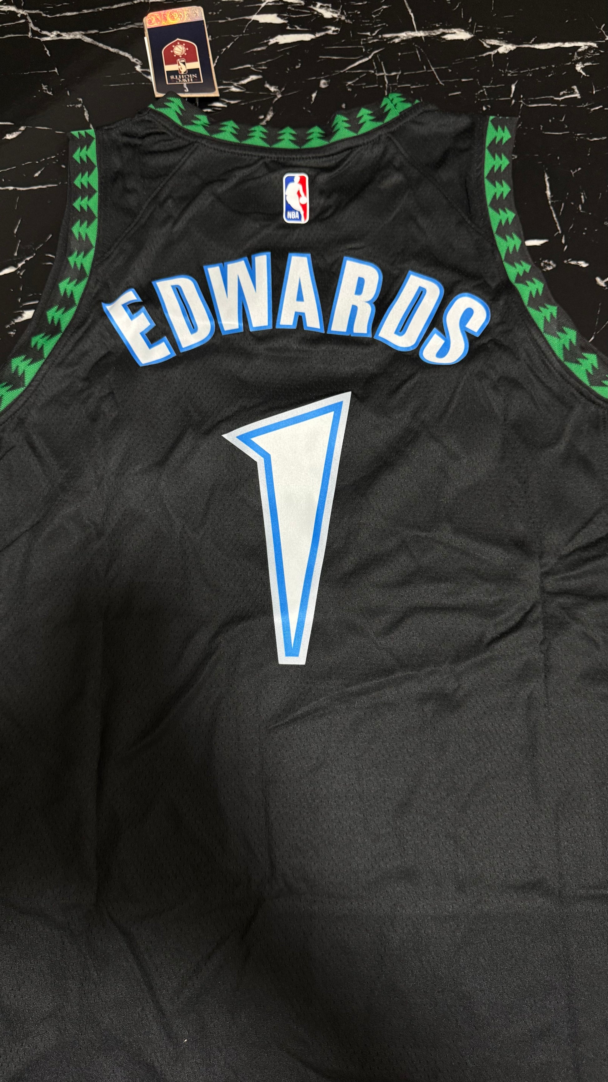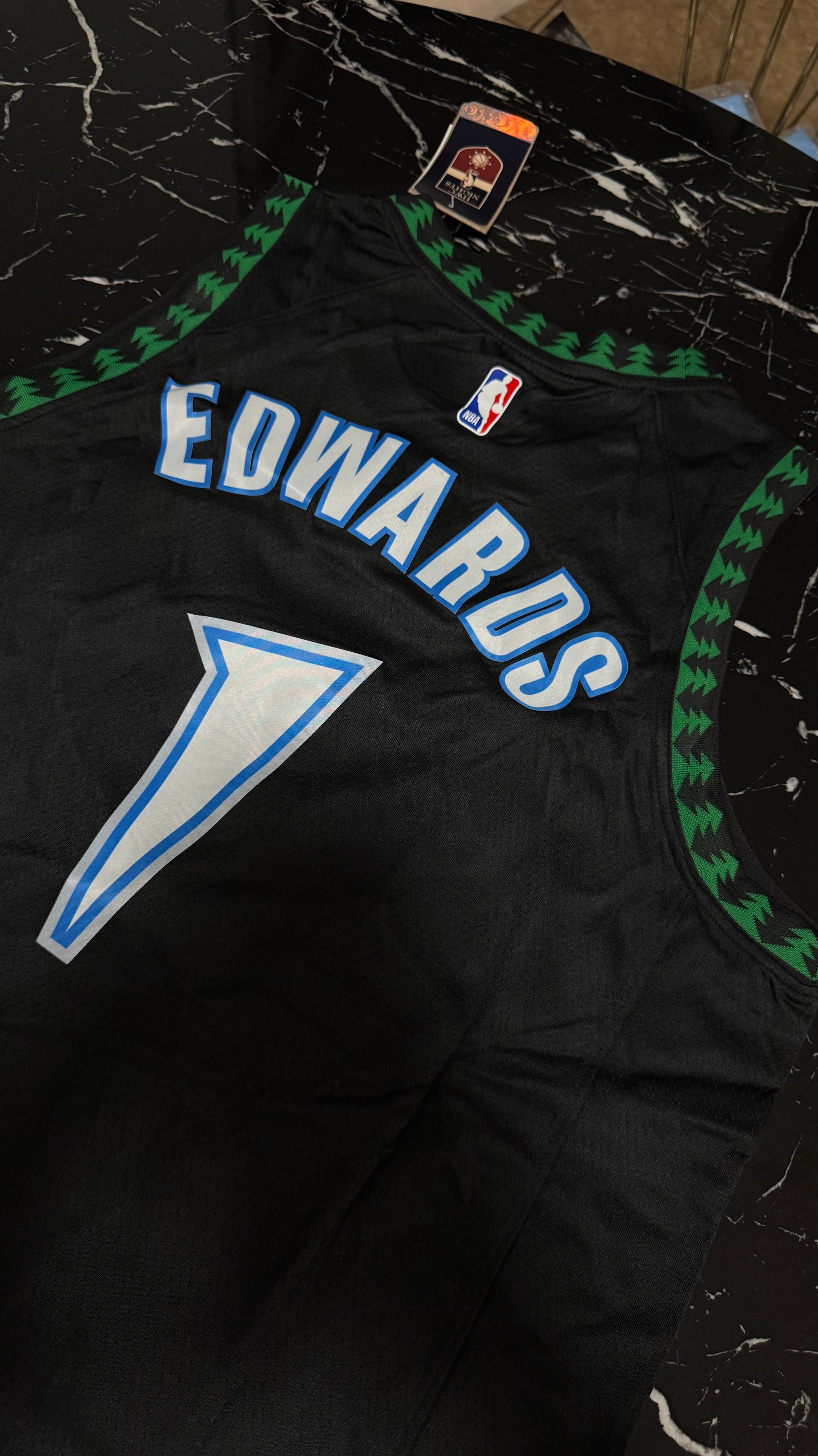 Black Minnesota Timberwolves NBA jersey with green and blue details that highlight the team's identity. Its modern design reflects the energy of a franchise that has been growing in recent years and boasts one of the most passionate fan bases in the league.