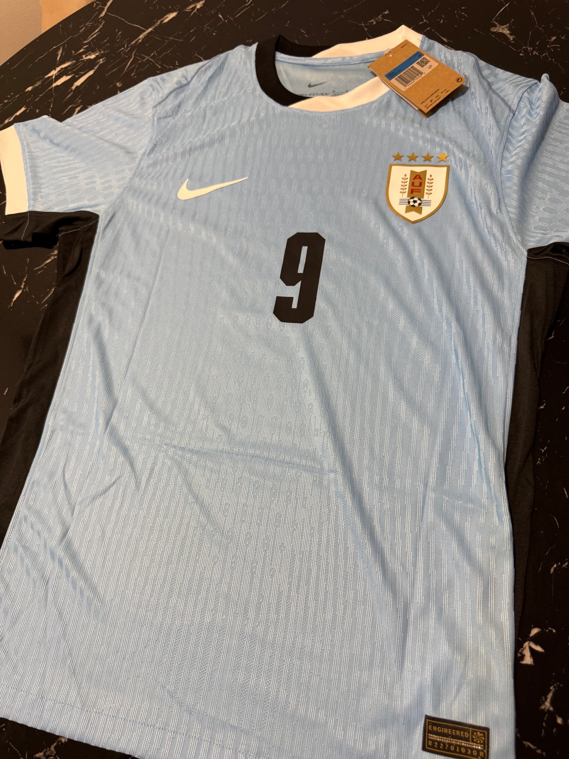 Uruguay home jersey in player version, the only unit available in size M , personalized with the name and number of Luis Suárez #9 , the Celeste's all-time top scorer.