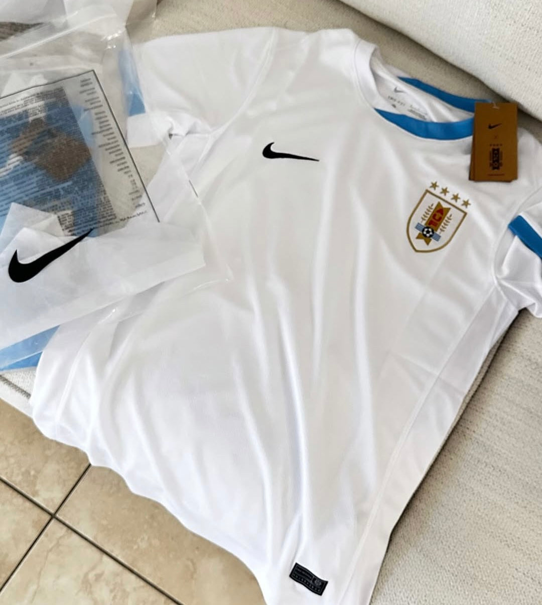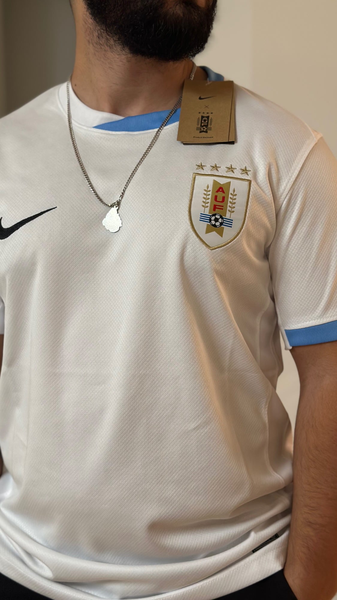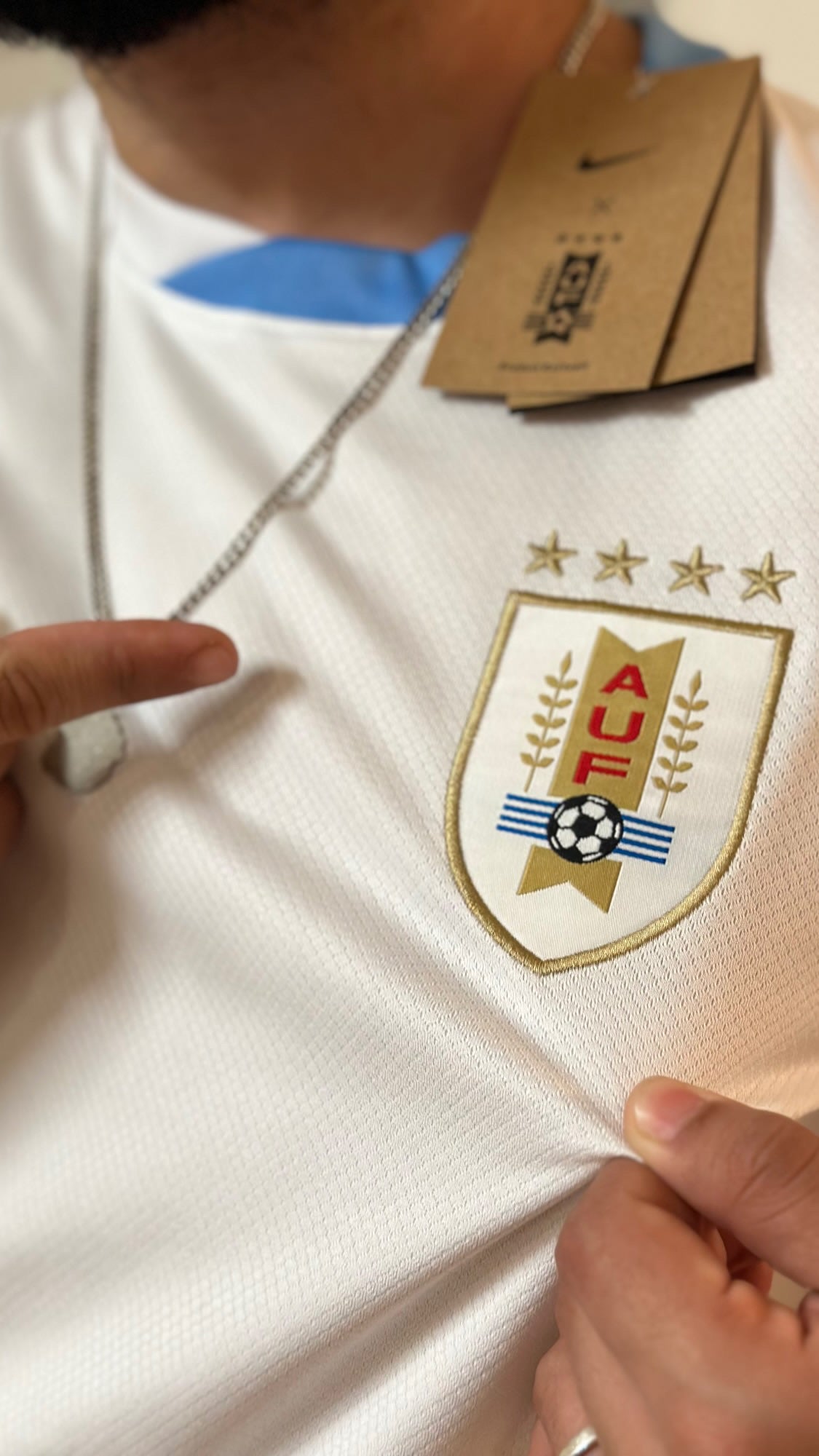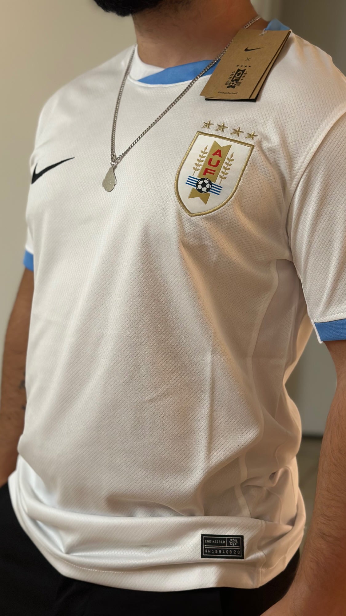 Uruguay's 2024/25 away jersey, a fan version, manufactured by Nike and presented in white with light blue and black details that give it an elegant and contemporary style. This model accompanies the Celeste on the road to the Copa América and the 2026 World Cup, reinforcing the identity of a country with history and determination.