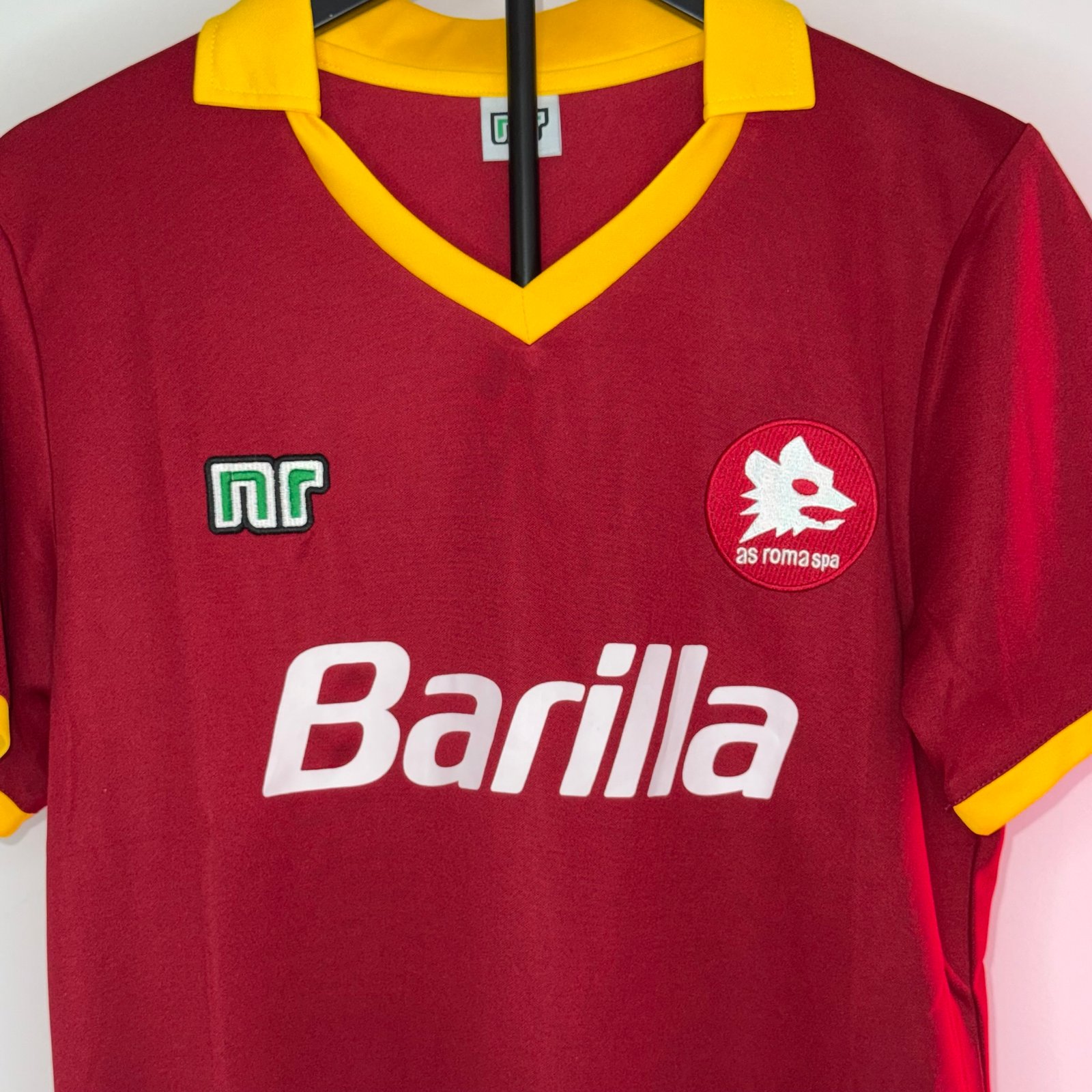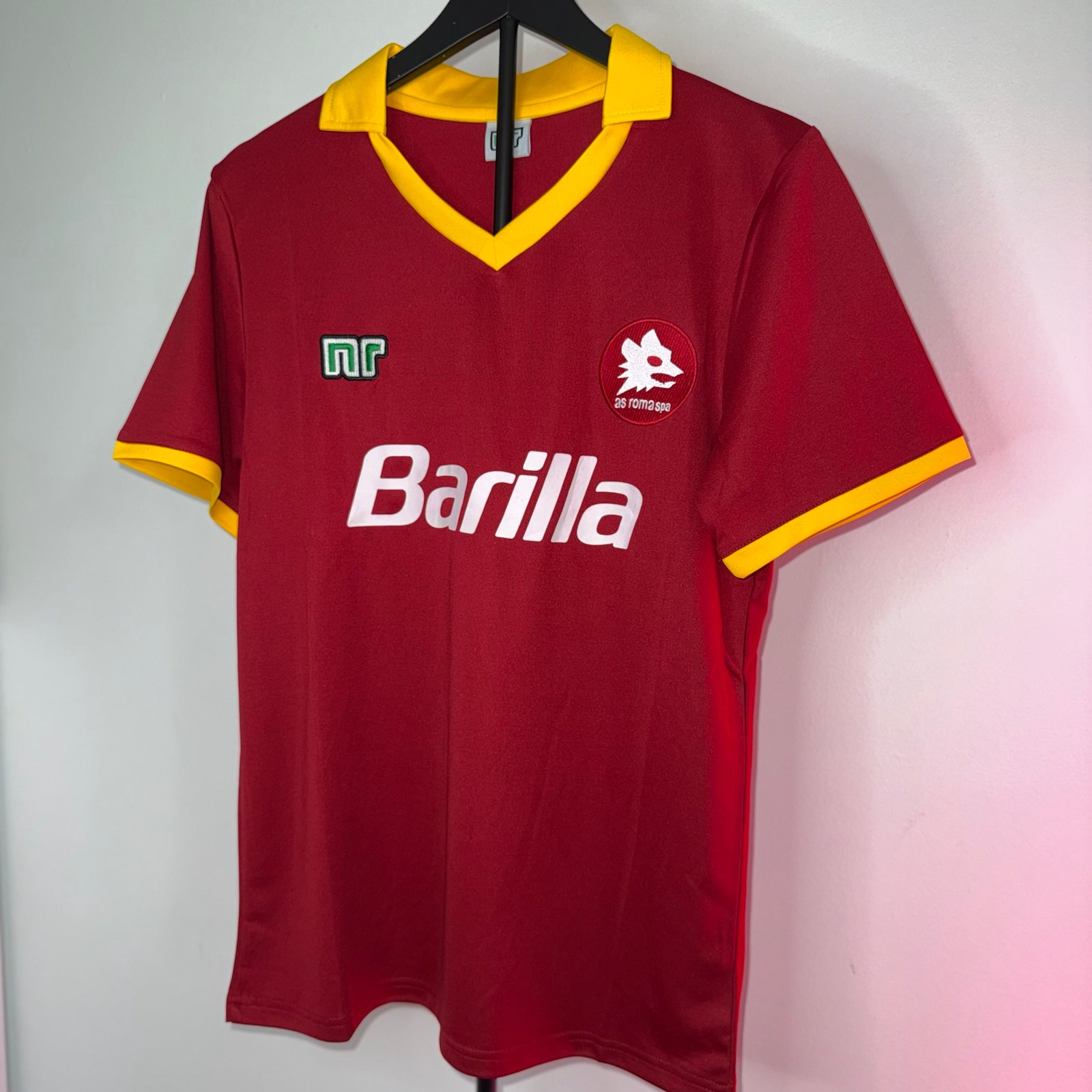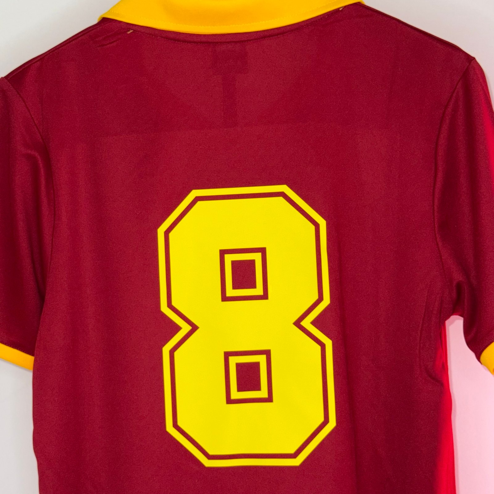 La camiseta local de la AS Roma 1989/90 es una pieza clásica del fútbol italiano de finales de los años 80. Presenta la tradicional base roja (giallorossa) con detalles en amarillo, un diseño limpio y elegante que representa una etapa muy reconocible de la historia del club.