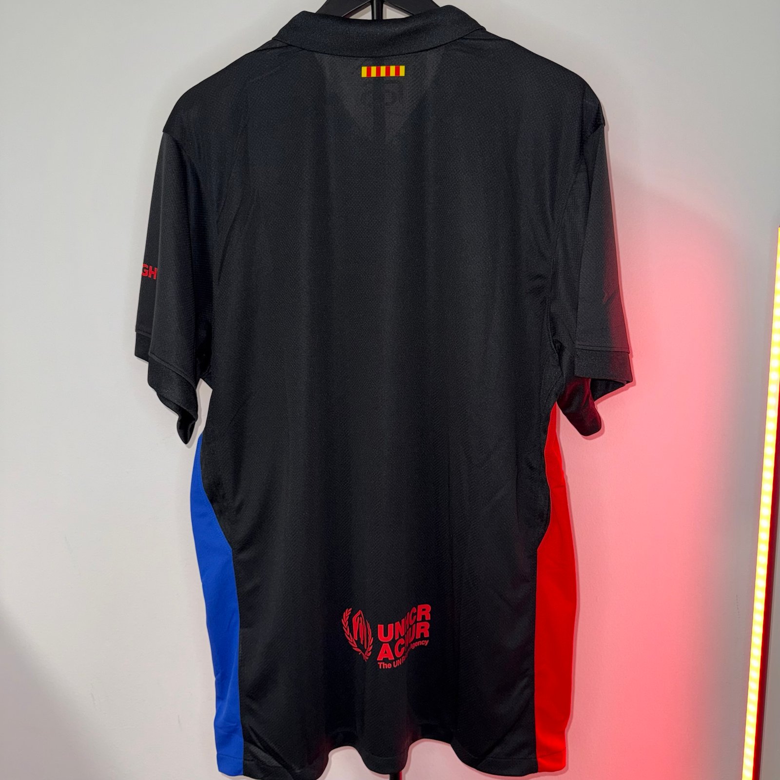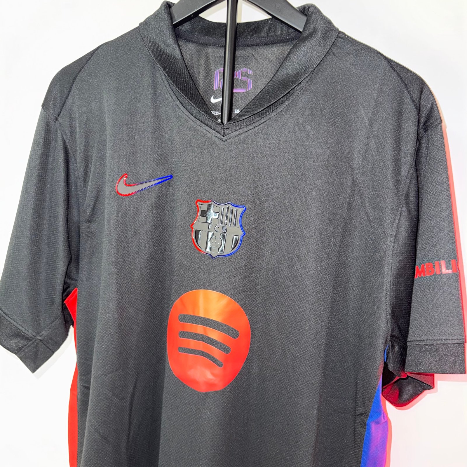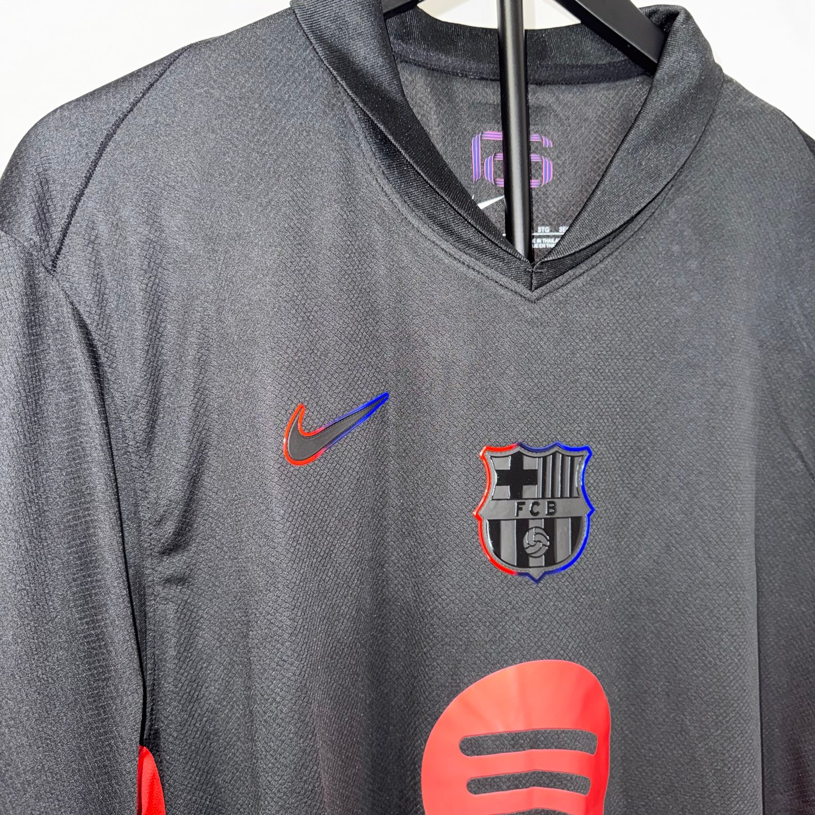 El diseño destaca por su base negra con detalles en rojo y azul en los laterales, manteniendo la identidad del FC Barcelona de forma sutil pero reconocible. El escudo monocromático con contorno en colores aporta un look elegante y contemporáneo, mientras que el sponsor en rojo genera un contraste fuerte y llamativo.