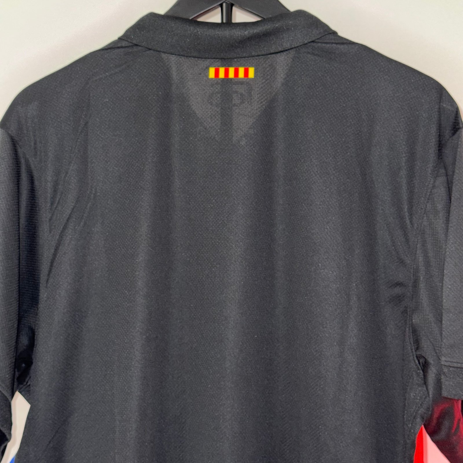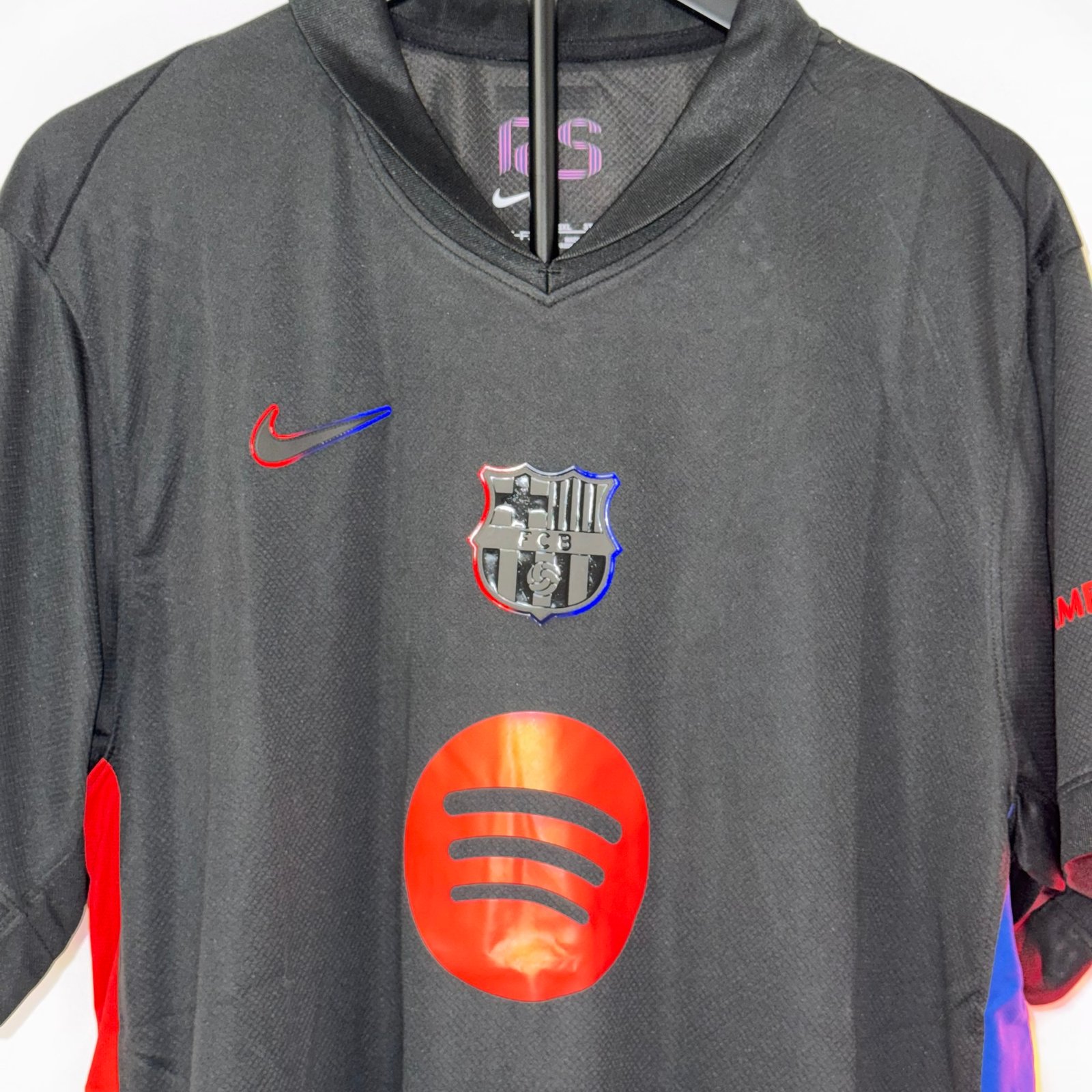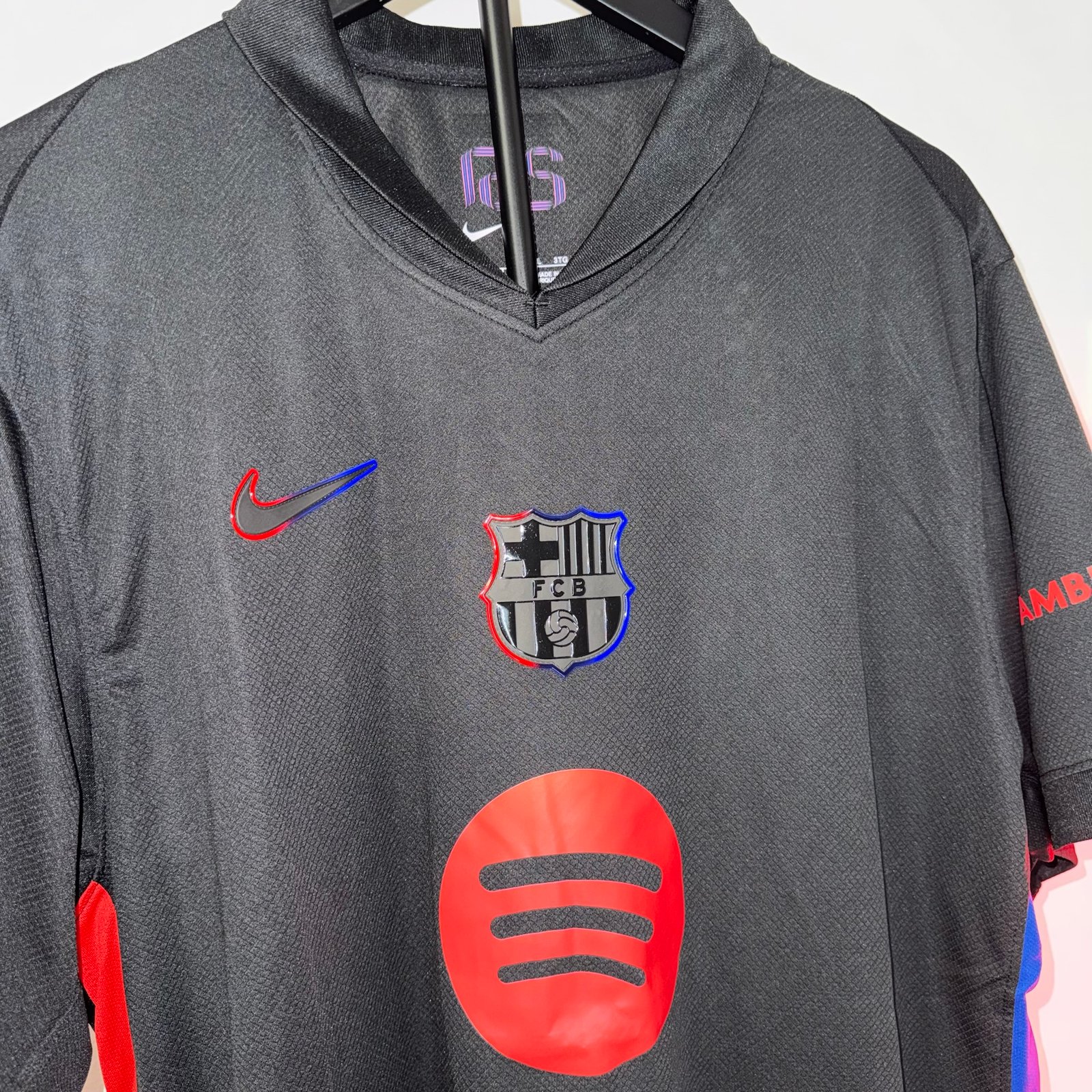 El diseño destaca por su base negra con detalles en rojo y azul en los laterales, manteniendo la identidad del FC Barcelona de forma sutil pero reconocible. El escudo monocromático con contorno en colores aporta un look elegante y contemporáneo, mientras que el sponsor en rojo genera un contraste fuerte y llamativo.