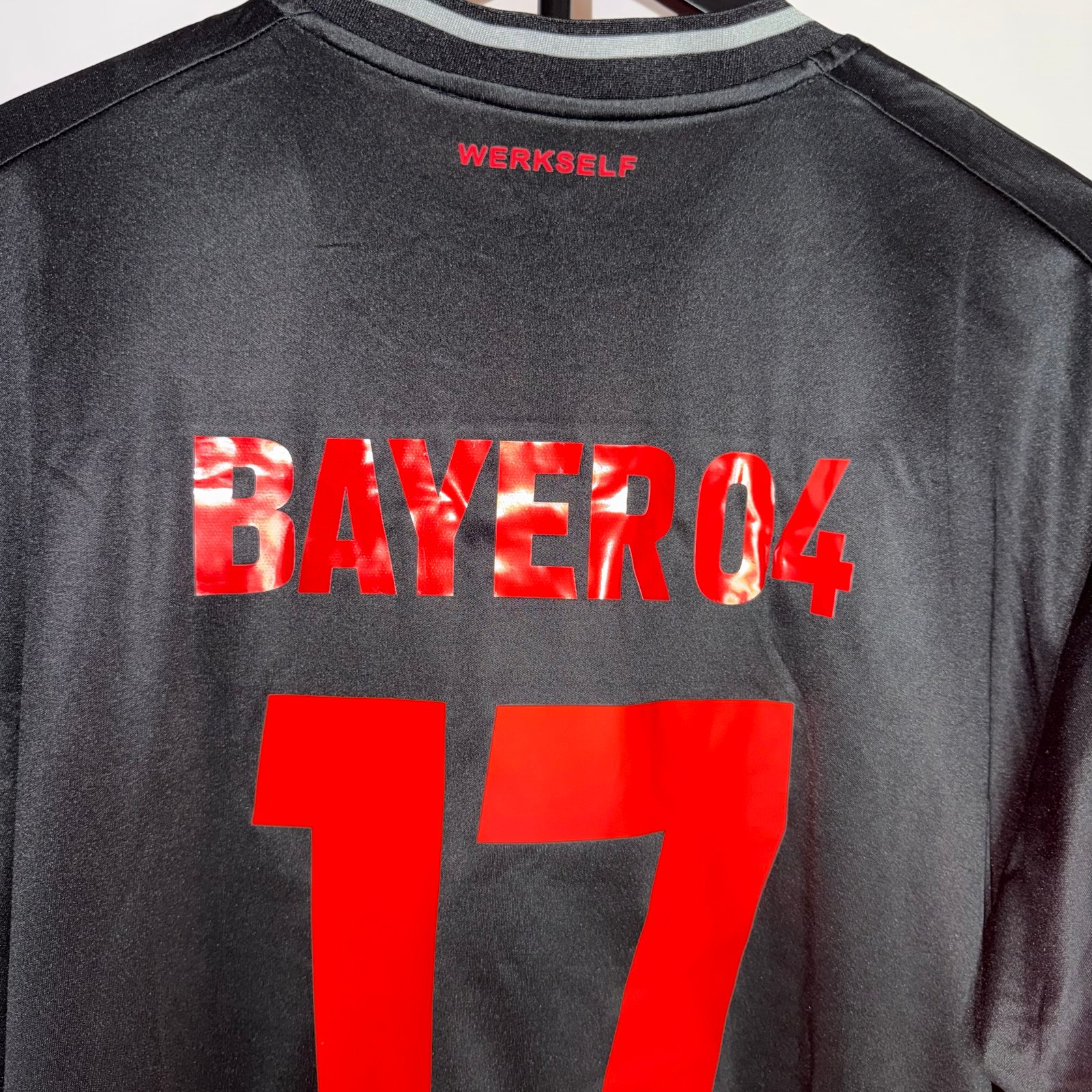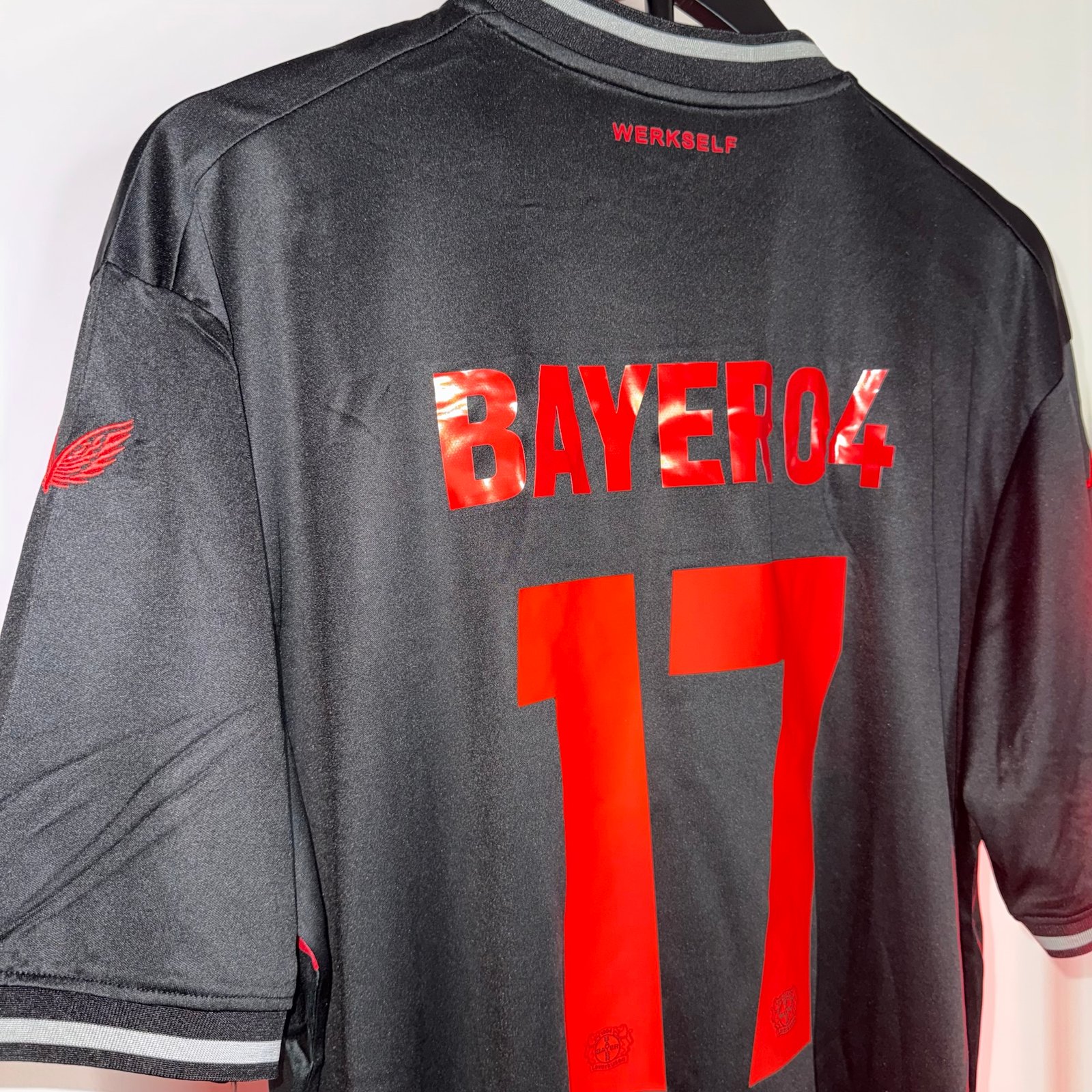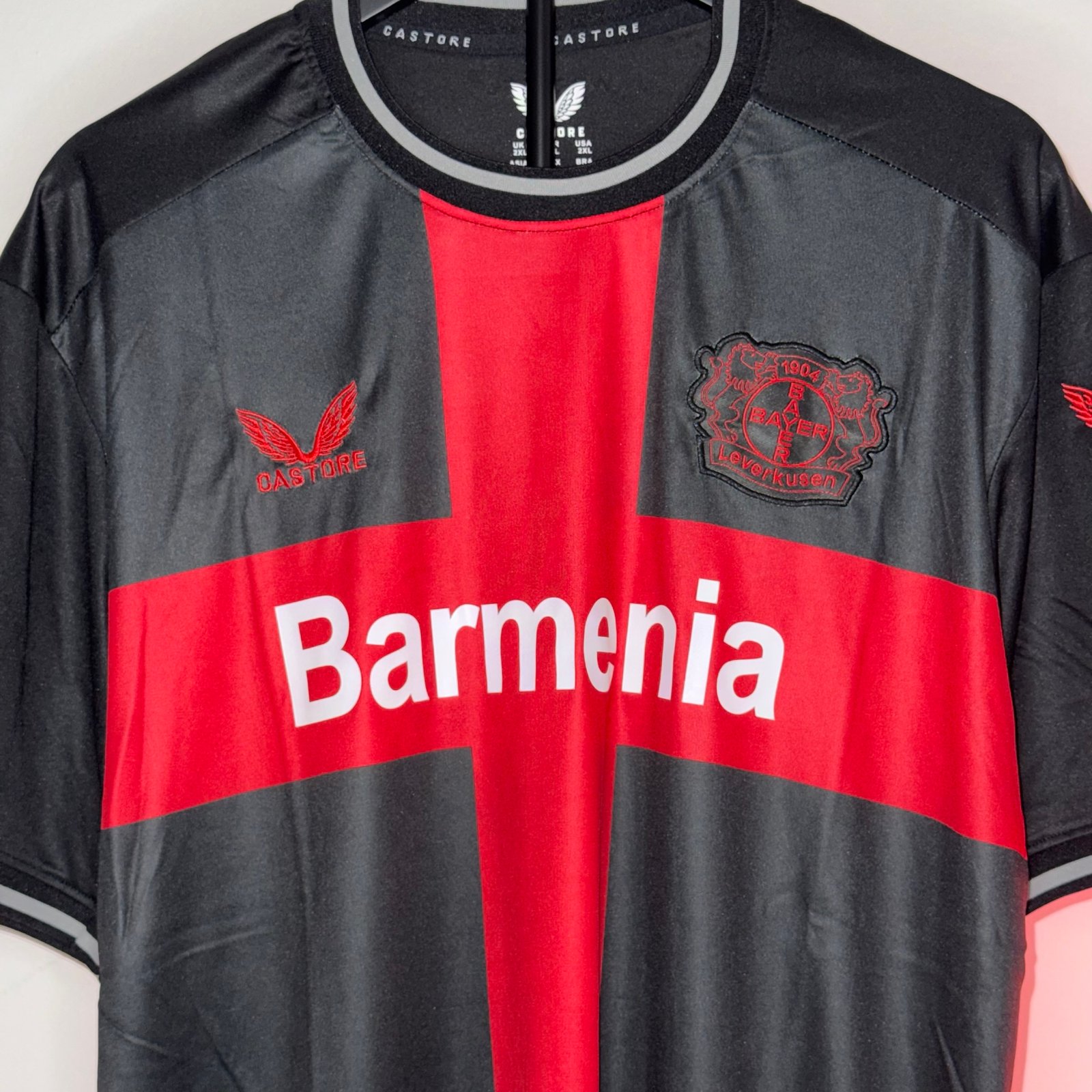 El modelo combina una base negra con una imponente cruz roja en el pecho, generando un look único que transmite carácter, intensidad y presencia en cancha. Este diseño se convirtió rápidamente en una de las camisetas más reconocibles del Bayer 04 Leverkusen durante una temporada histórica para el club.