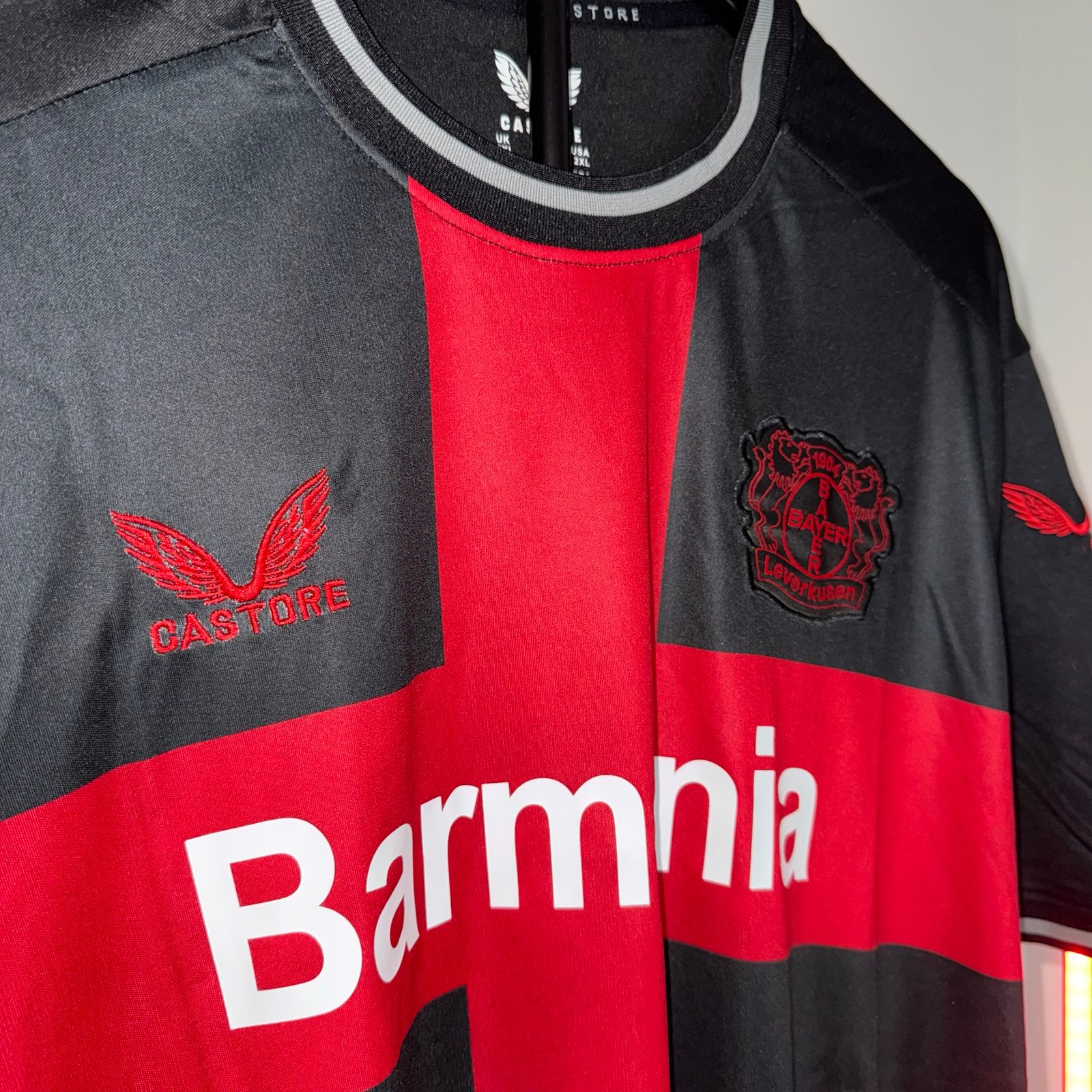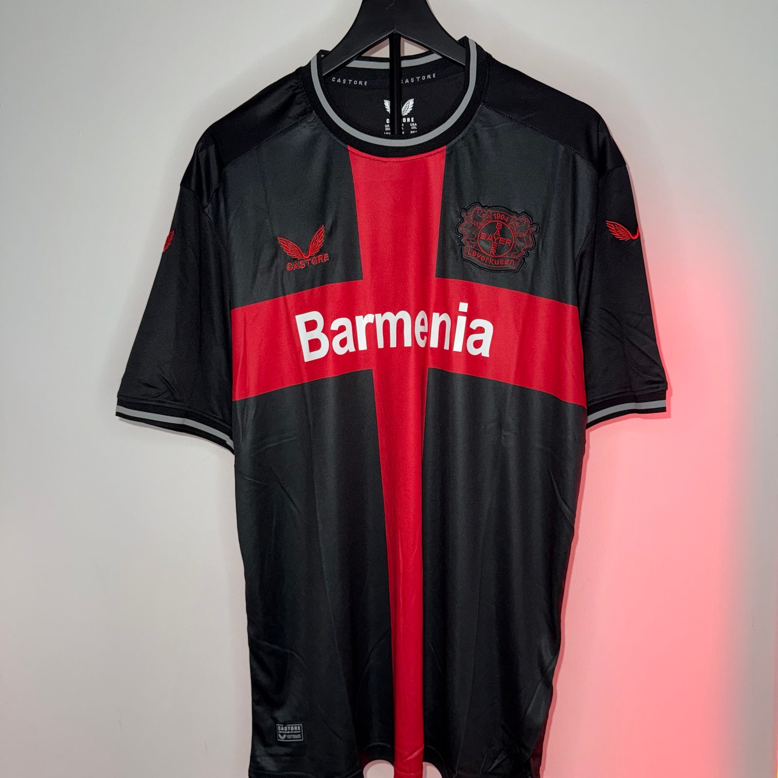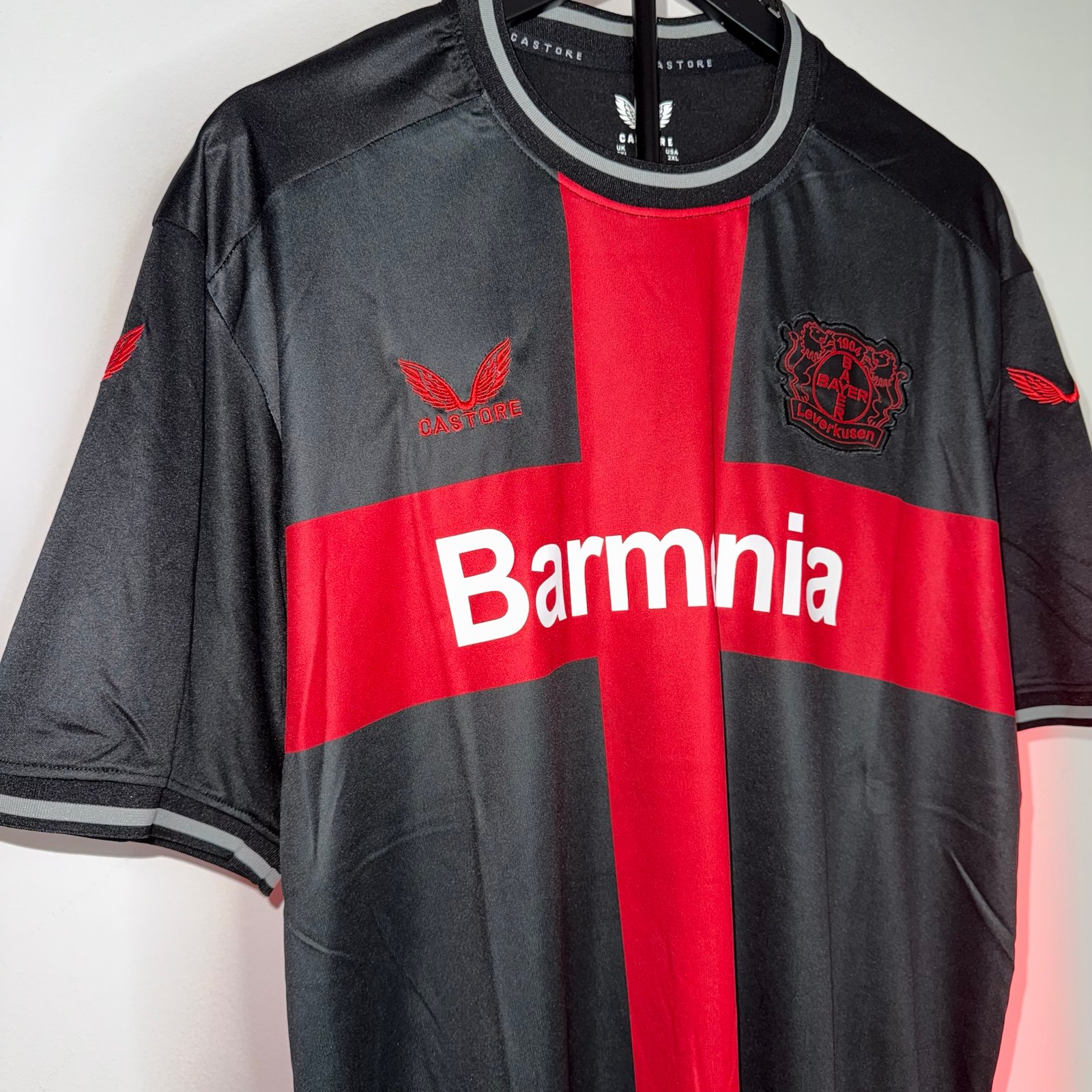 El modelo combina una base negra con una imponente cruz roja en el pecho, generando un look único que transmite carácter, intensidad y presencia en cancha. Este diseño se convirtió rápidamente en una de las camisetas más reconocibles del Bayer 04 Leverkusen durante una temporada histórica para el club.