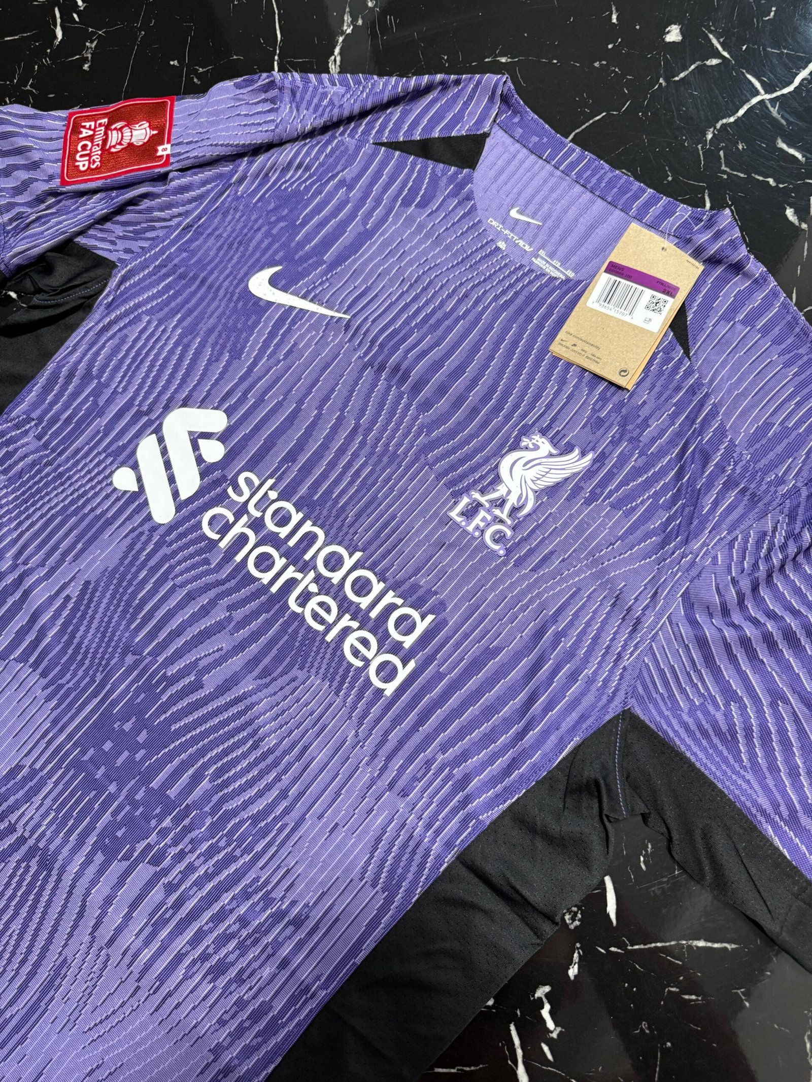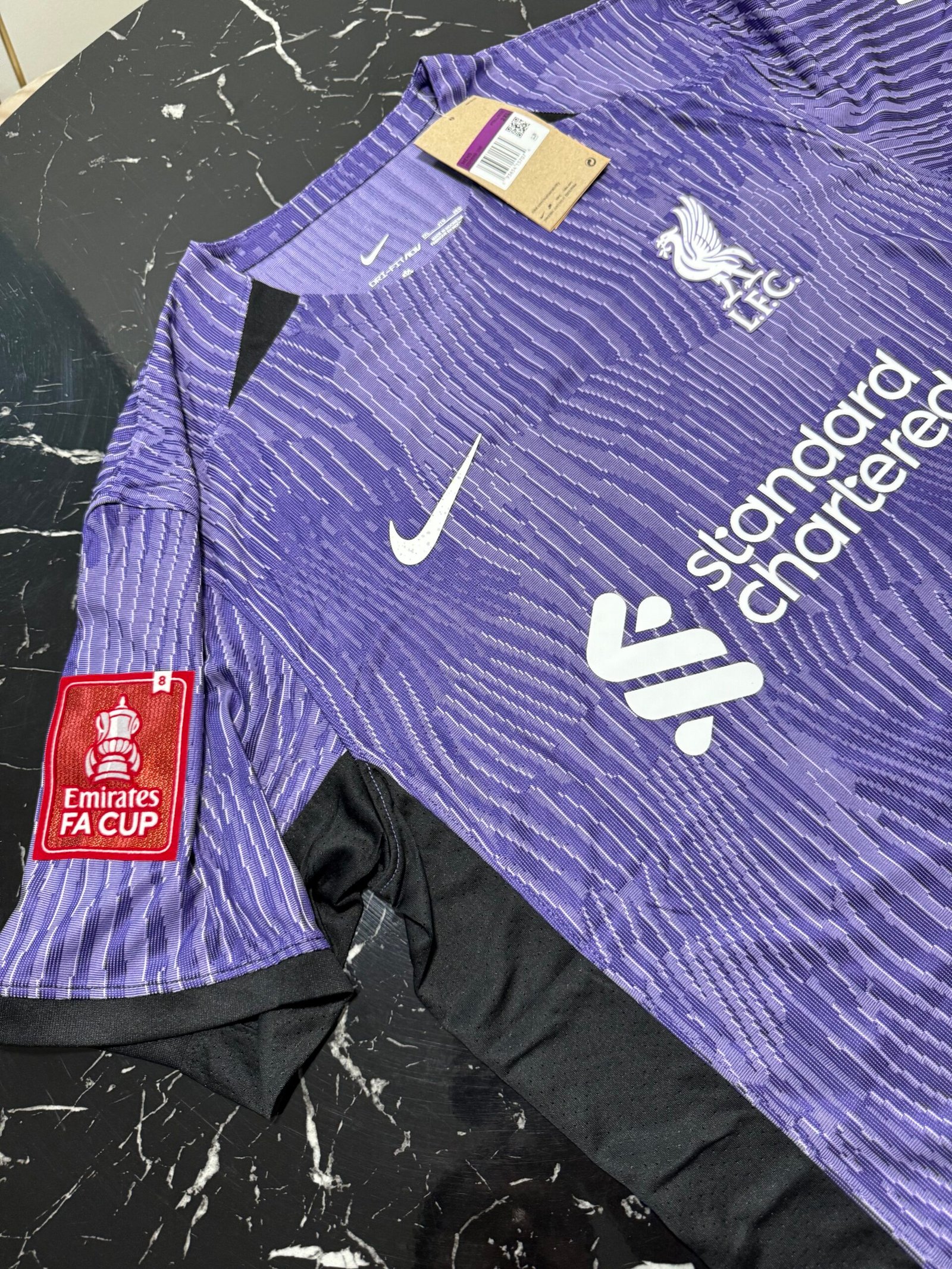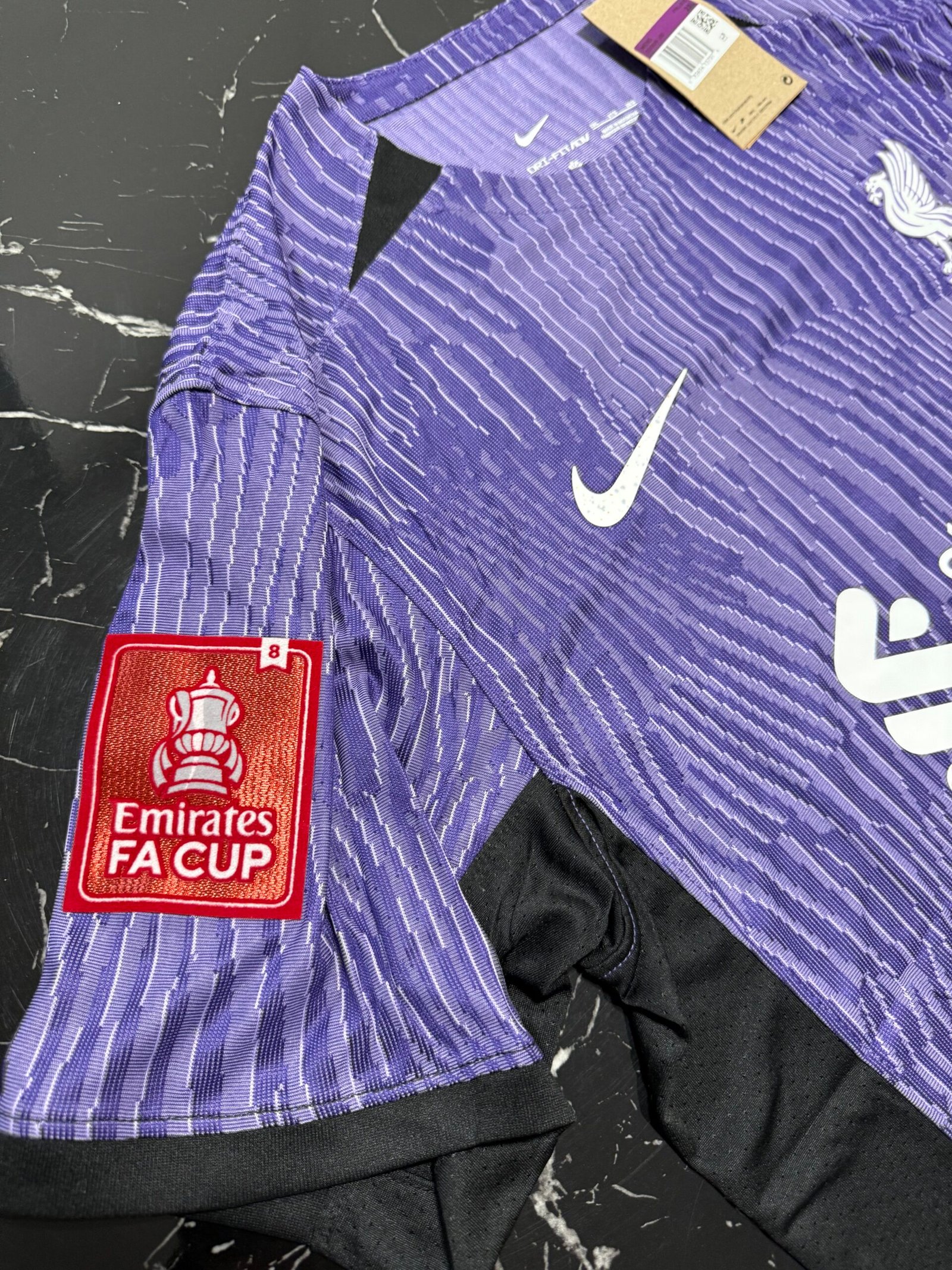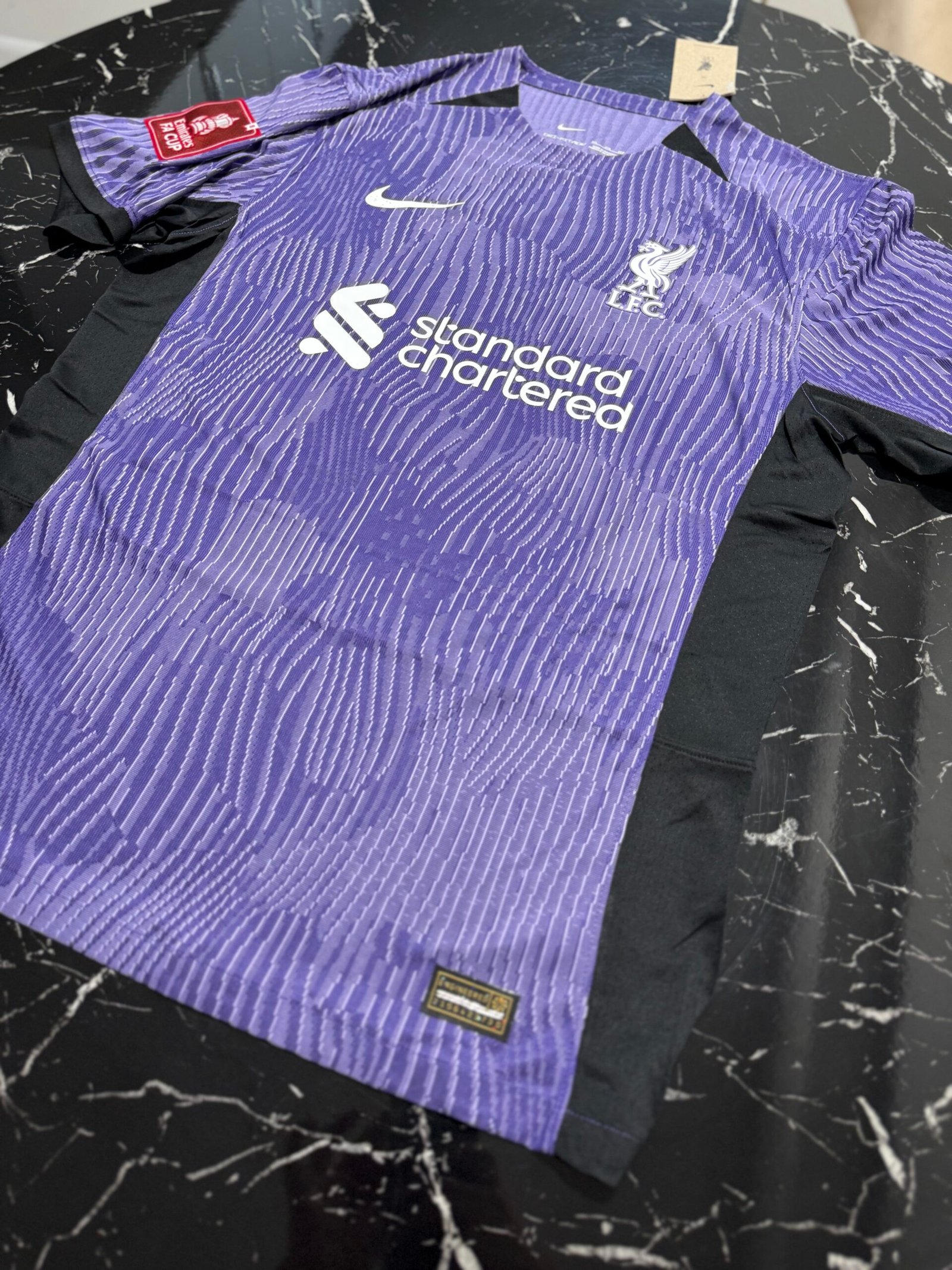 Camiseta alternativa morada del Liverpool 2023/24 en versión jugador, con calce ajustado y tejido técnico liviano.