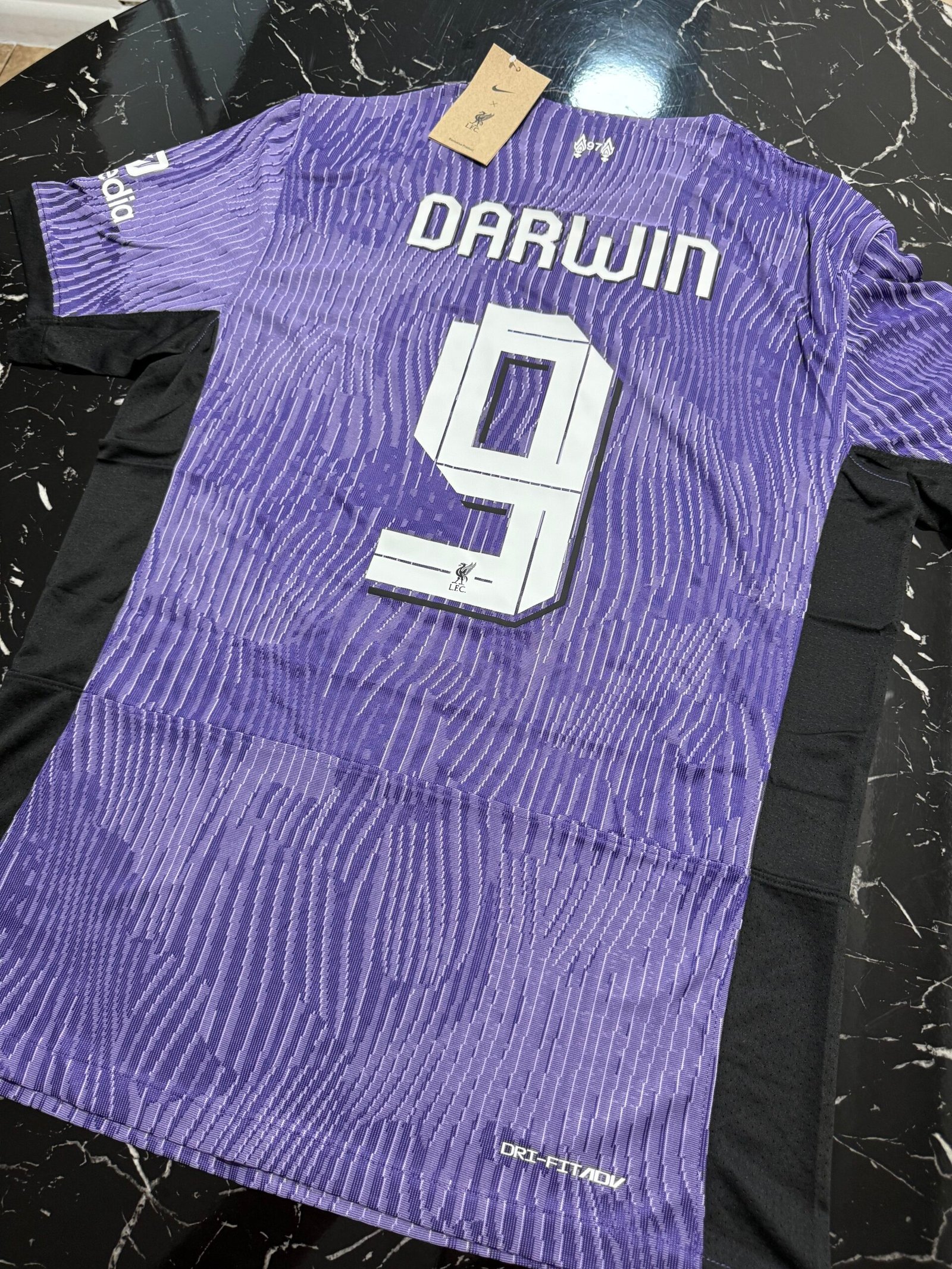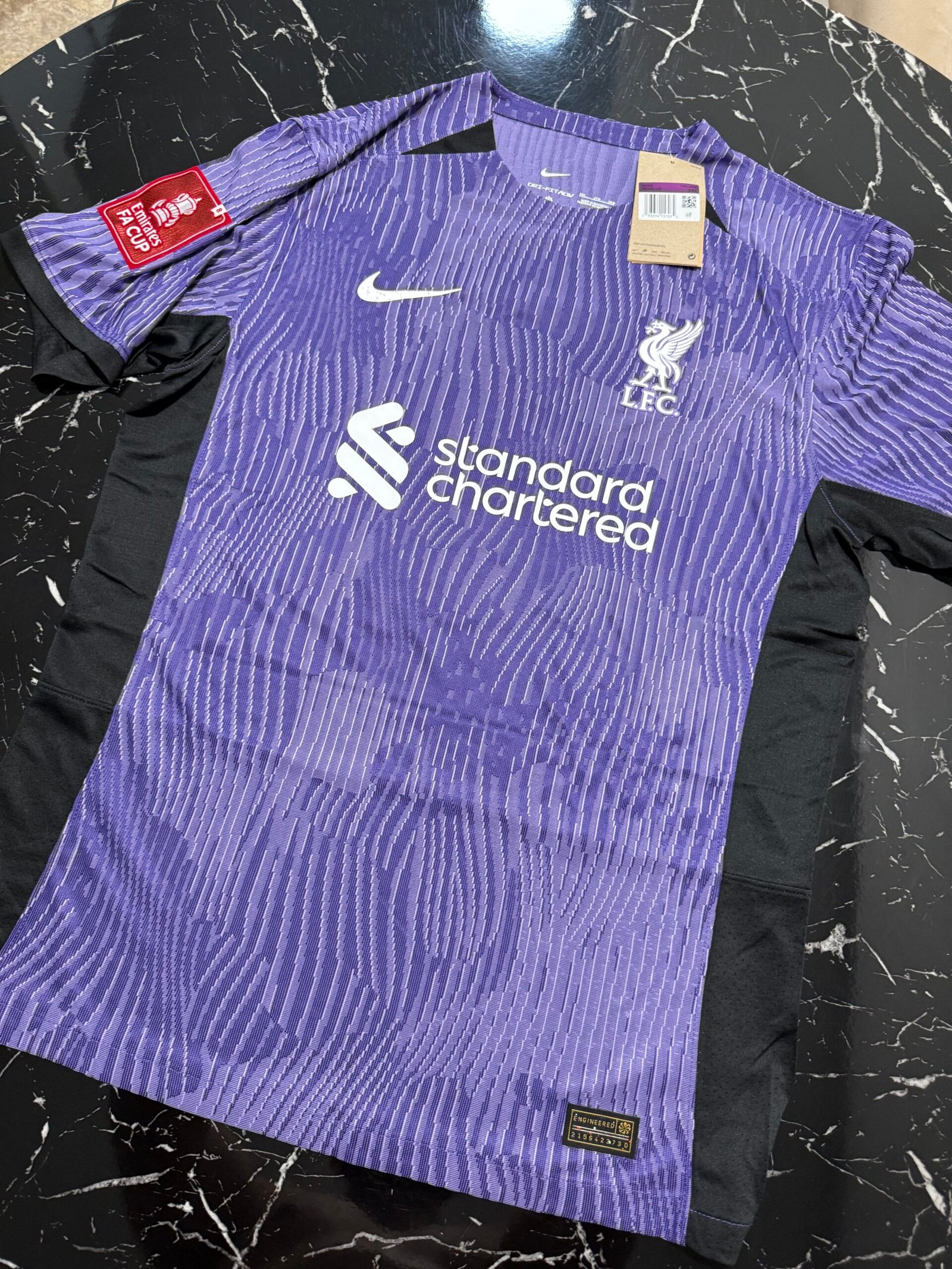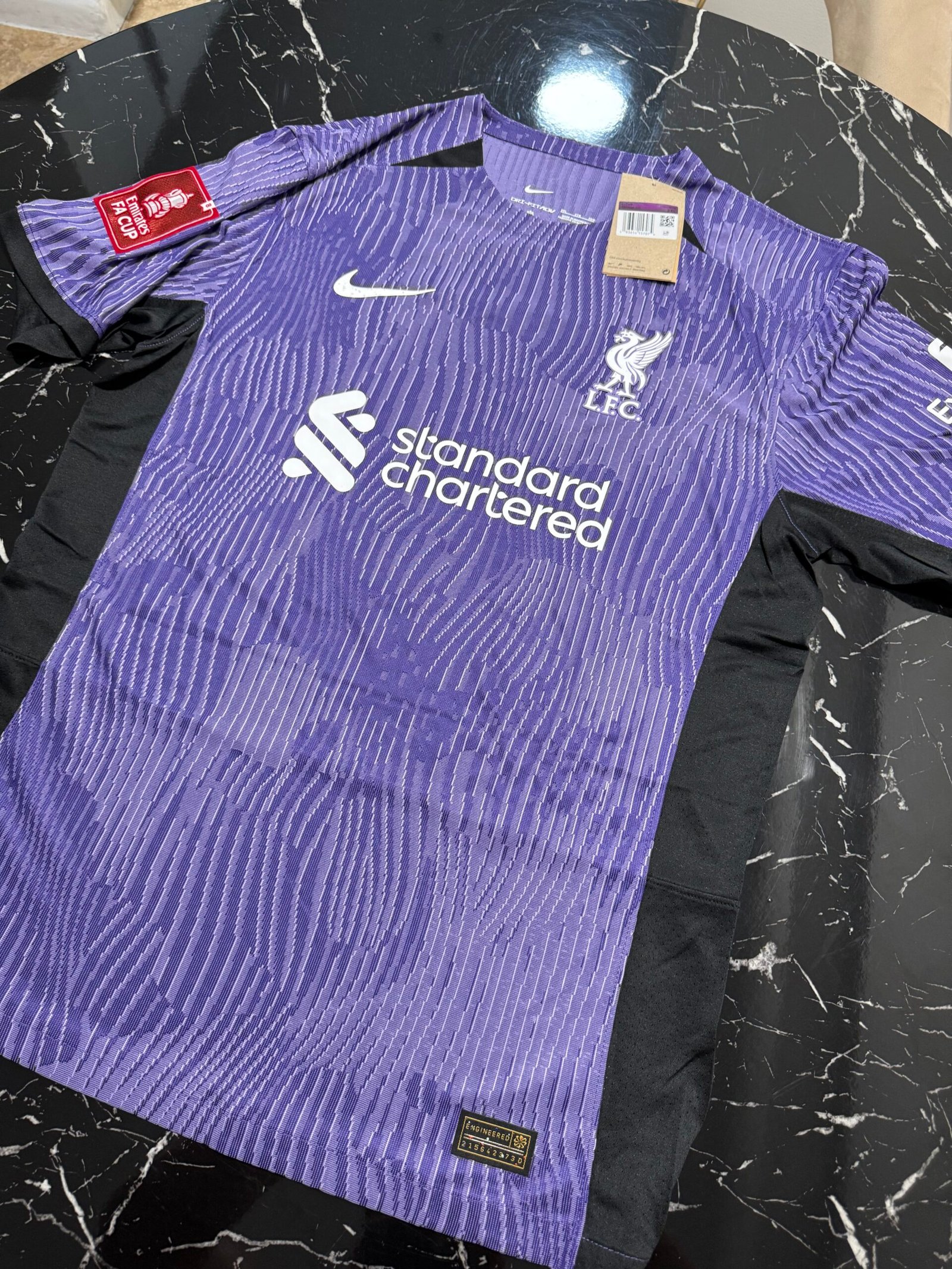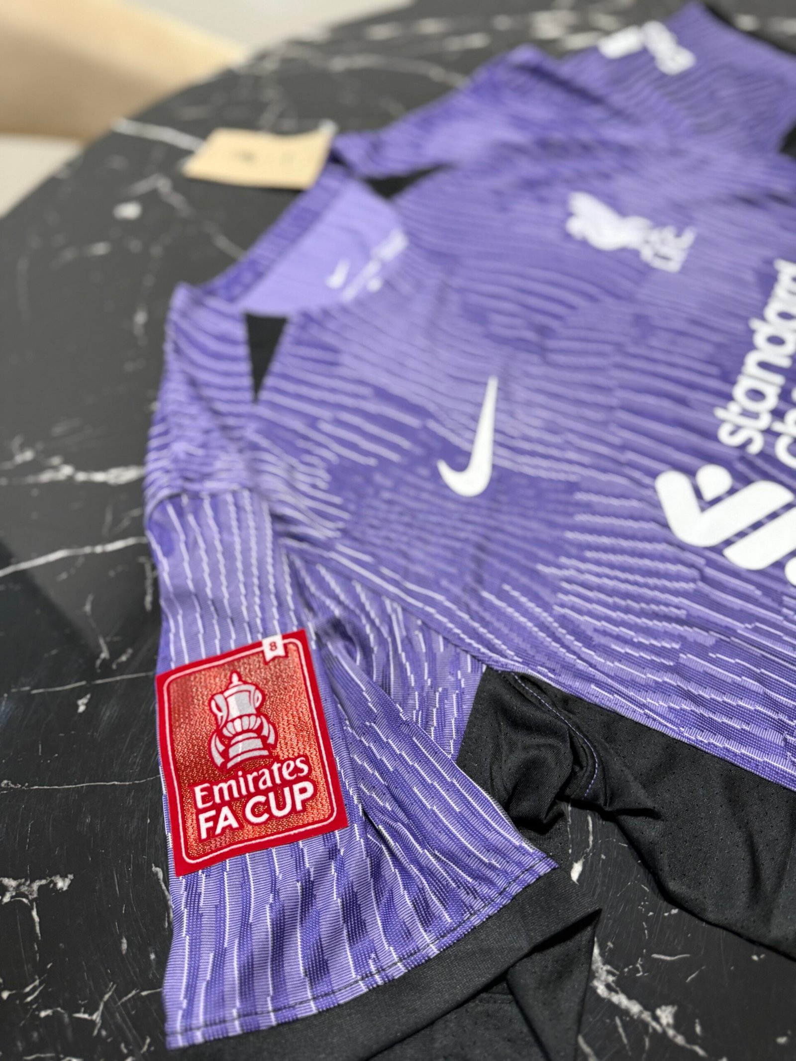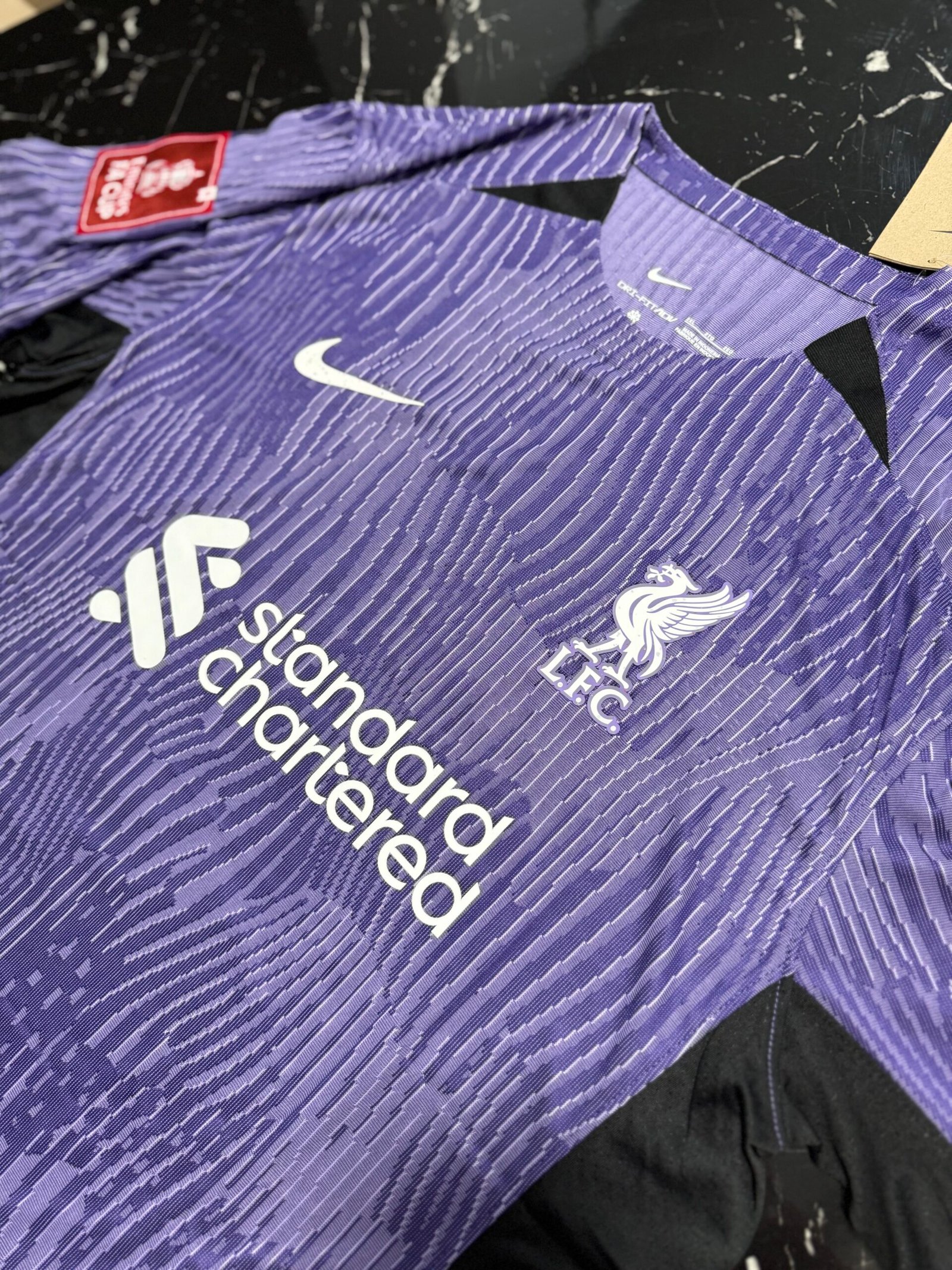 Camiseta alternativa morada del Liverpool 2023/24 en versión jugador, con calce ajustado y tejido técnico liviano.