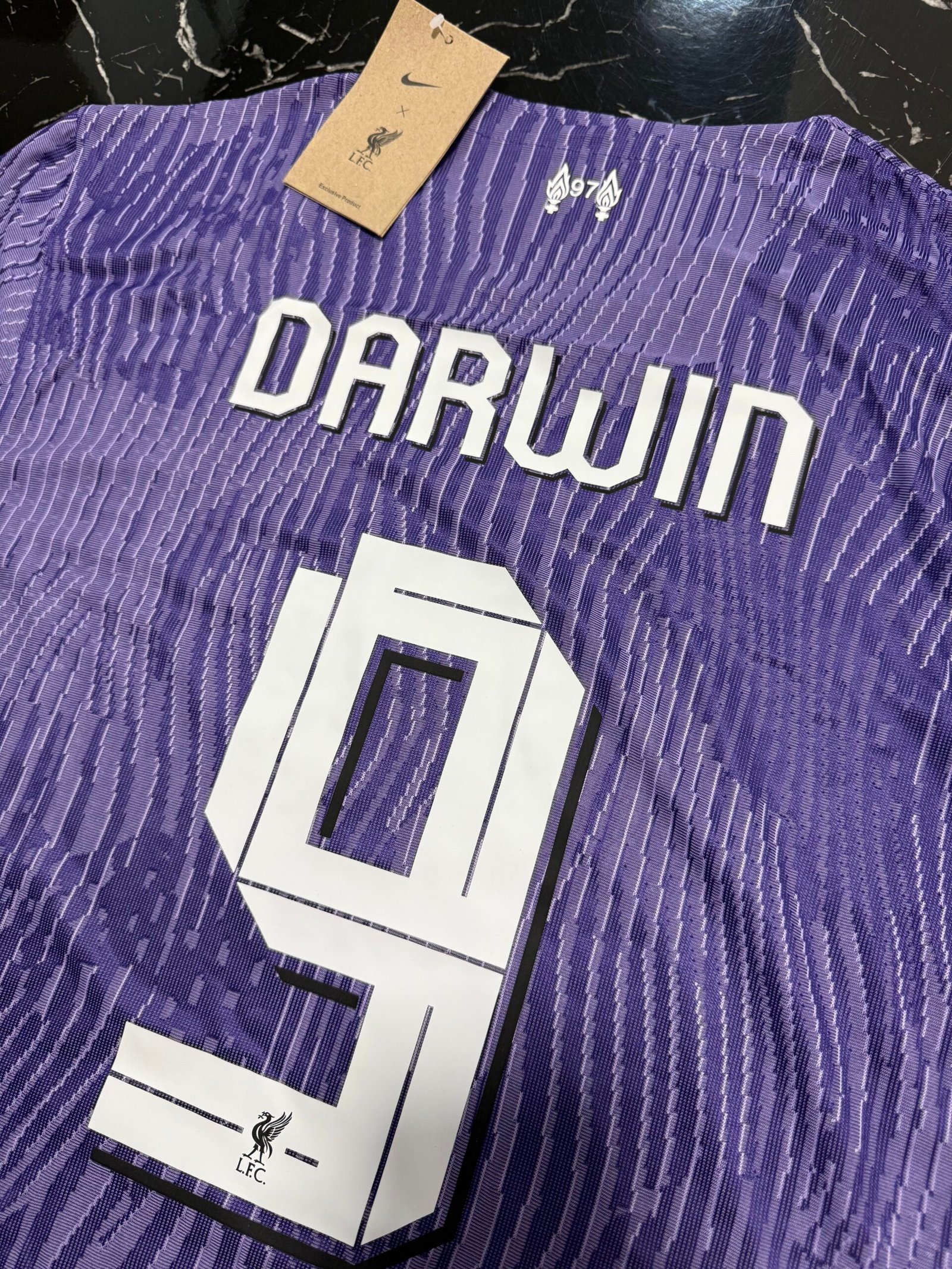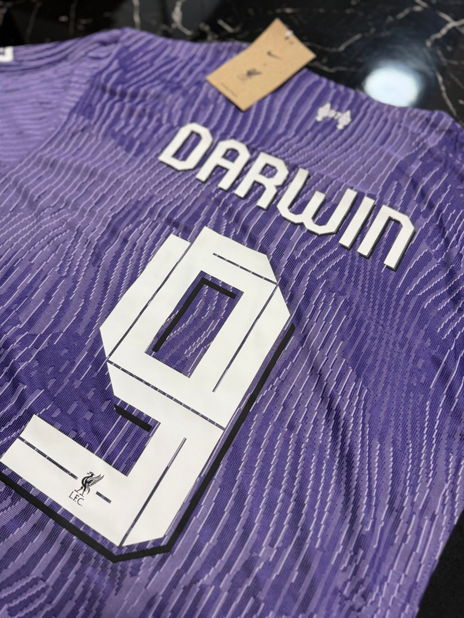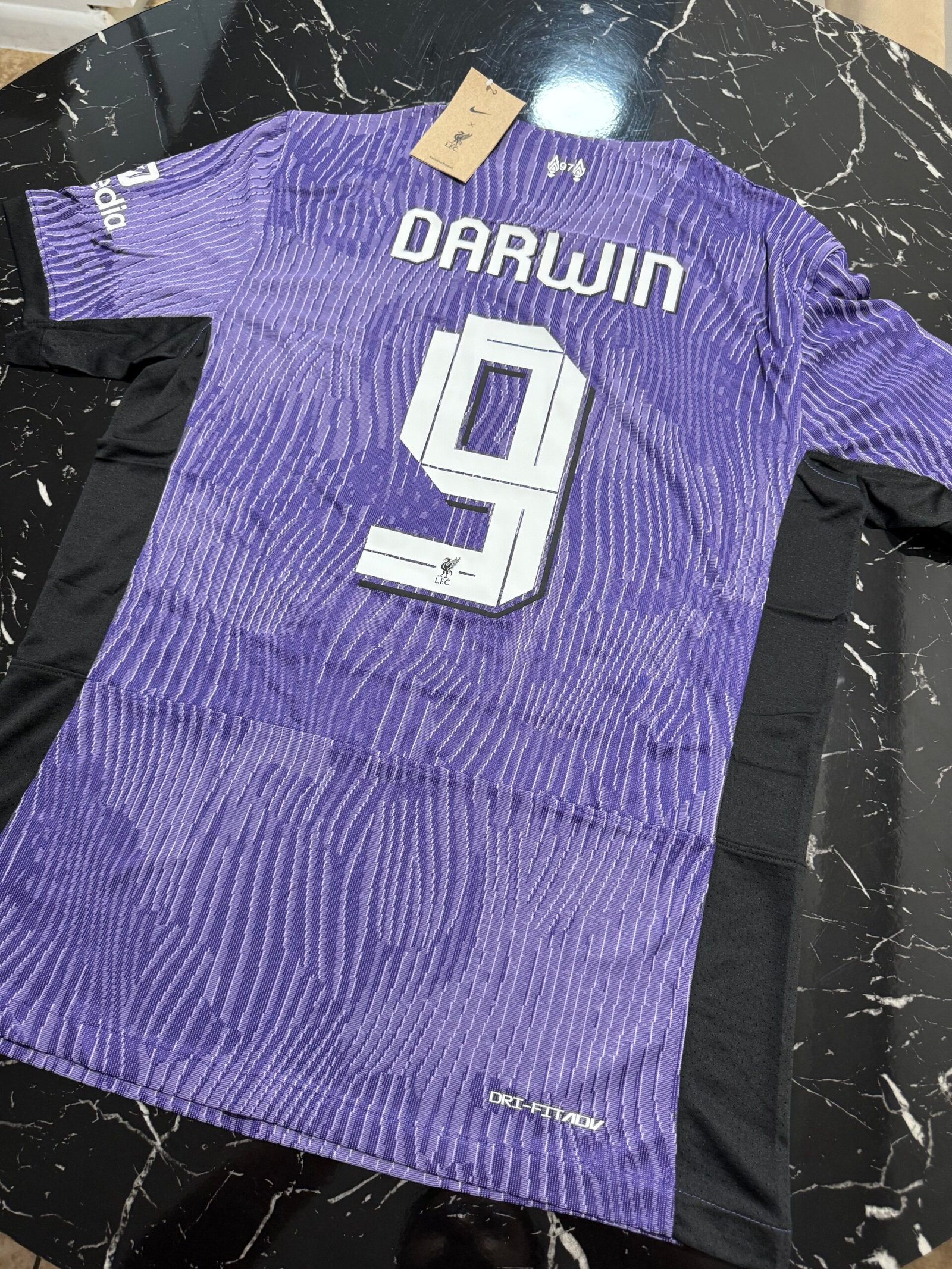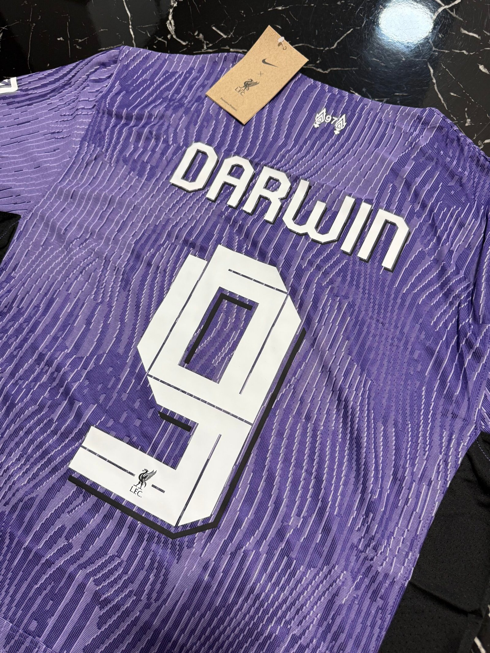Camiseta alternativa morada del Liverpool 2023/24 en versión jugador, con calce ajustado y tejido técnico liviano.