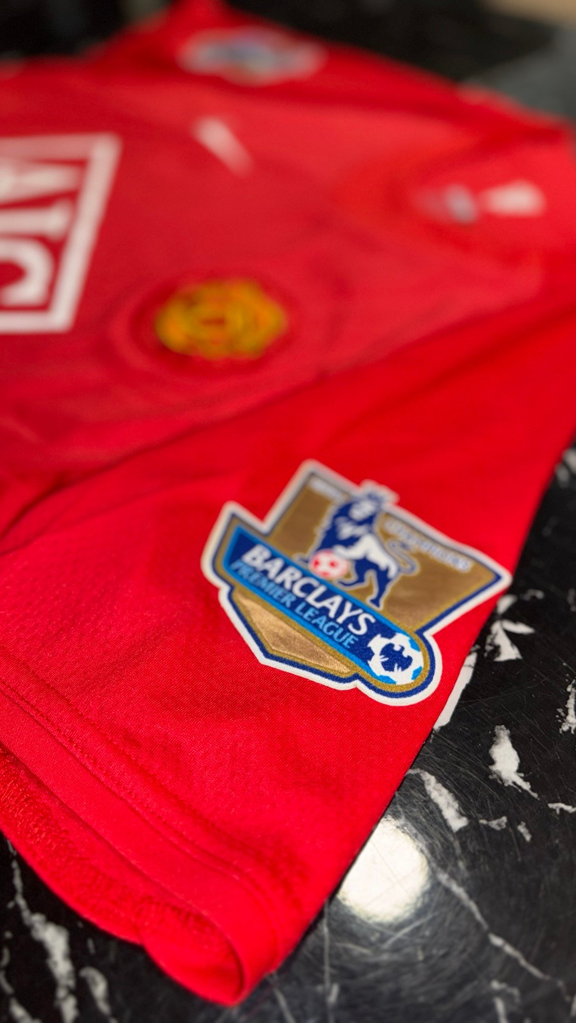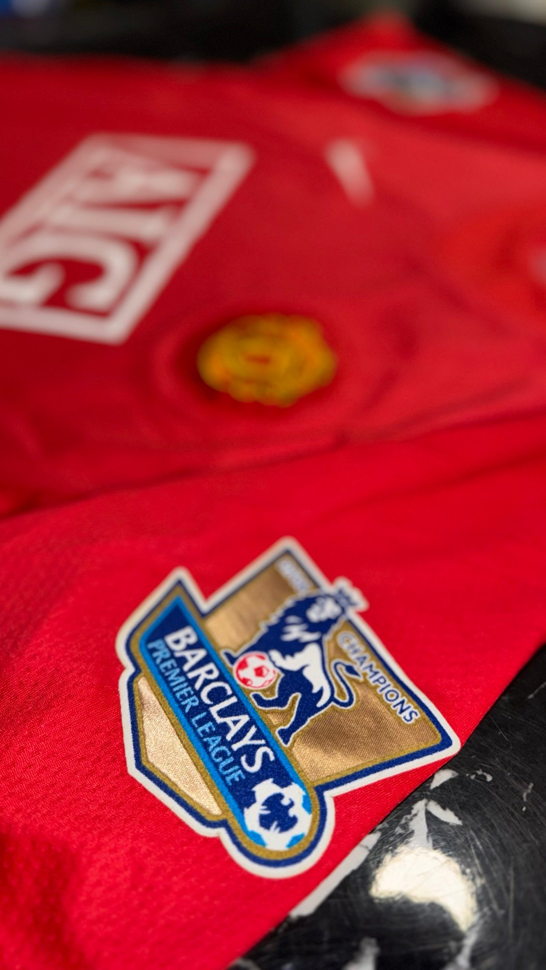 El diseño presenta la clásica base roja, con cuello en V negro y detalles sutiles que le dan una estética elegante y potente. Esta camiseta quedó asociada a una de las generaciones más dominantes del club bajo la dirección de Sir Alex Ferguson.