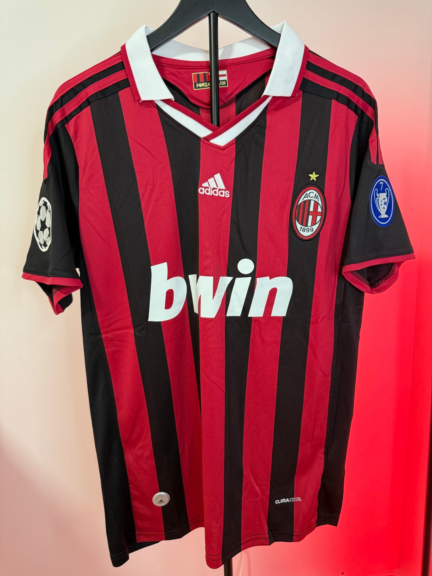 Este modelo combina ese diseño tradicional con detalles modernos de la época, como el cuello blanco estilo polo, el sponsor bwin en el pecho y el escudo del club con la estrella dorada que representa las múltiples ligas ganadas por el Milan. En la manga aparecen los parches de competiciones europeas, recordando la fuerte presencia del club en torneos internacionales durante esos años.
