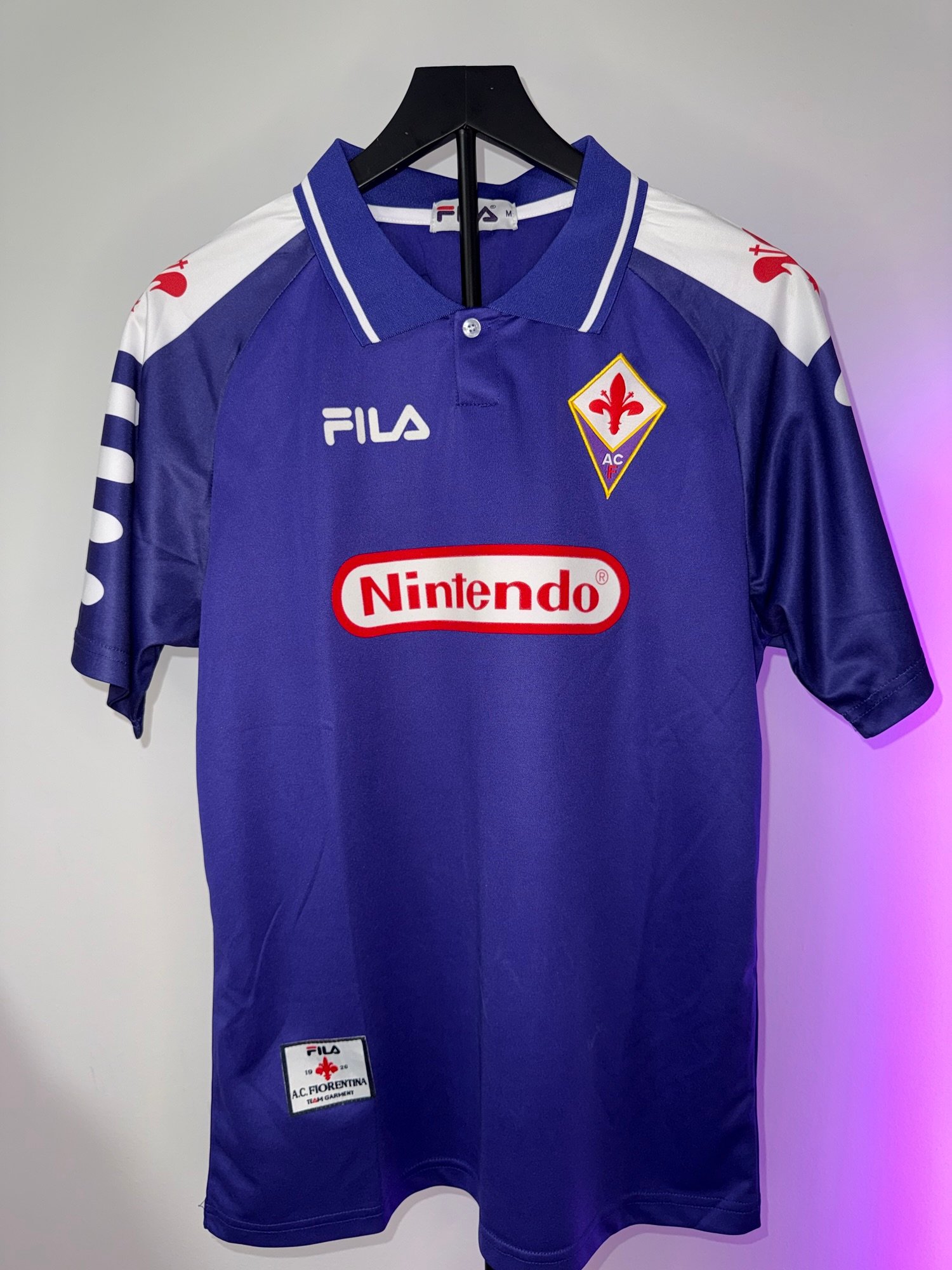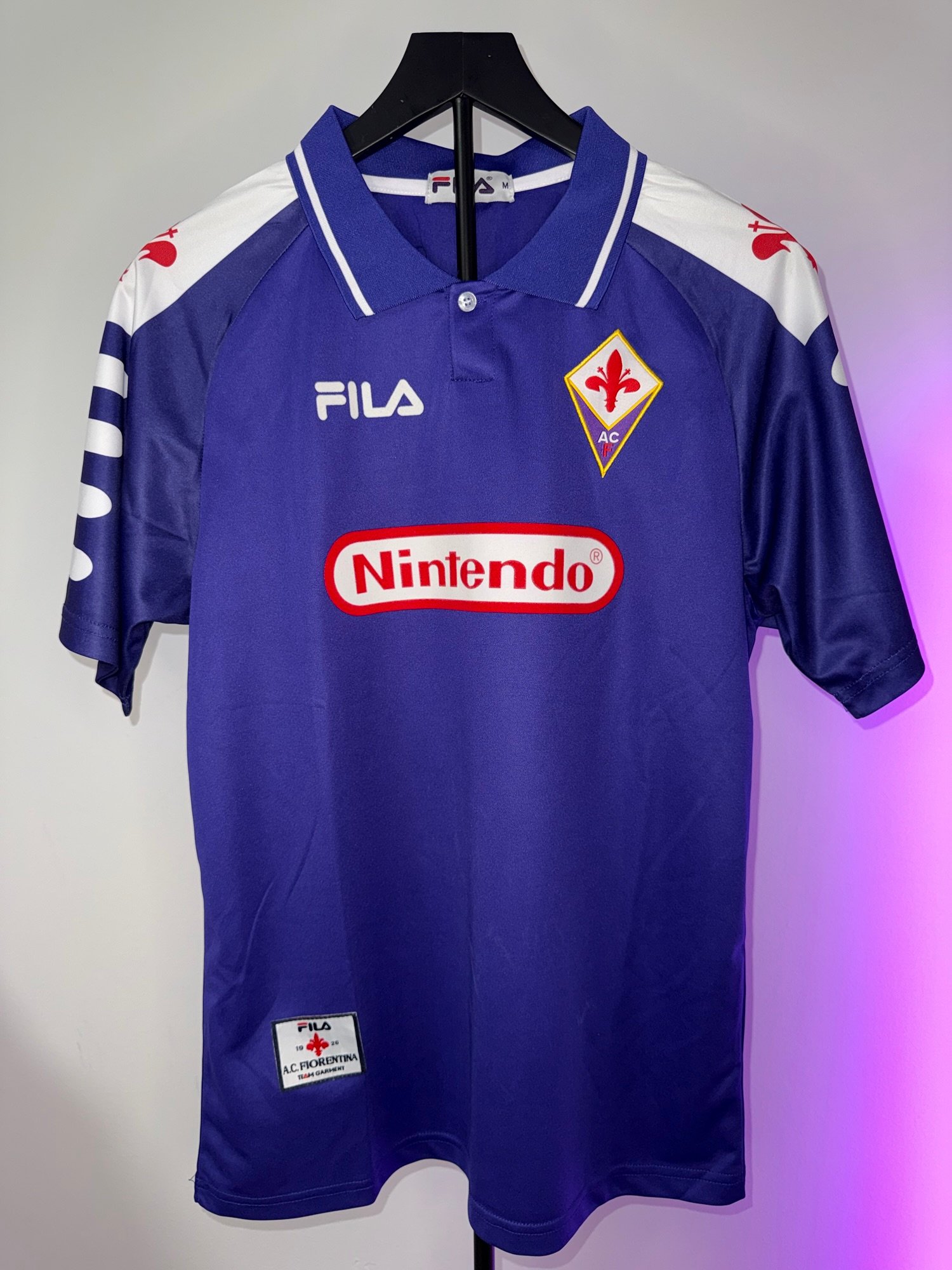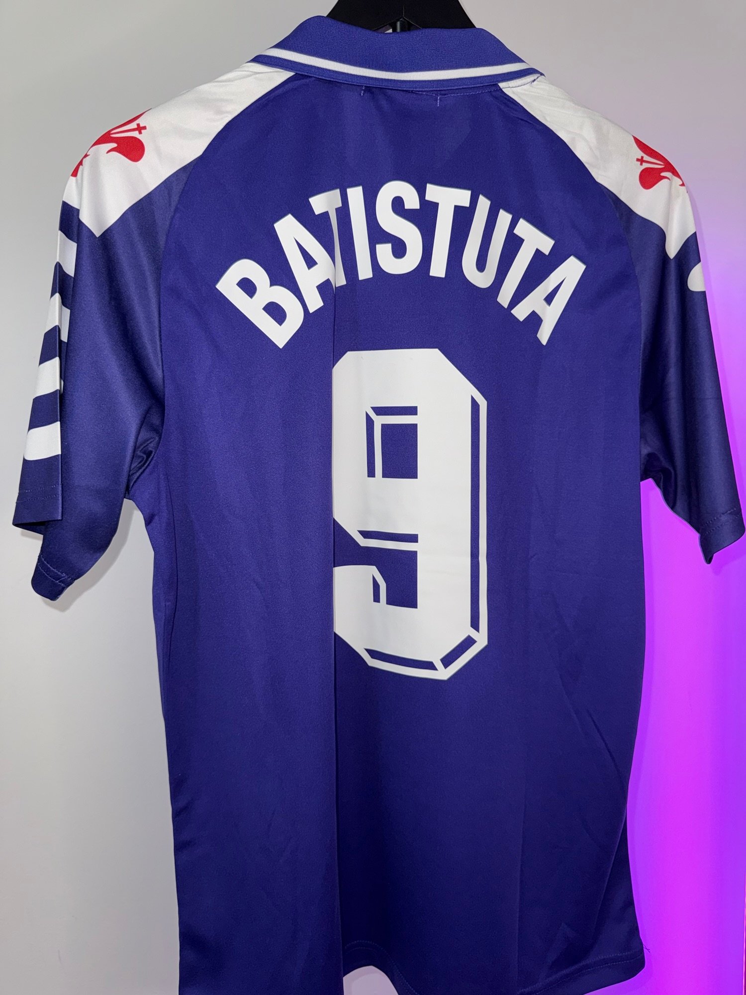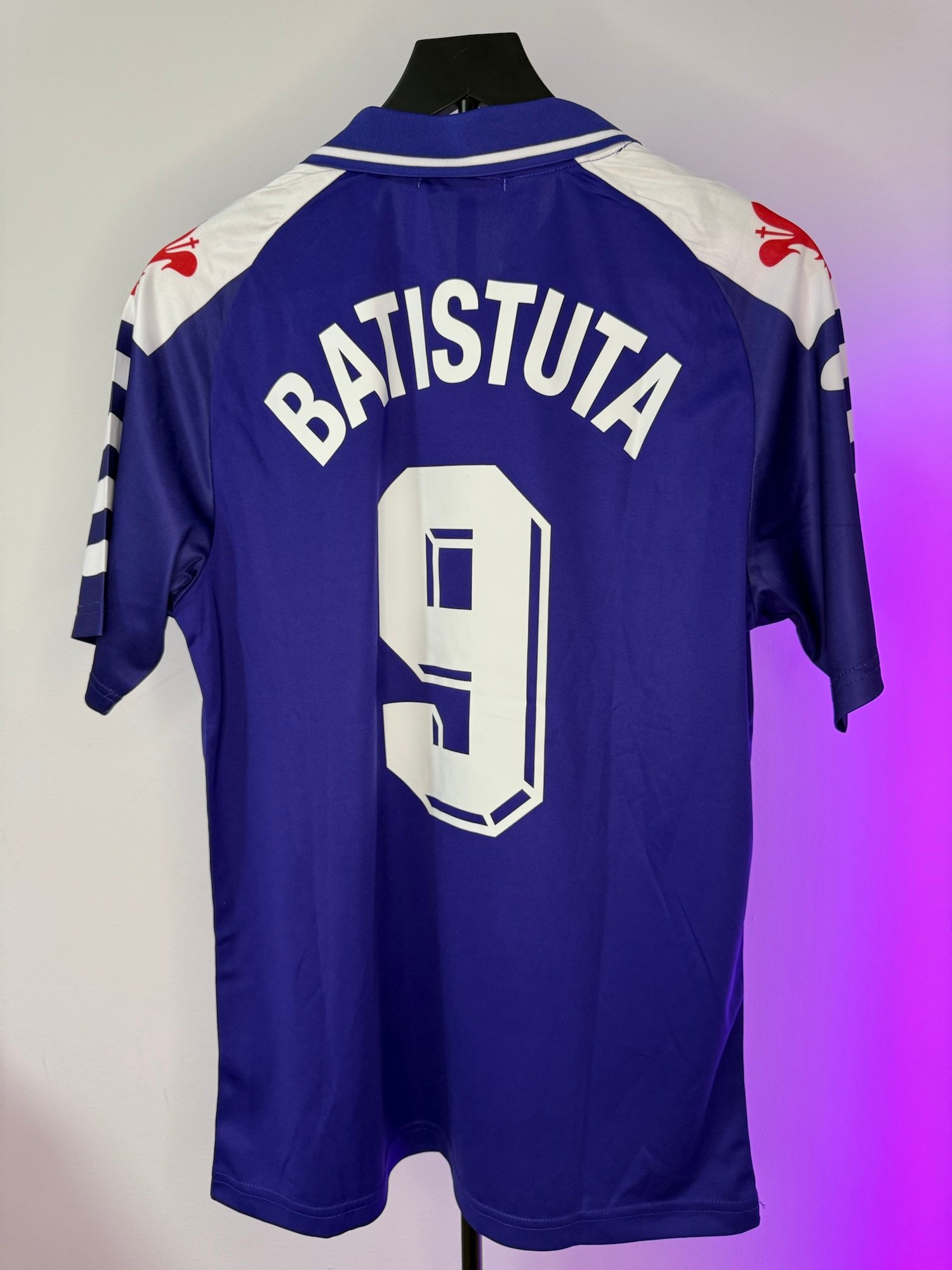 El diseño mantiene el violeta clásico que identifica al club, con una estética retro fiel a los modelos utilizados en aquella etapa. Esta camiseta quedó inmortalizada por Gabriel Batistuta, máximo ídolo histórico de la Fiorentina y uno de los delanteros más temidos de su generación.