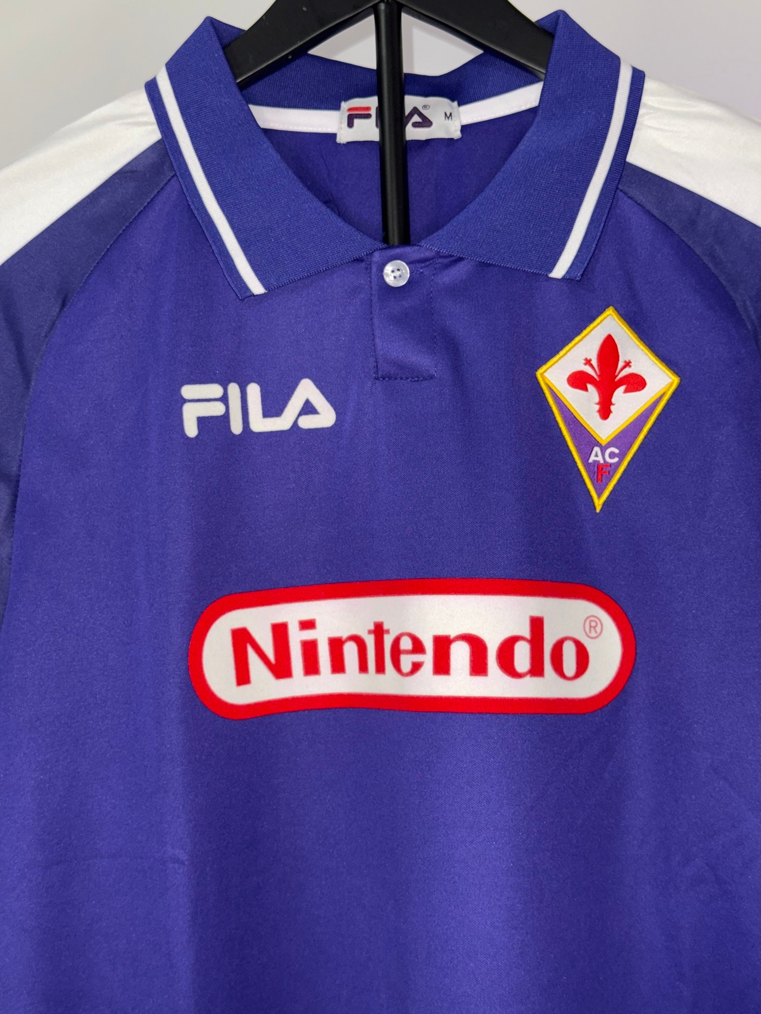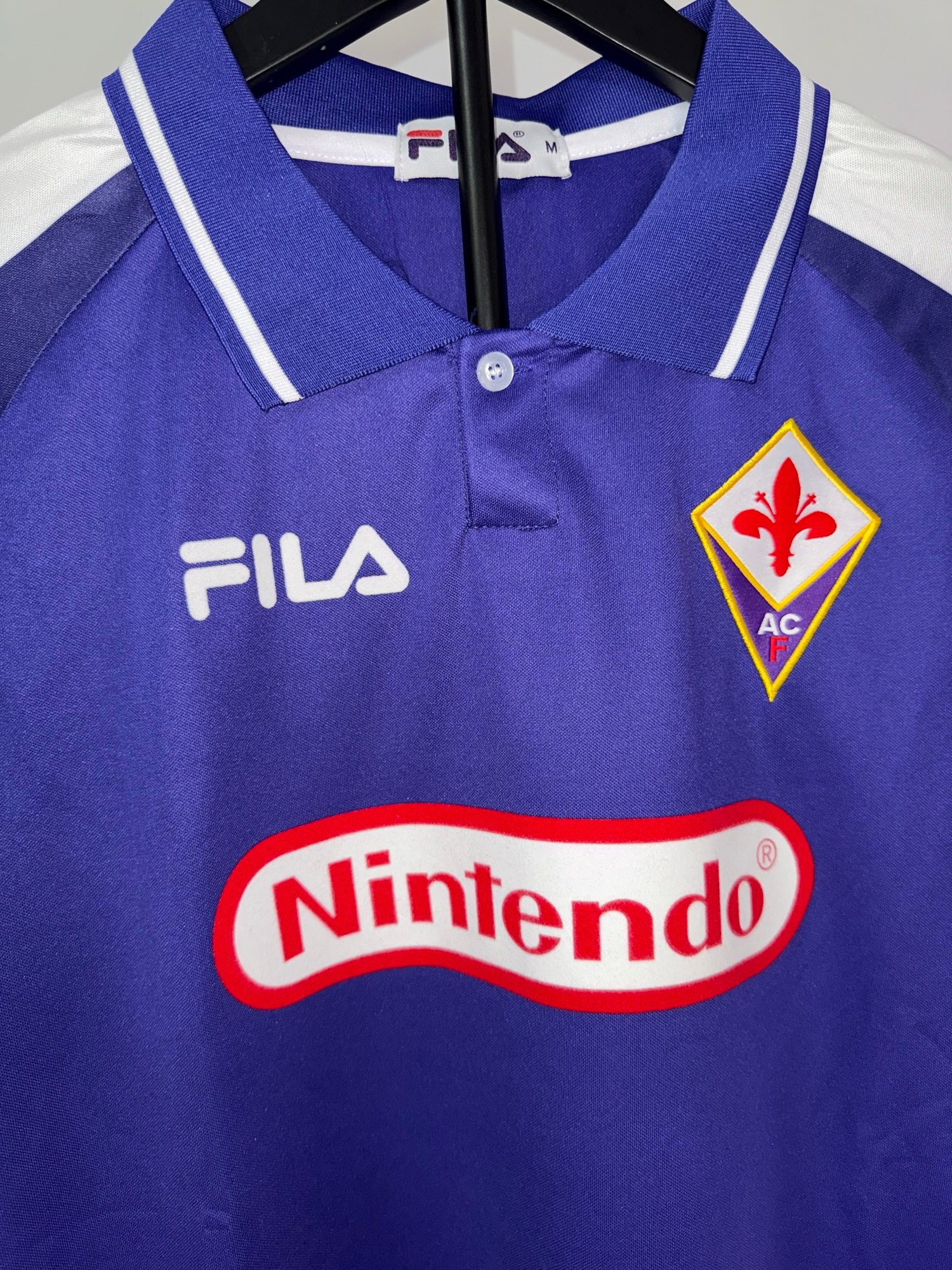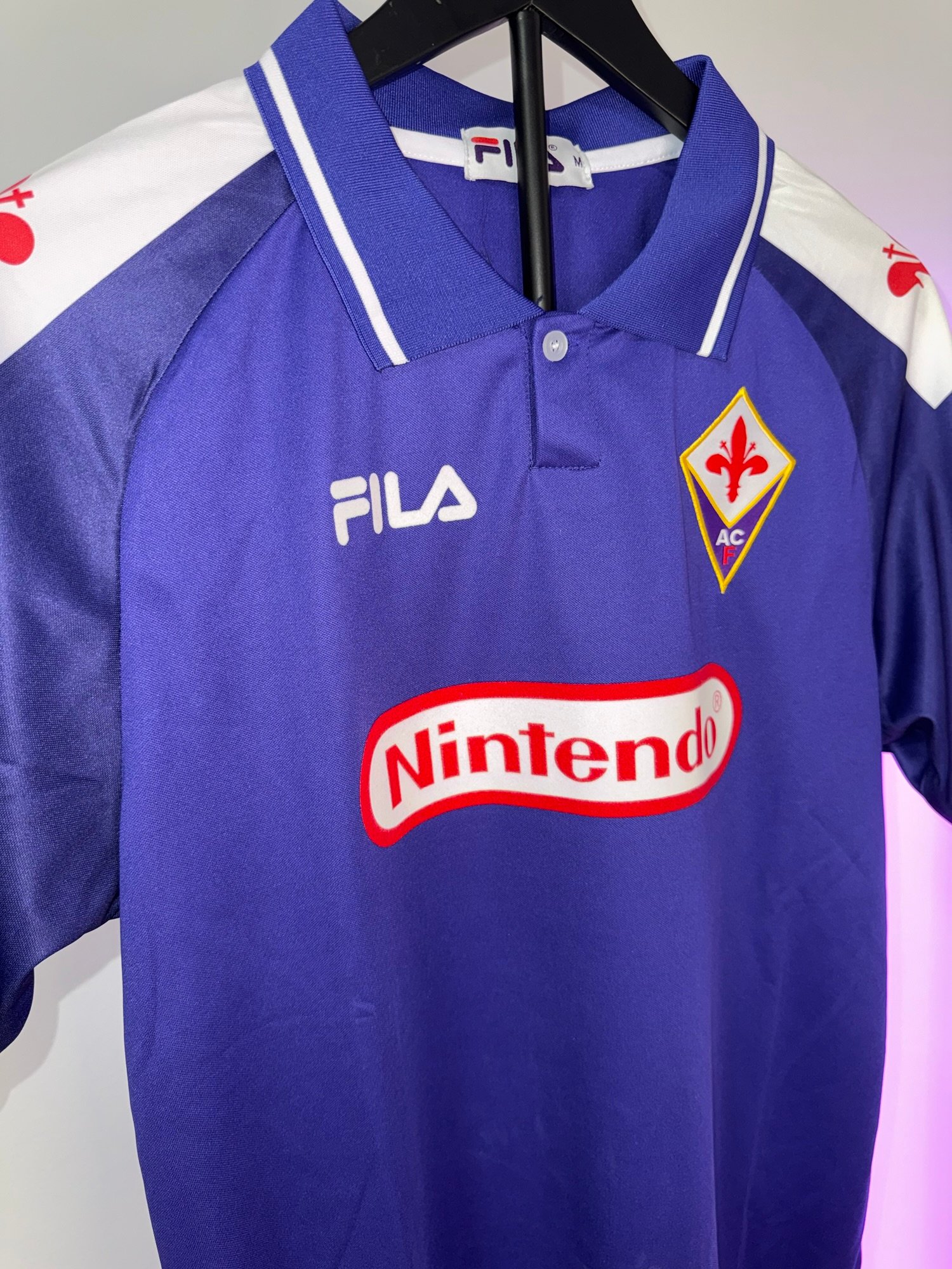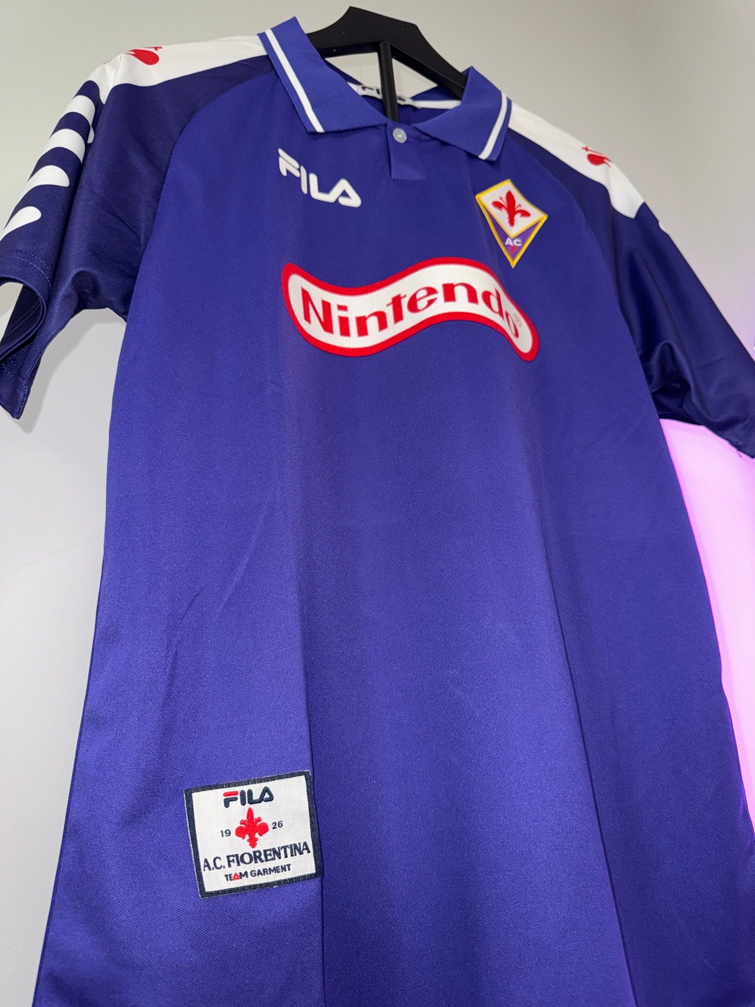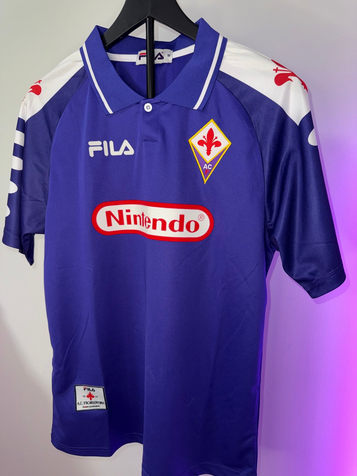 El diseño mantiene el violeta clásico que identifica al club, con una estética retro fiel a los modelos utilizados en aquella etapa. Esta camiseta quedó inmortalizada por Gabriel Batistuta, máximo ídolo histórico de la Fiorentina y uno de los delanteros más temidos de su generación.