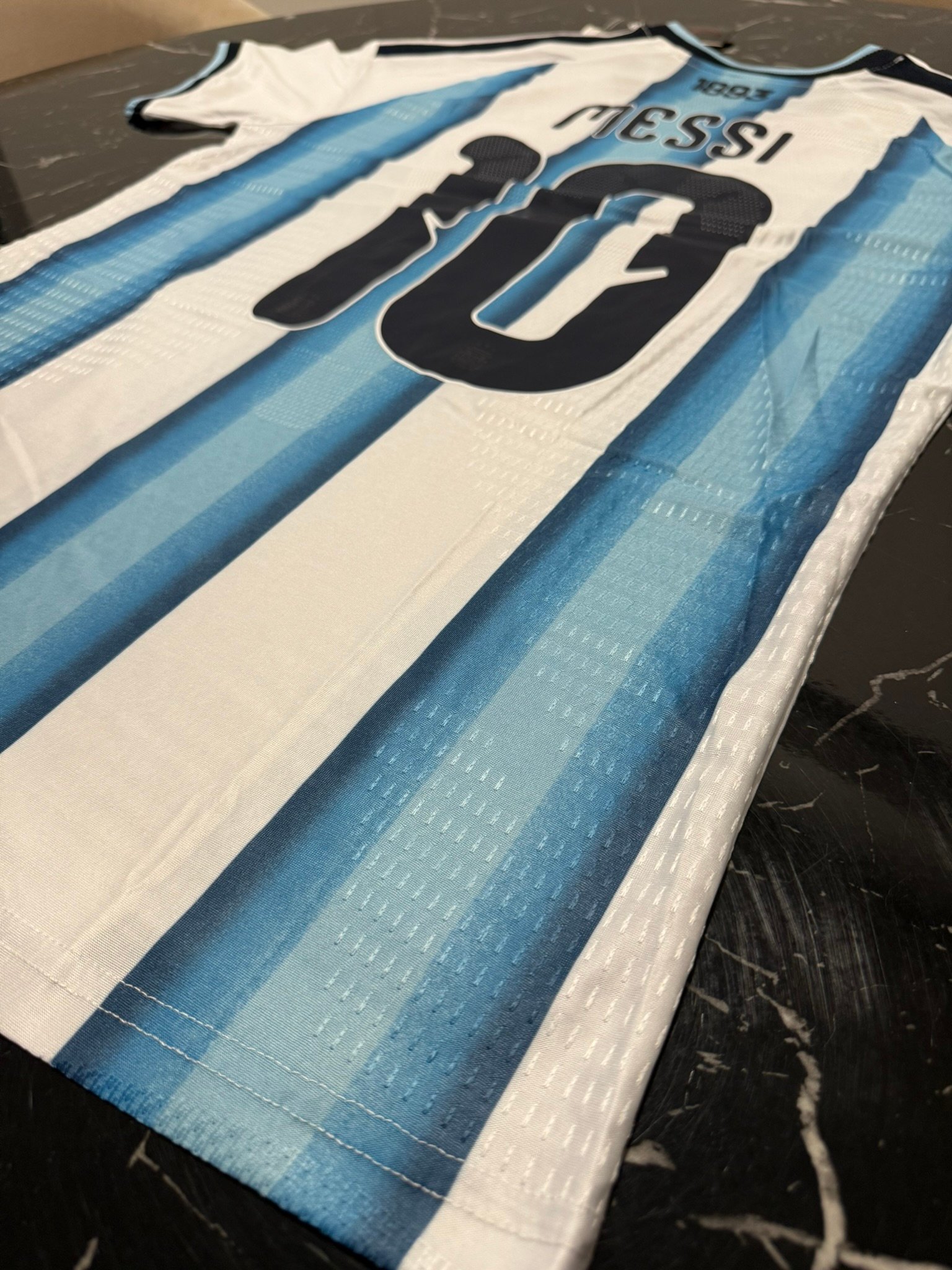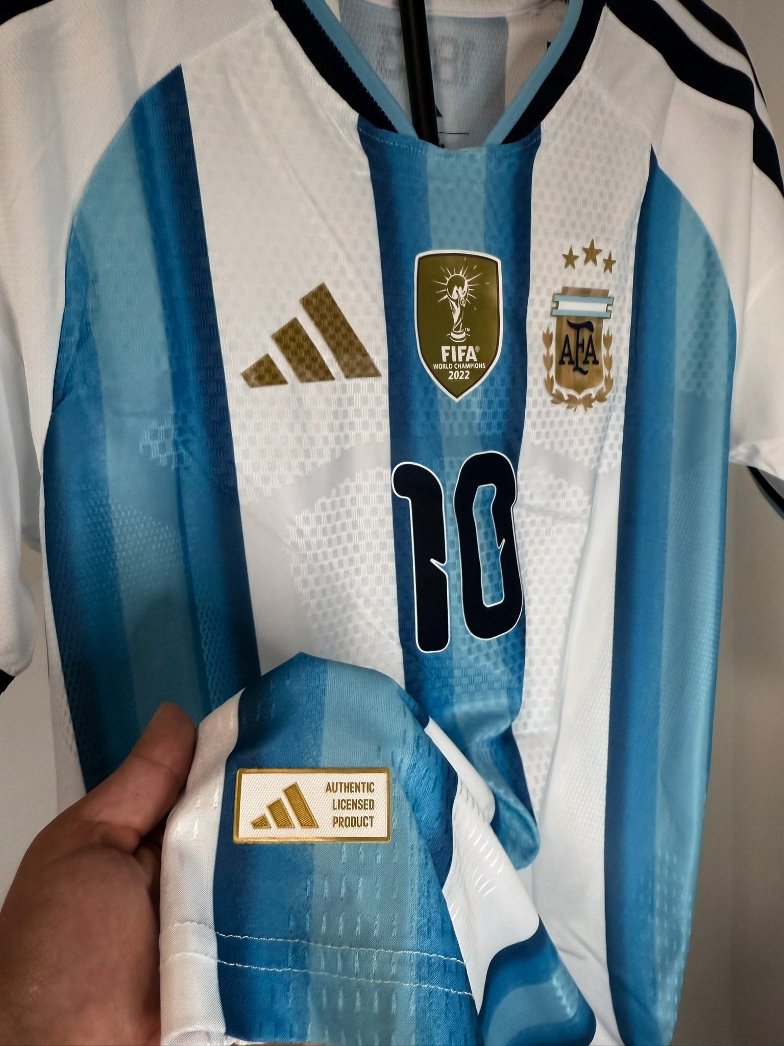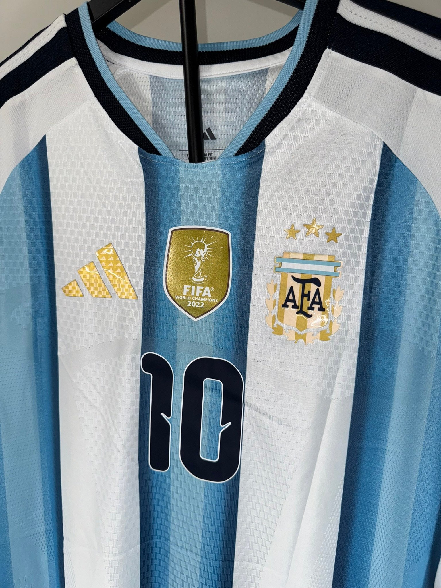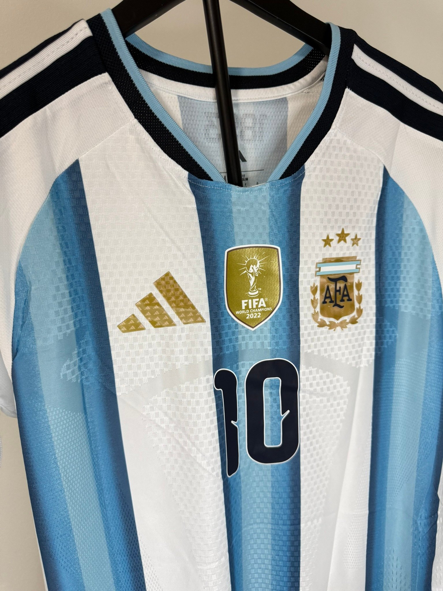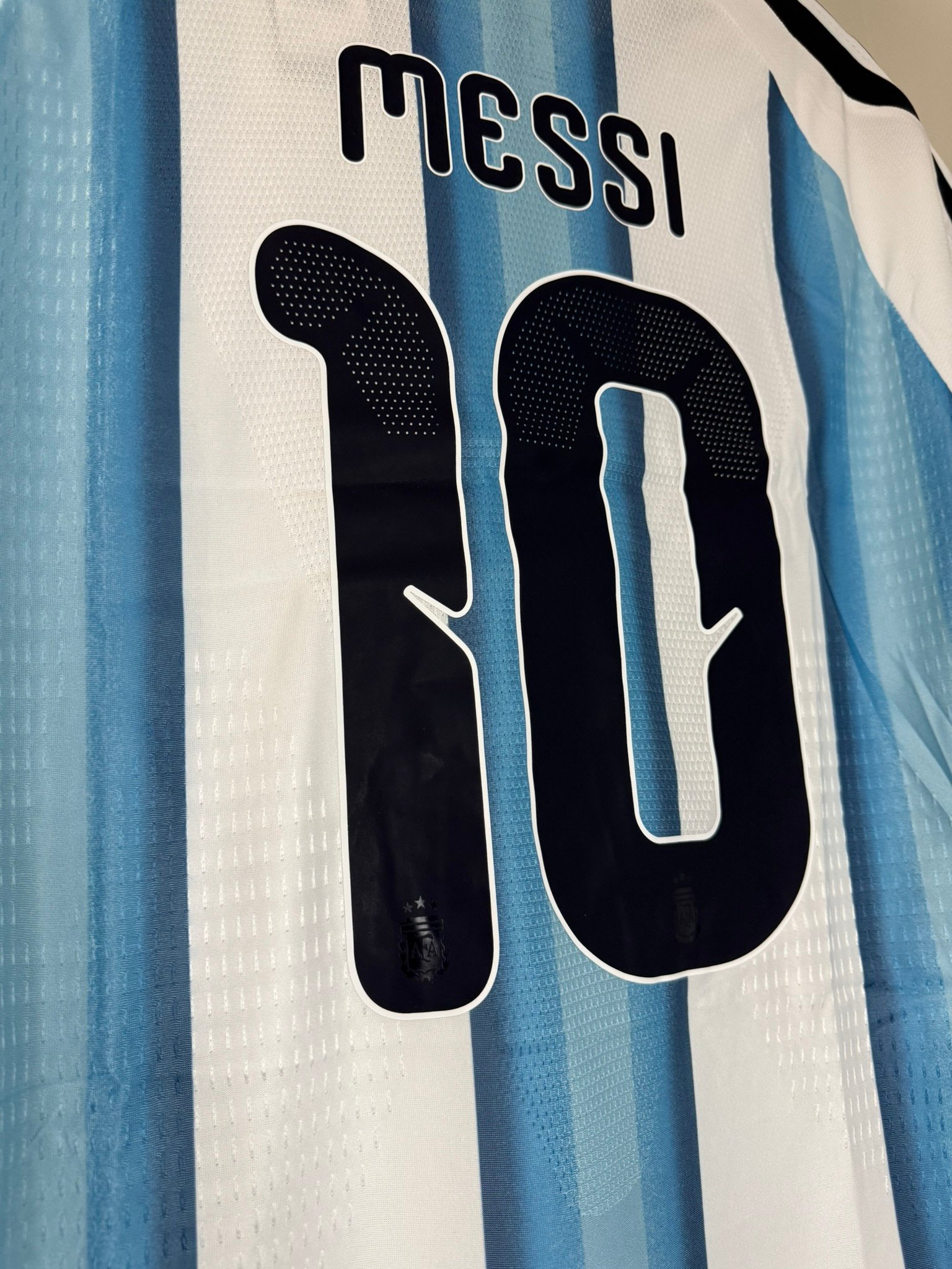 Camiseta local de Argentina 2025/26 en versión jugador representa la evolución del clásico albiceleste con un diseño más moderno, técnico y pensado para el máximo rendimiento. Mantiene las tradicionales franjas celestes y blancas, pero las combina con texturas geométricas, detalles dorados y un acabado premium que resalta a simple vista.