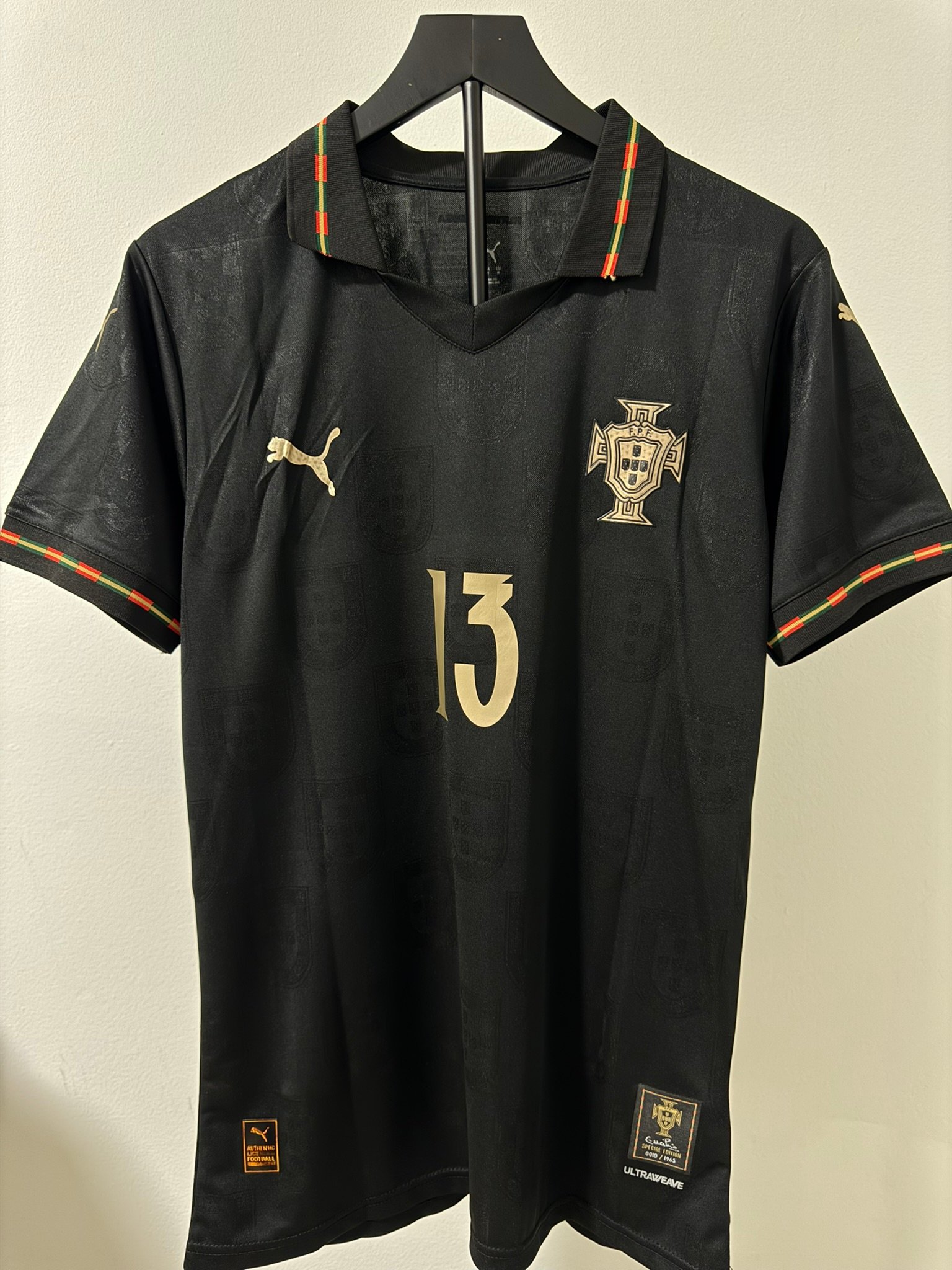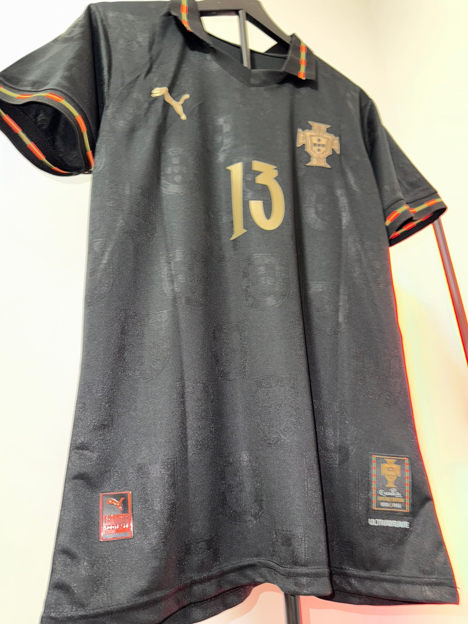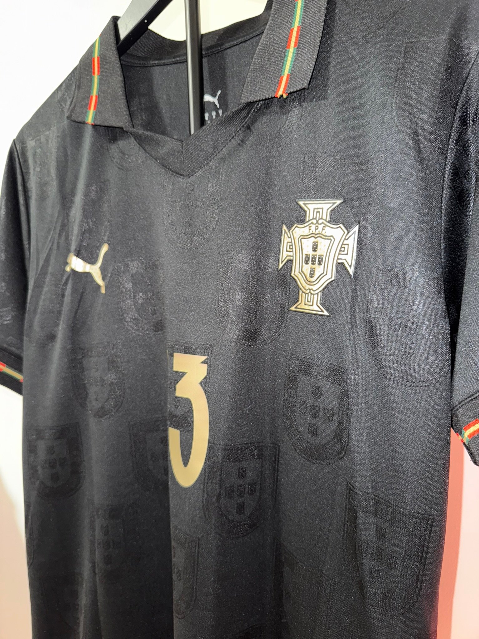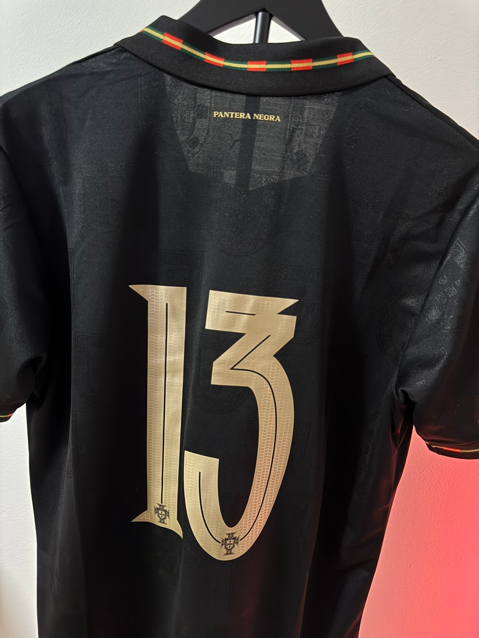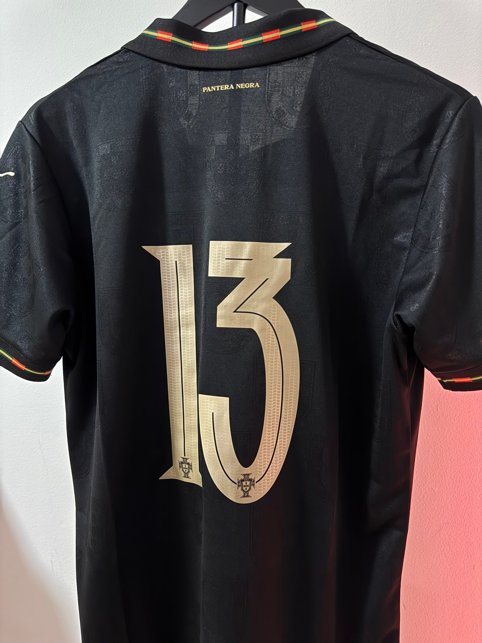 El diseño completamente negro con detalles dorados representa poder, elegancia y mentalidad competitiva. Incluye el escudo de Portugal en acabado premium, número dorado y detalles gráficos sutiles integrados en la tela.