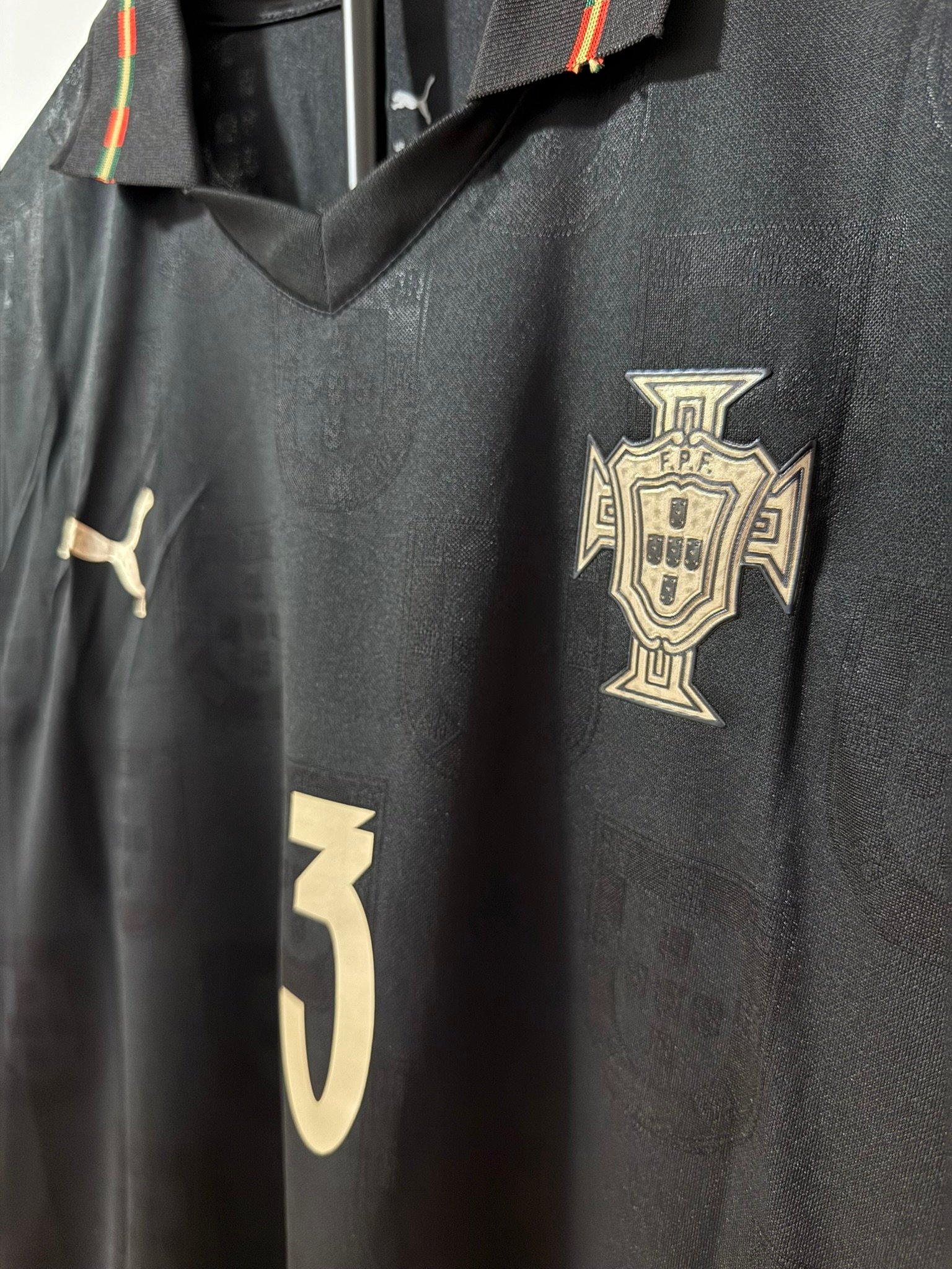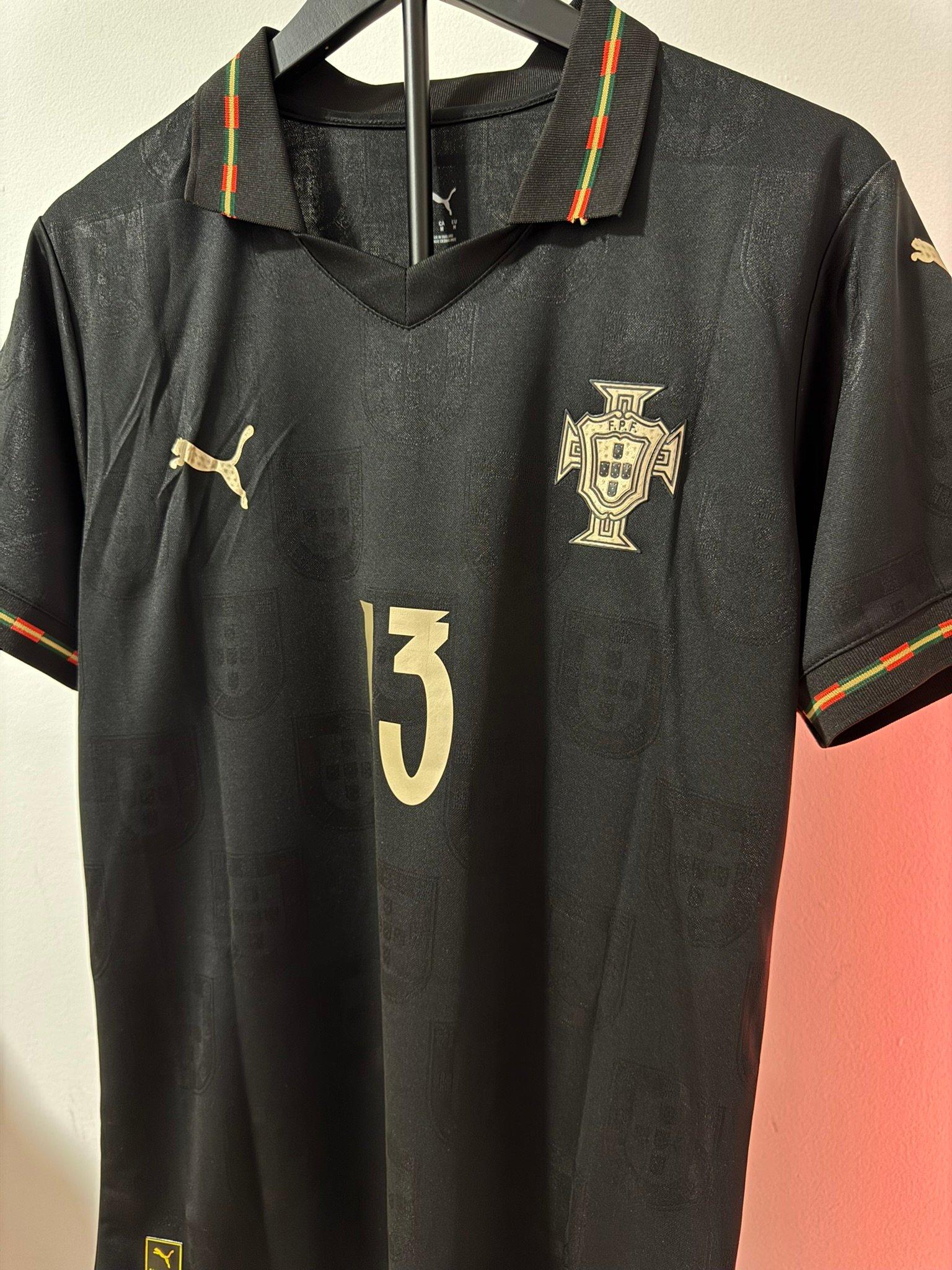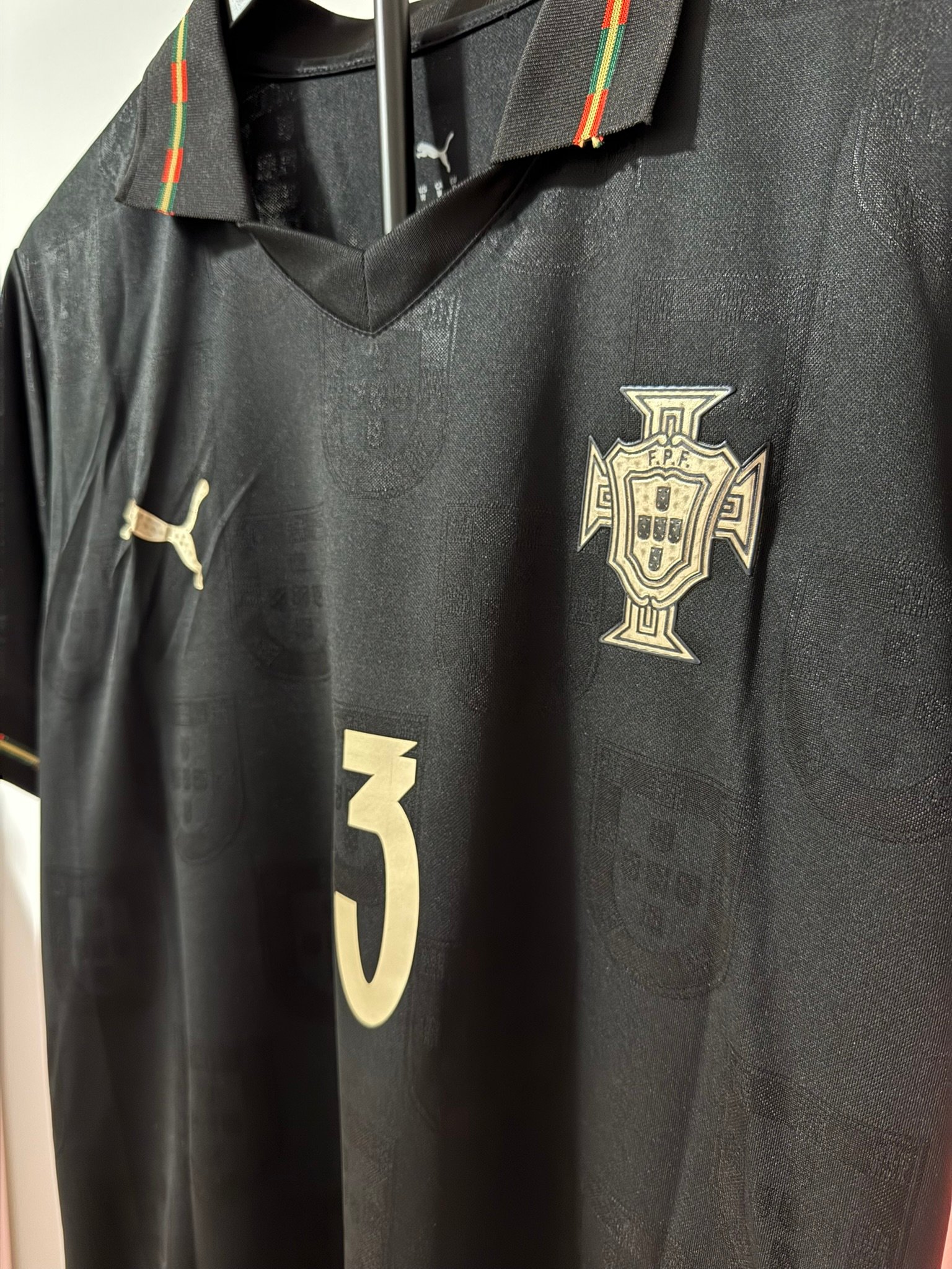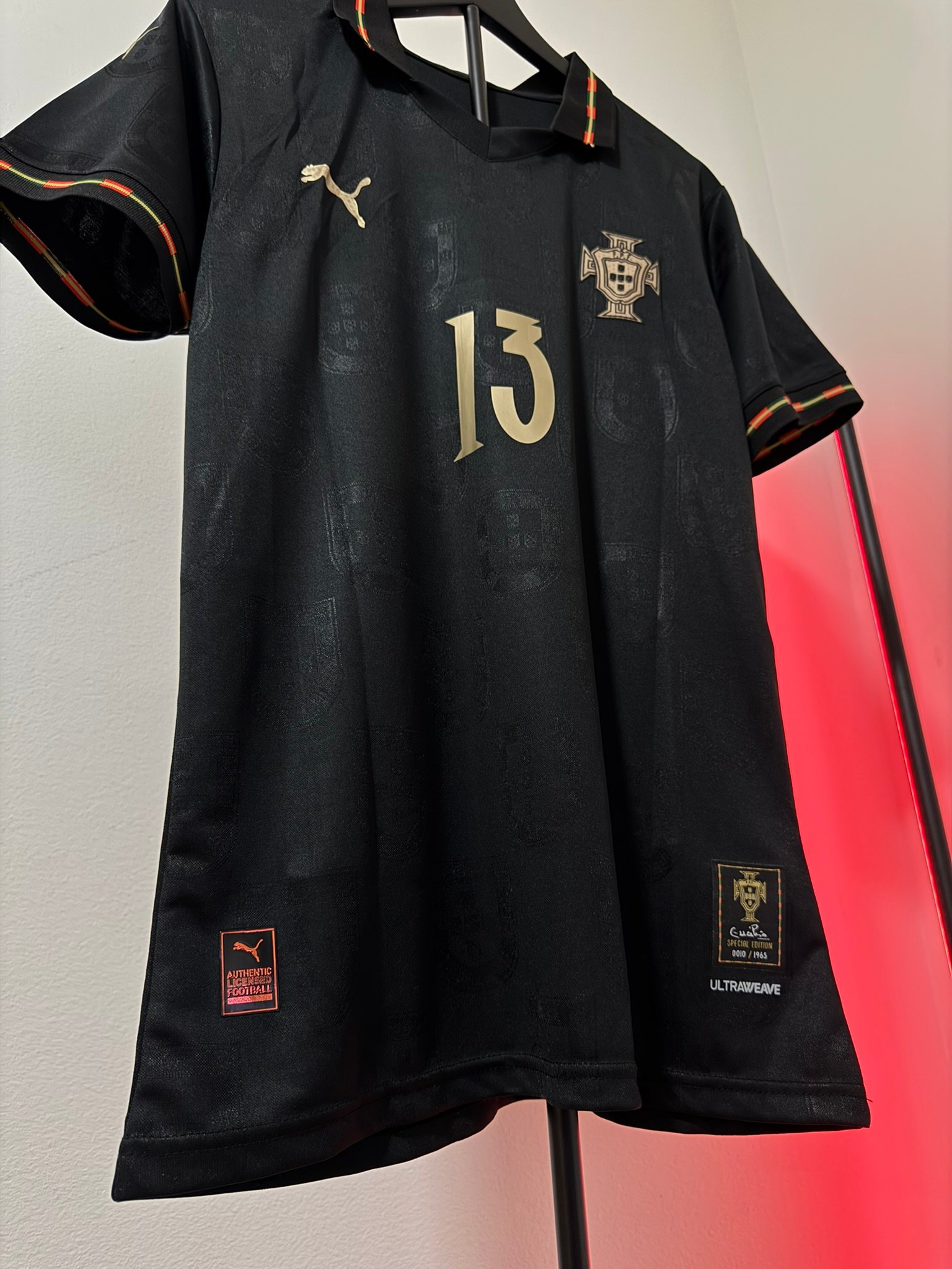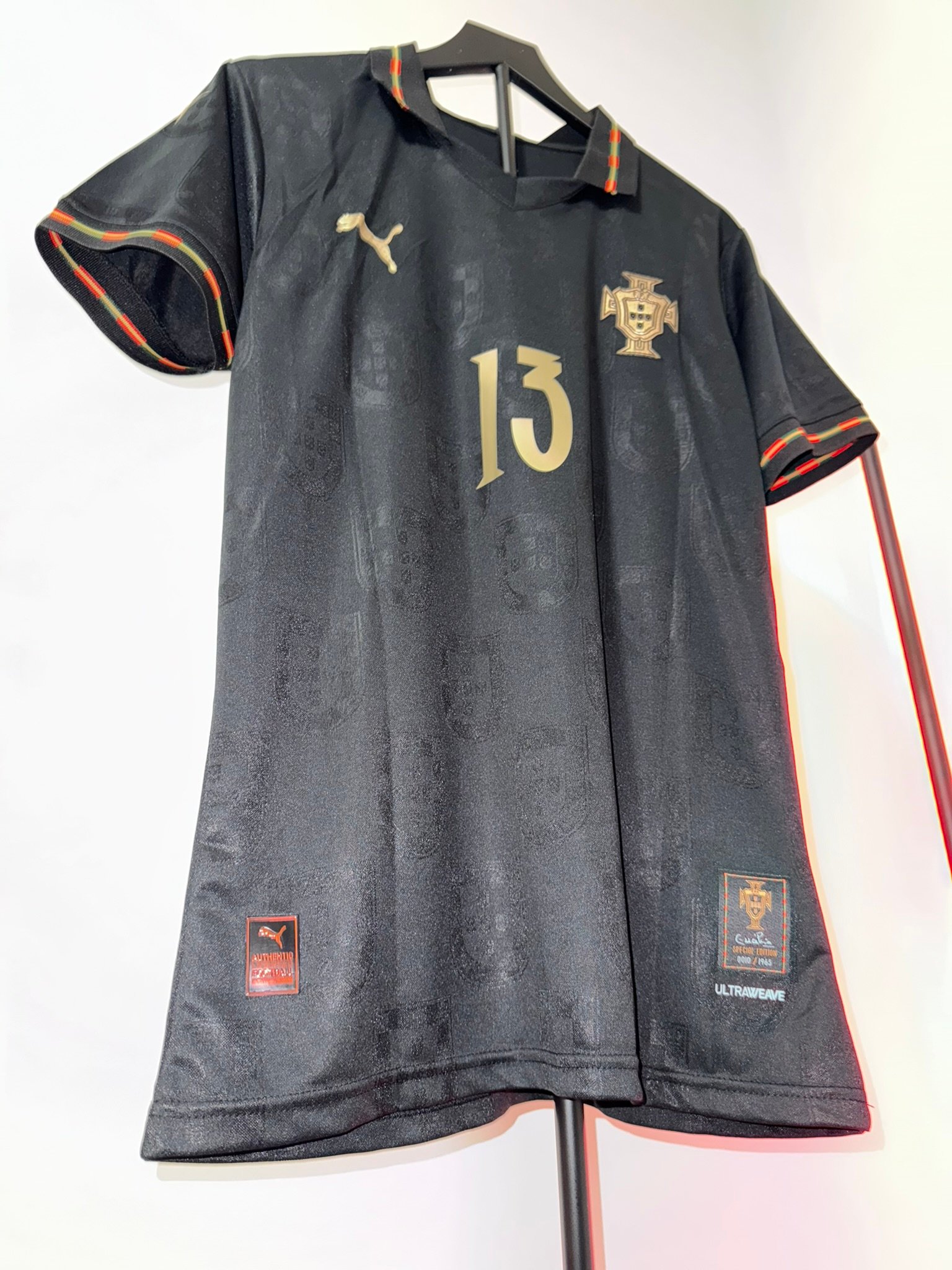 El diseño completamente negro con detalles dorados representa poder, elegancia y mentalidad competitiva. Incluye el escudo de Portugal en acabado premium, número dorado y detalles gráficos sutiles integrados en la tela.