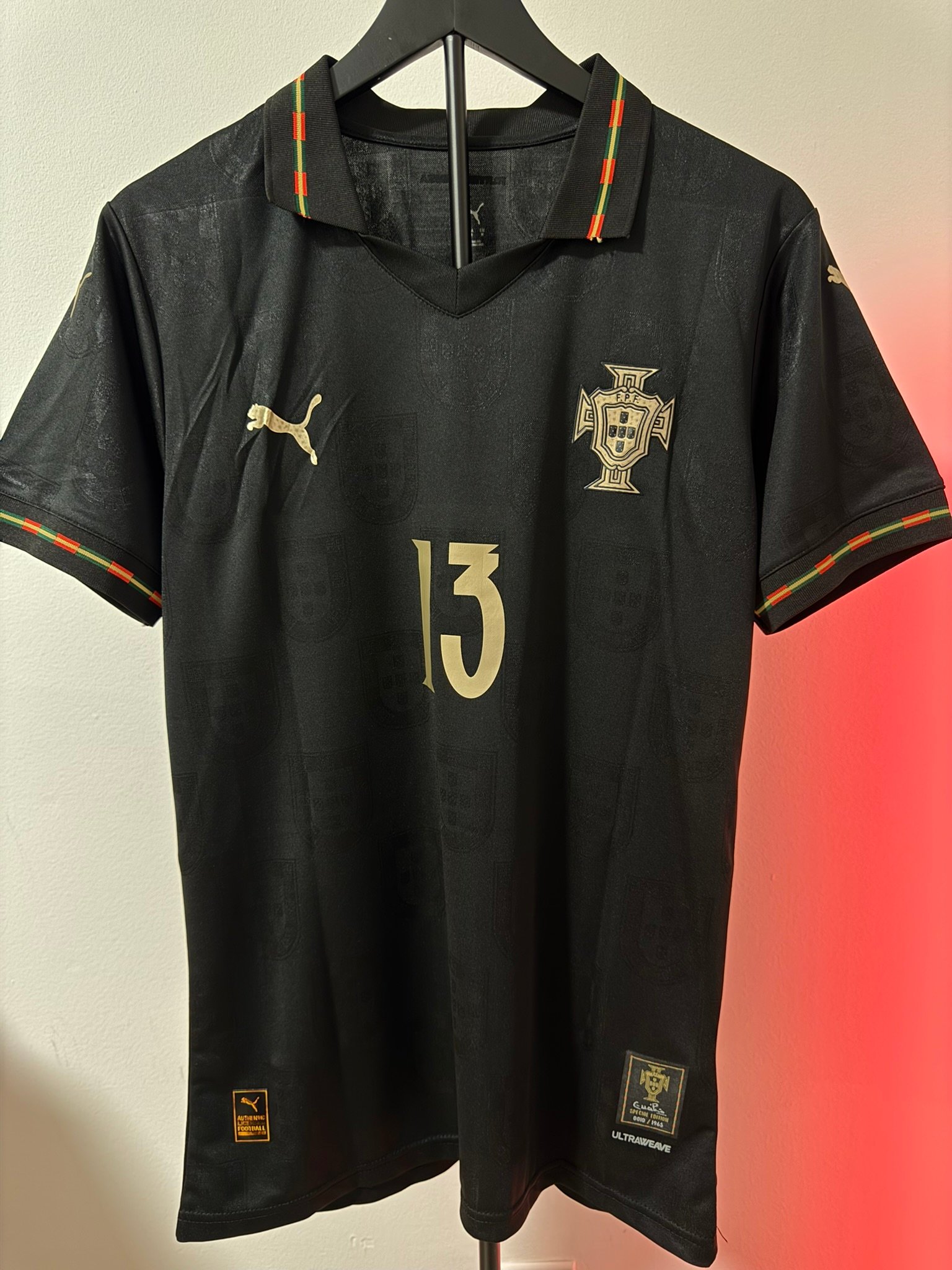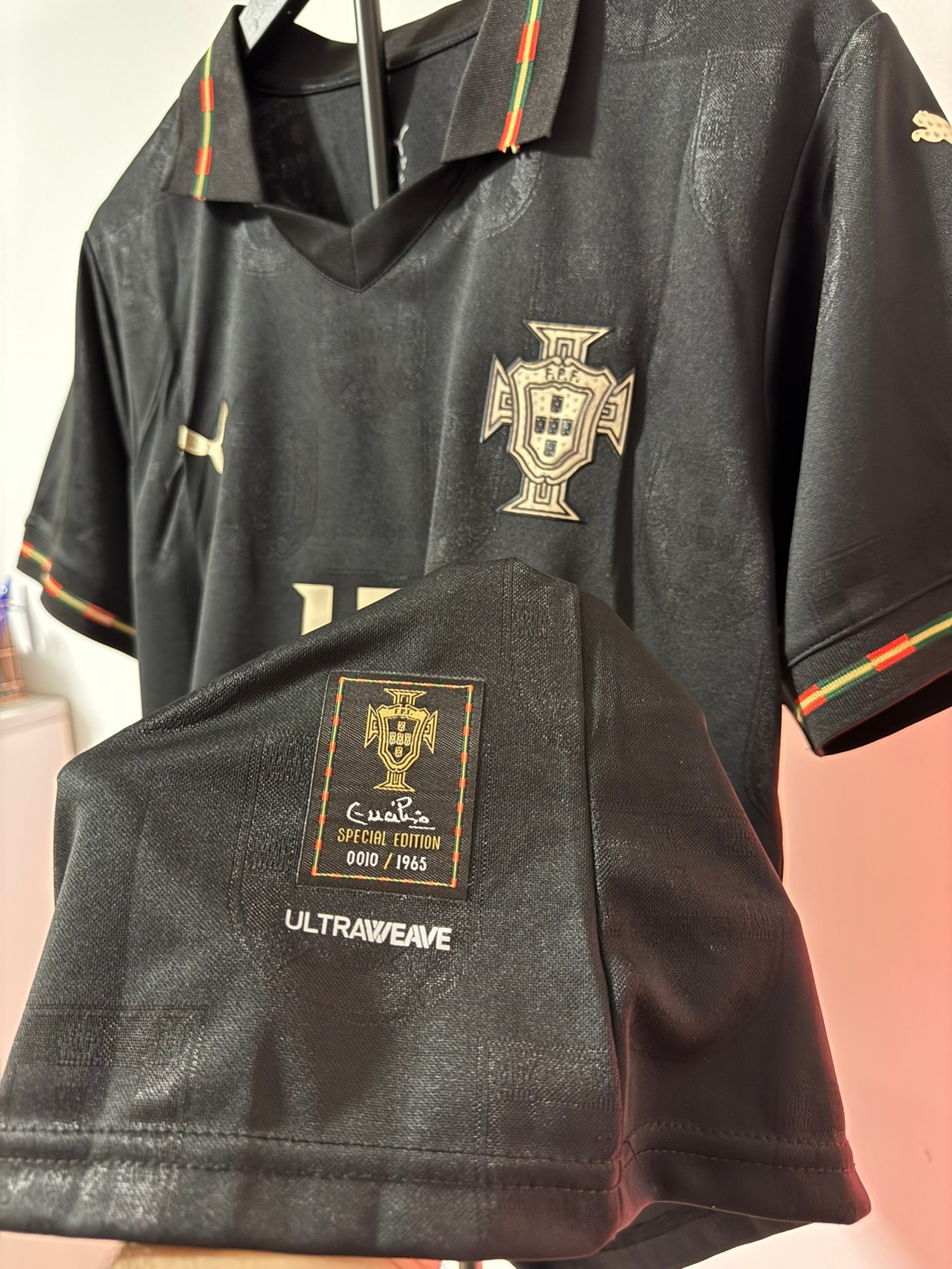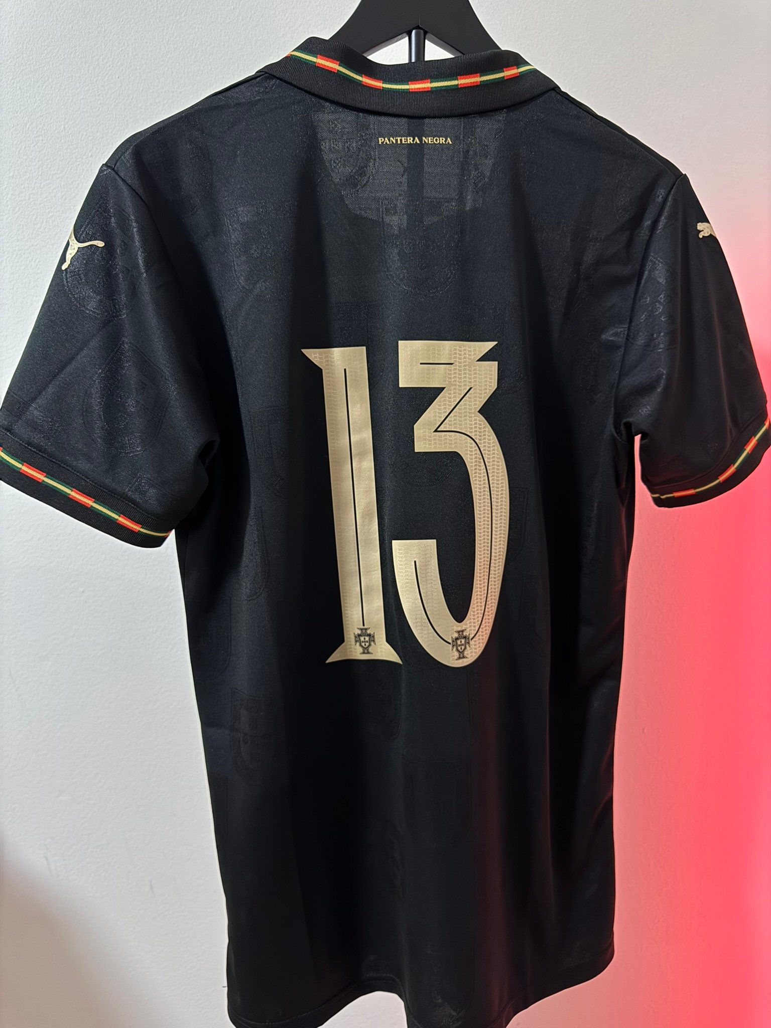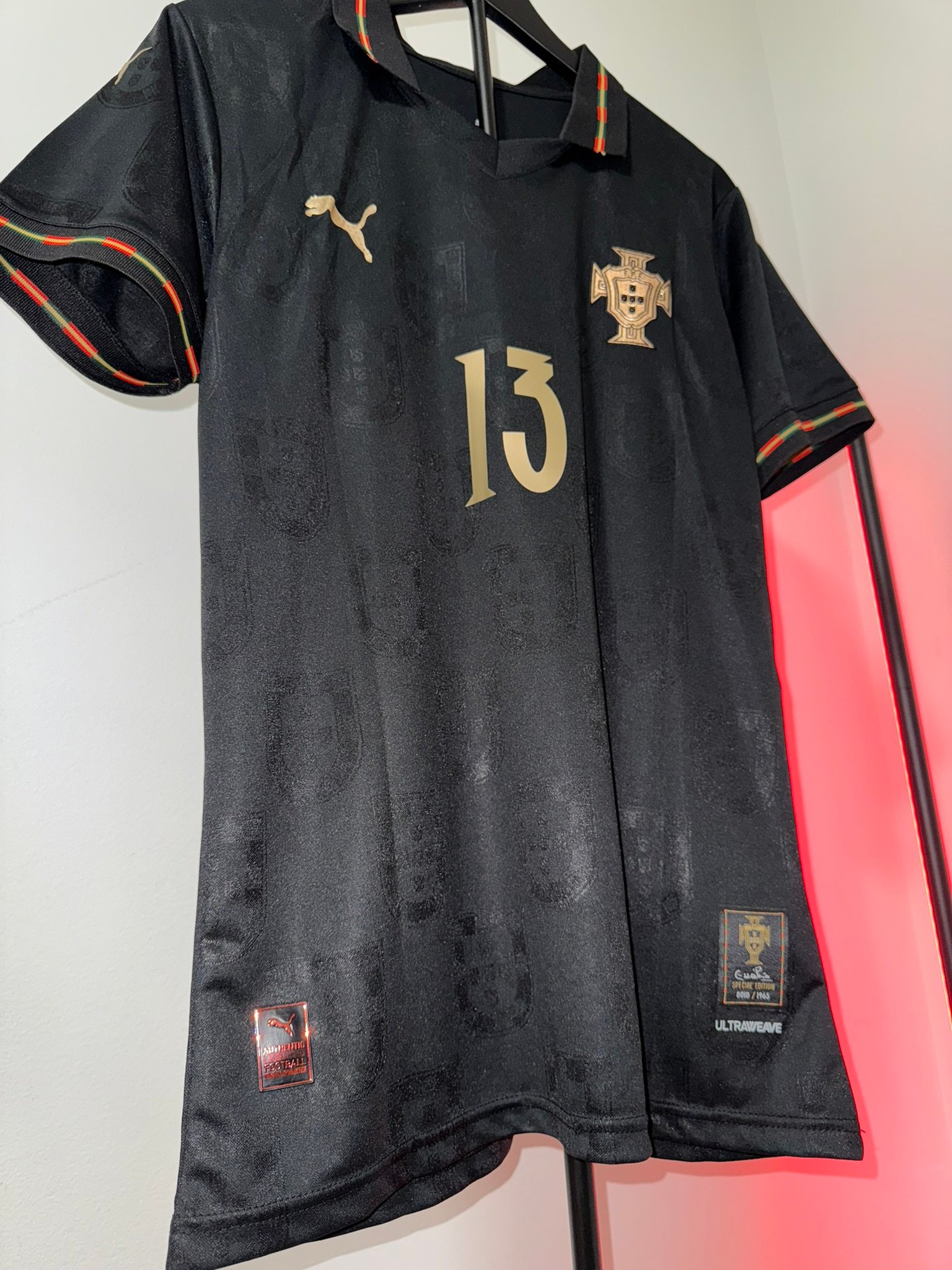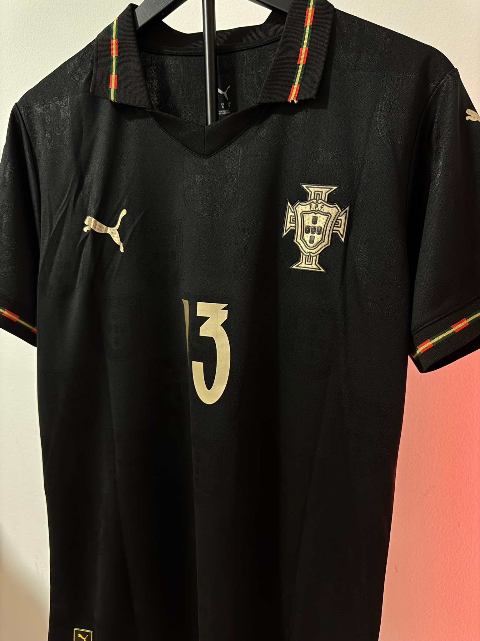 El diseño completamente negro con detalles dorados representa poder, elegancia y mentalidad competitiva. Incluye el escudo de Portugal en acabado premium, número dorado y detalles gráficos sutiles integrados en la tela.