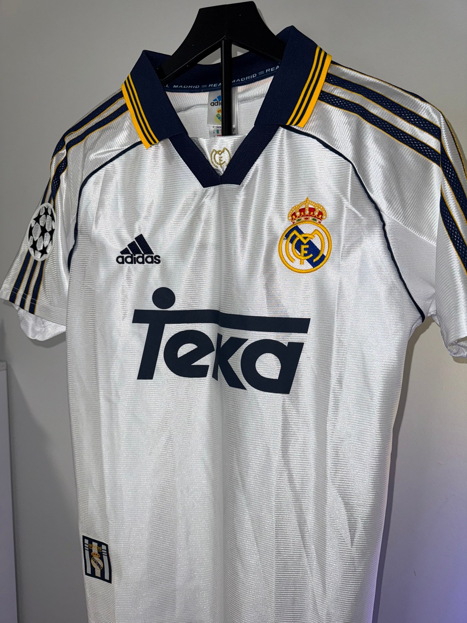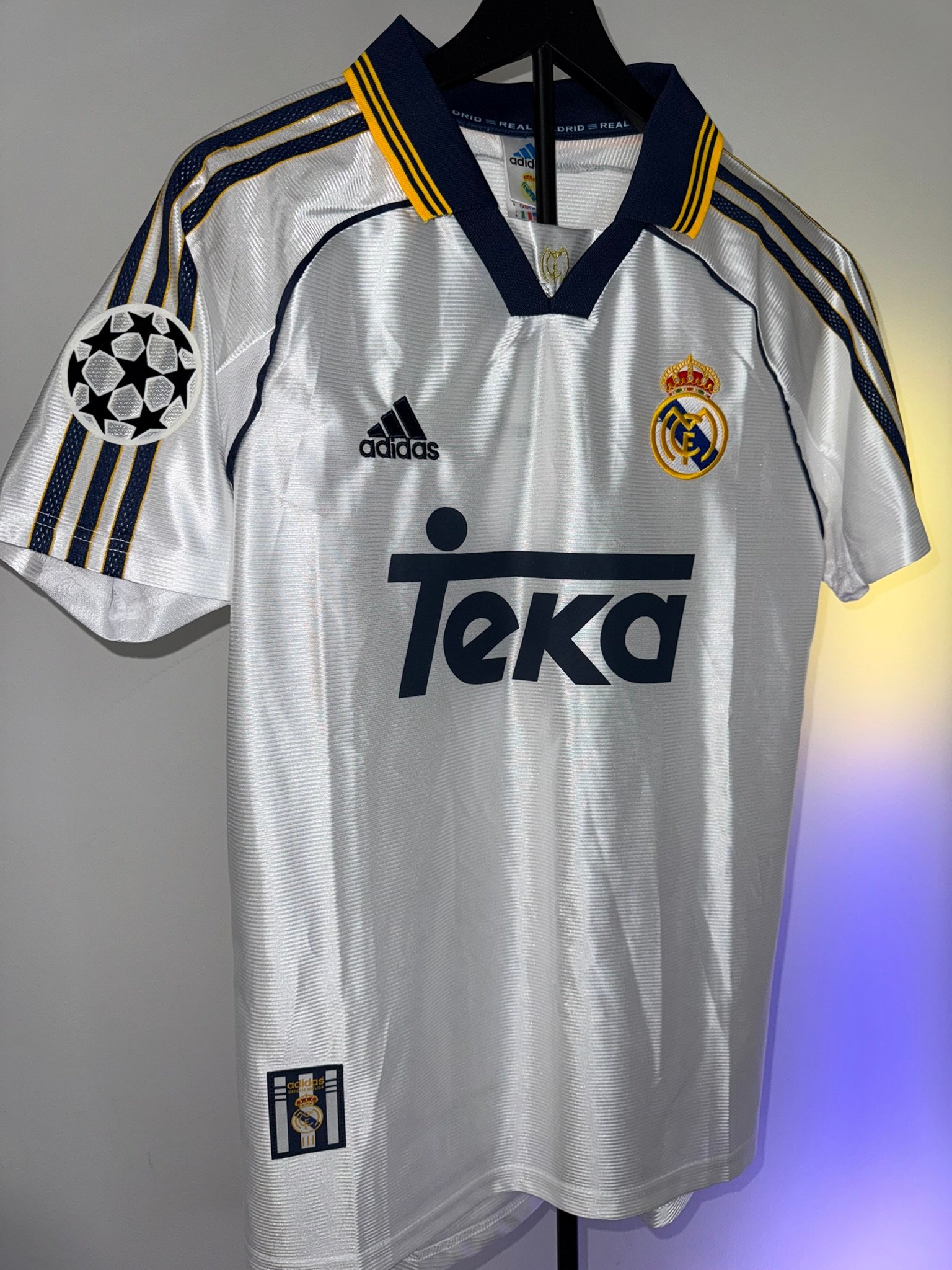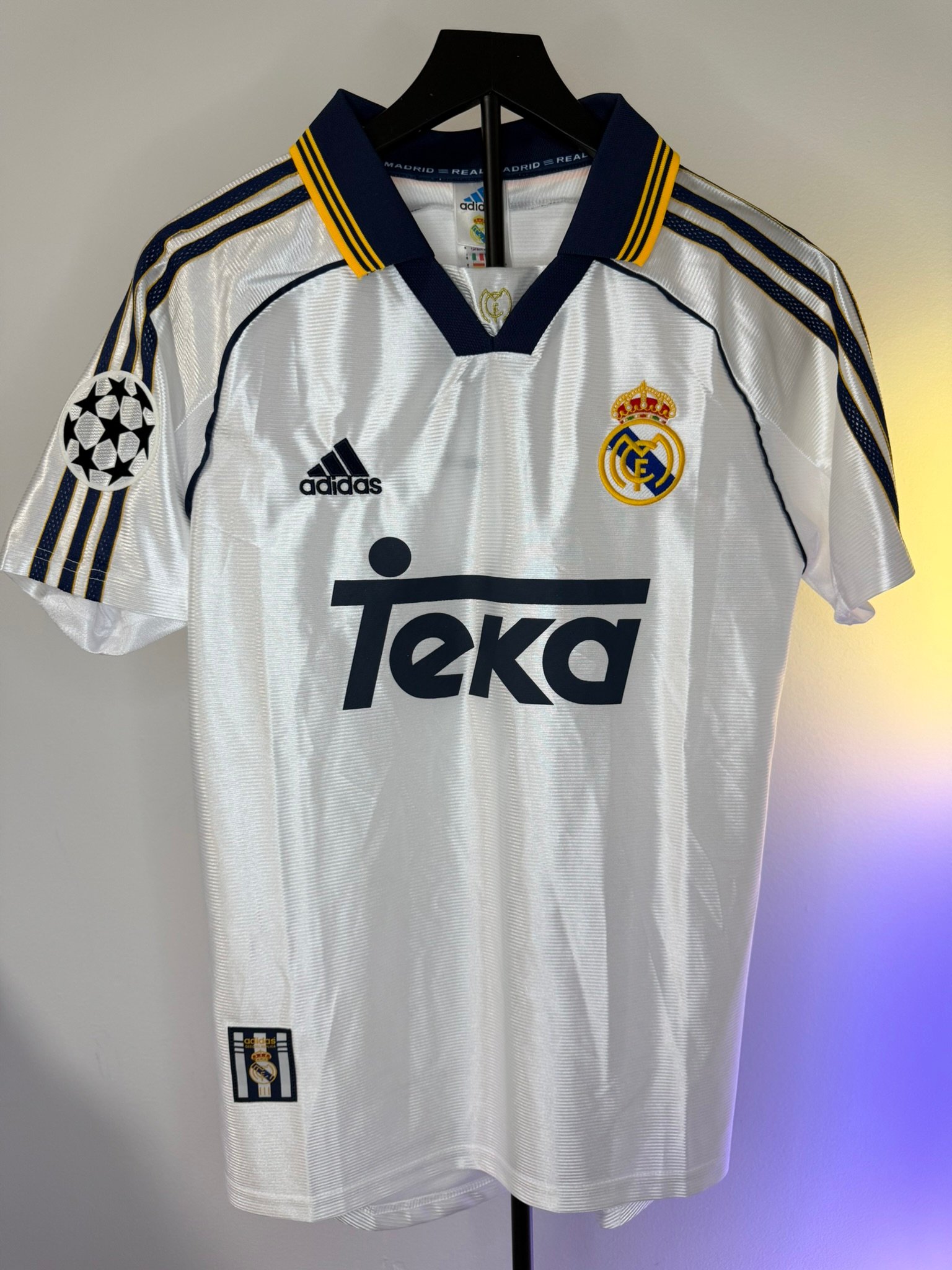 Camiseta retro del Real Madrid temporada 1999/2000. Disponible en talles variados. Opción de personalización con nombre, número y parches.