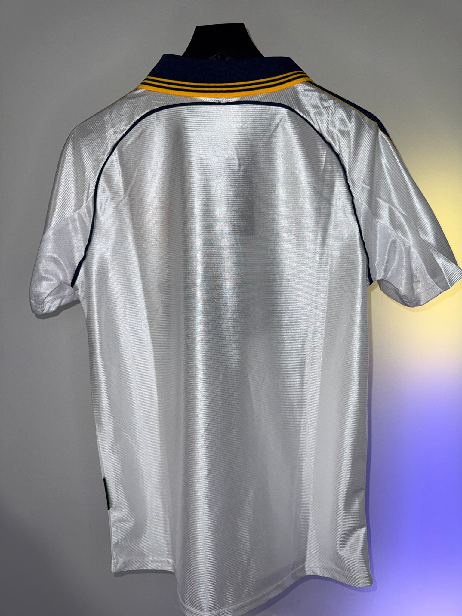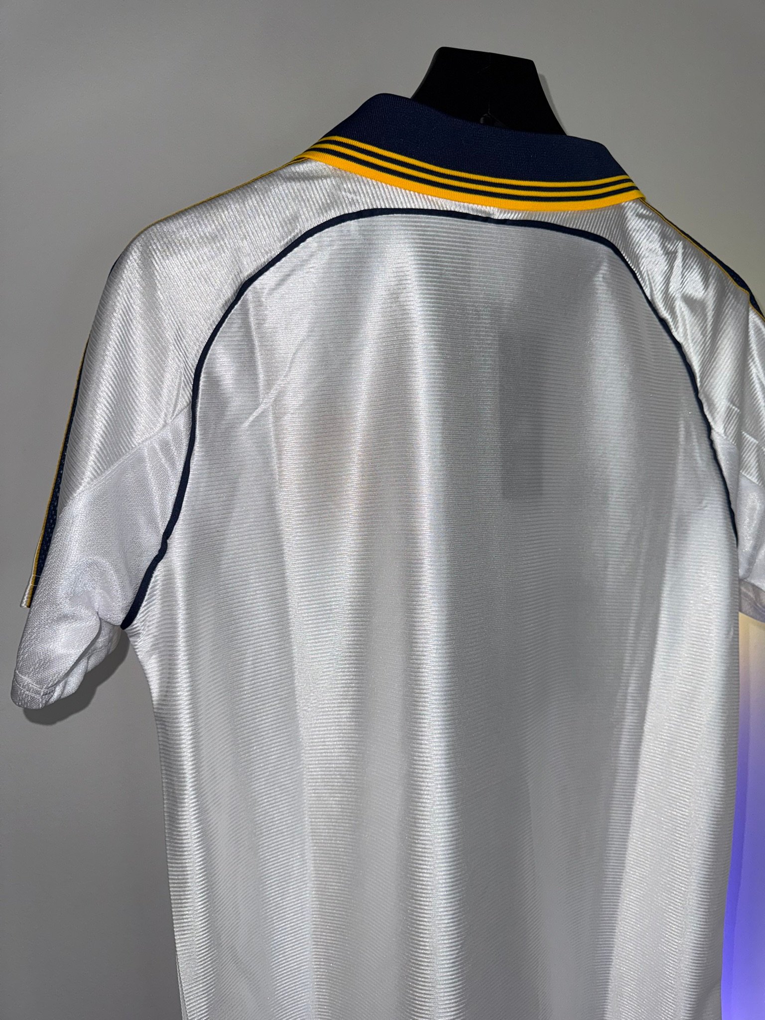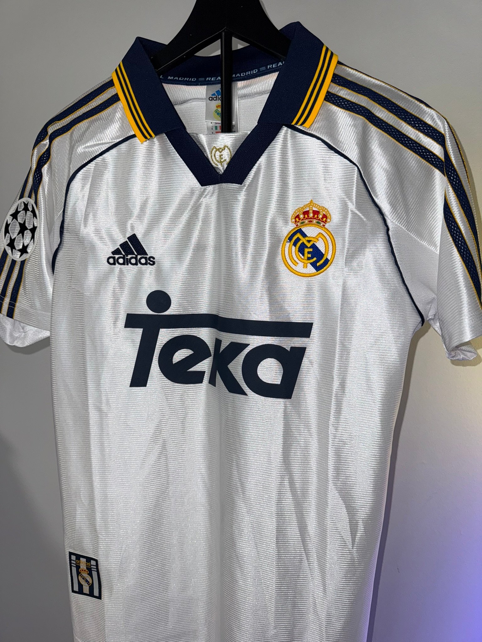 Camiseta retro del Real Madrid temporada 1999/2000. Disponible en talles variados. Opción de personalización con nombre, número y parches.