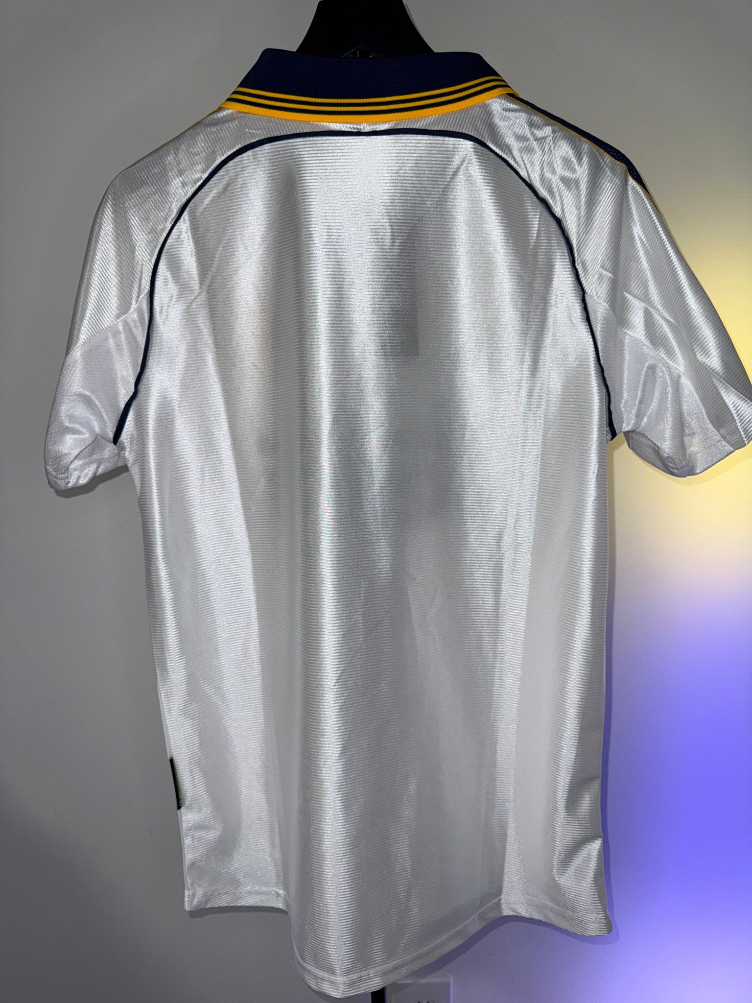 El diseño destaca por su clásico cuello tipo polo, detalles en azul y dorado, y un estilo elegante que representa una era inolvidable del fútbol europeo.