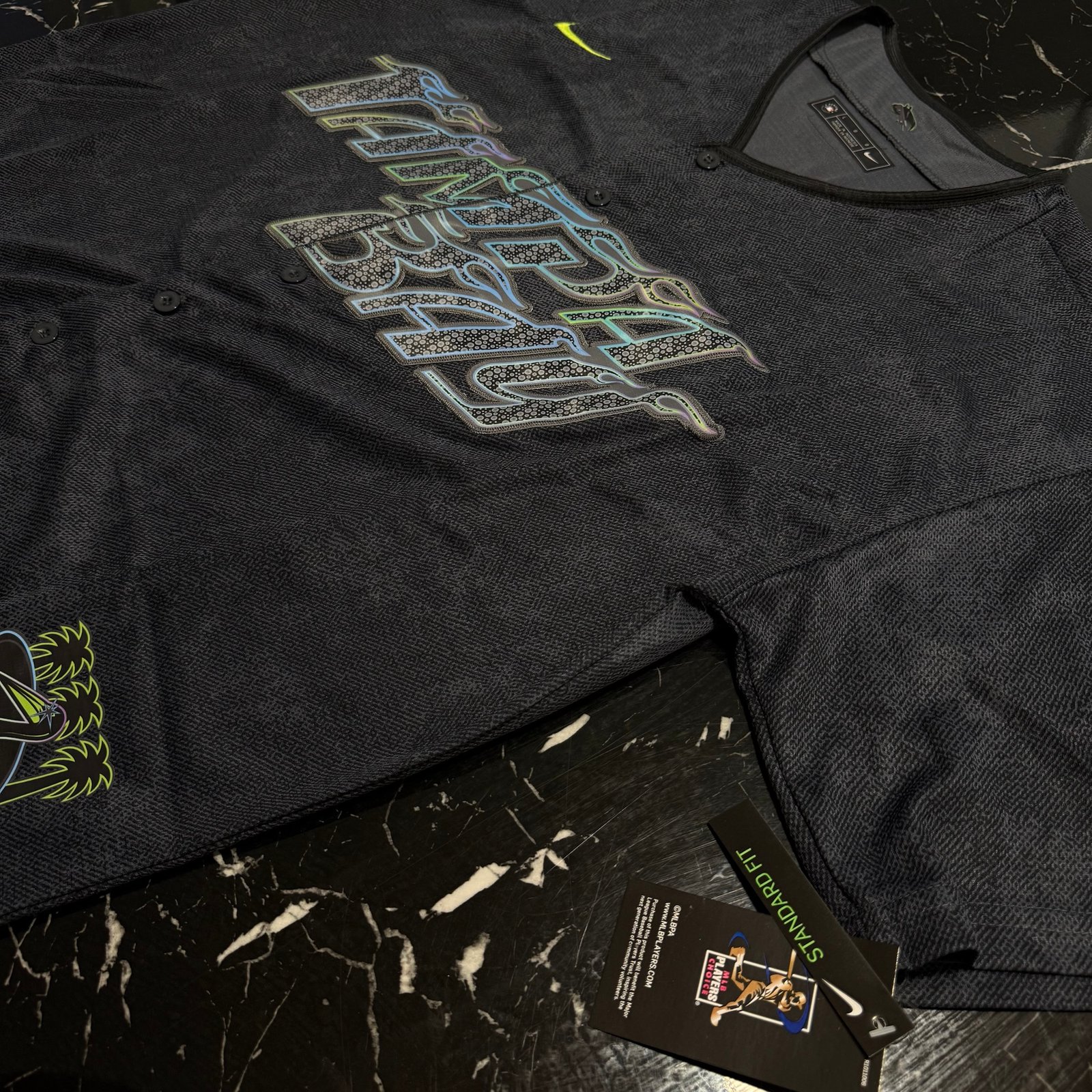 El diseño presenta una base charcoal grey (gris oscuro) con detalles vibrantes que reinterpretan la estética urbana de la ciudad. Es una propuesta distinta al uniforme tradicional del equipo, combinando cultura local y béisbol contemporáneo.