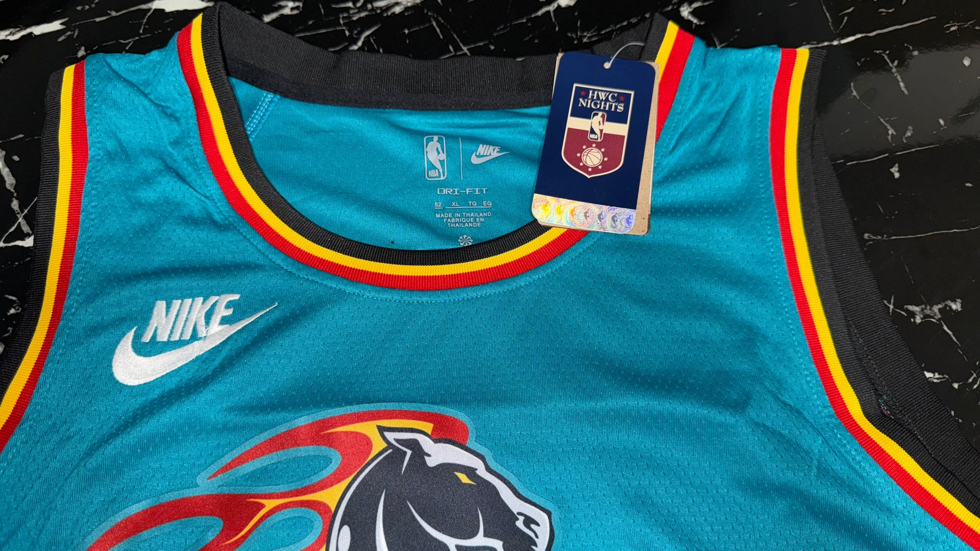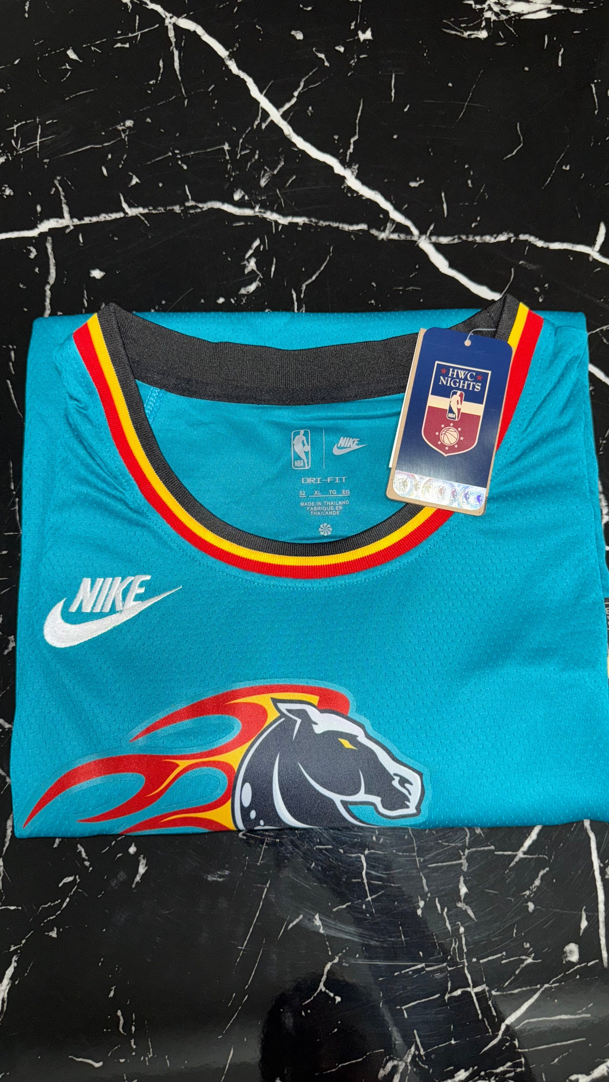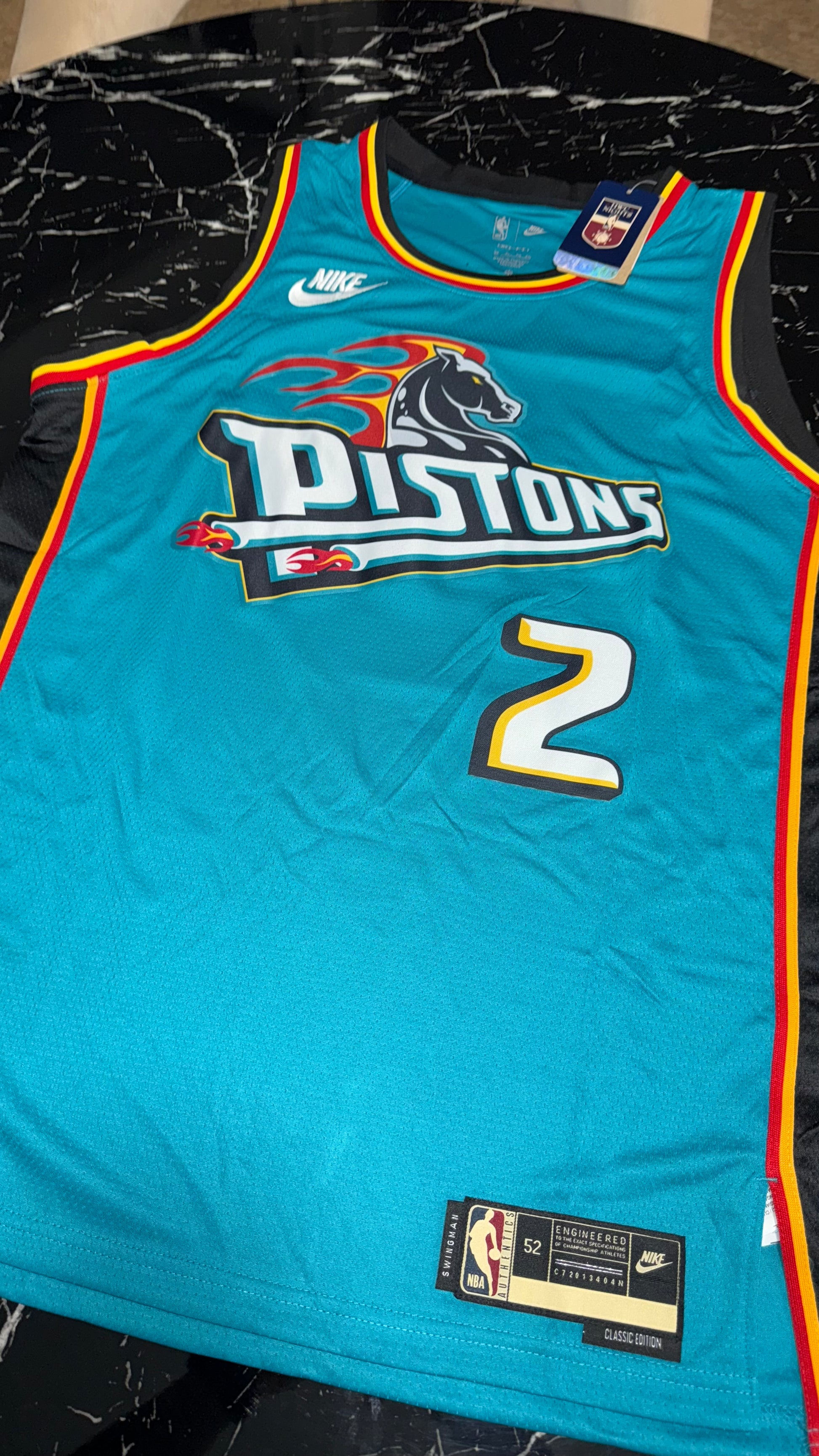 Camiseta retro de los Detroit Pistons NBA en su icónico diseño turquesa con bordes en rojo y negro y el clásico logo del caballo de fuego. Una prenda que revive el estilo único de finales de los 90 y que volvió como edición especial para los fanáticos de la franquicia.